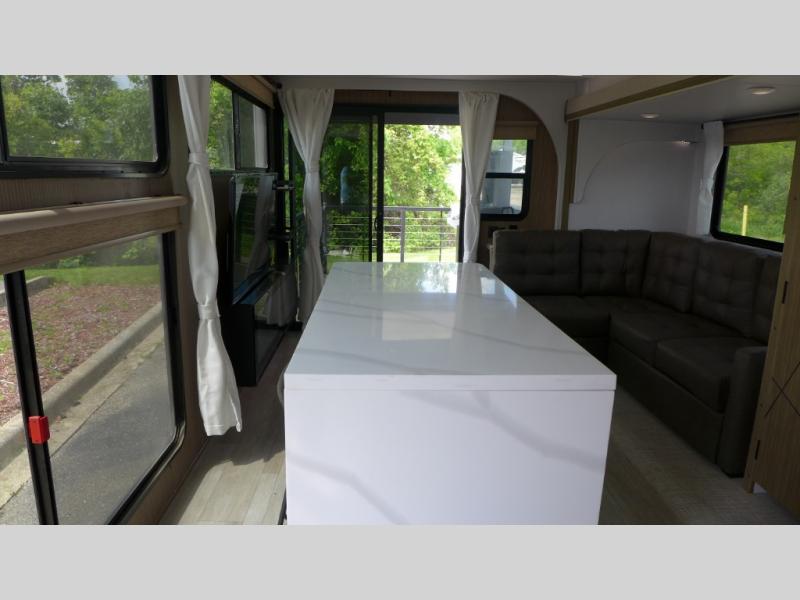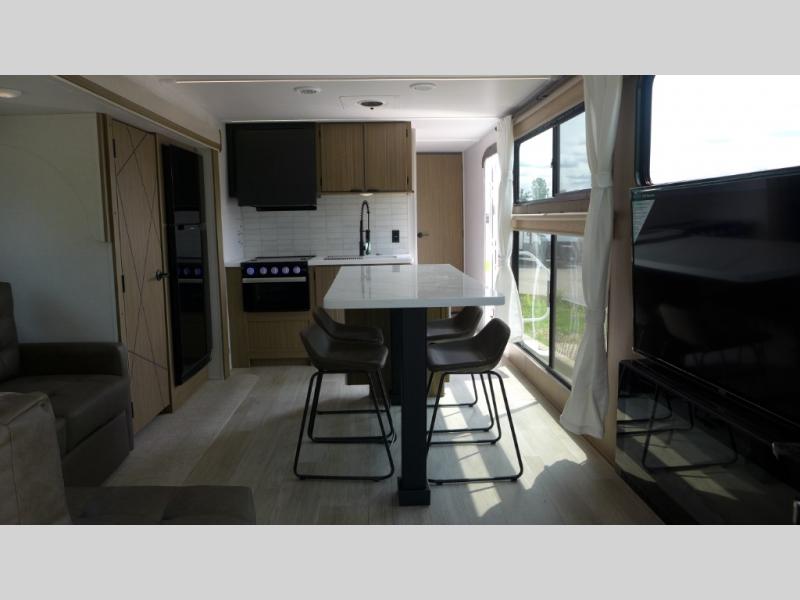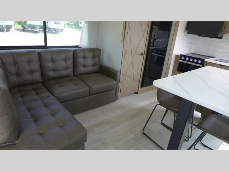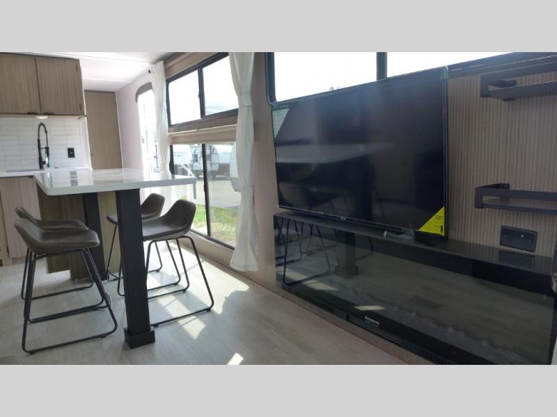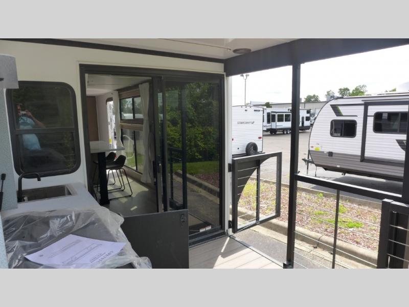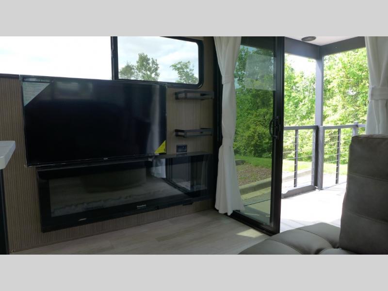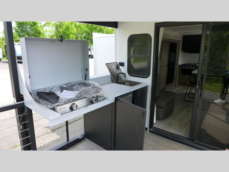 This travel trailer will feel more like home with its rear veranda/porch, dual entry doors, and front private bedroom! There is an outdoor kitchen on the back porch so you can make lunch in the fresh air, and the patio doors lead right into the main living area. Your crew can relax on the L-shaped sofa across from the fireplace, which will make your space more cozy. A kitchen island with four chairs will provide a place to dine at, and there is a spacious pantry and refrigerator for food storage. You will love having your own space in the private bedroom, and the Versa-Tilt custom king bed will let you sit up in bed to read your book at night.