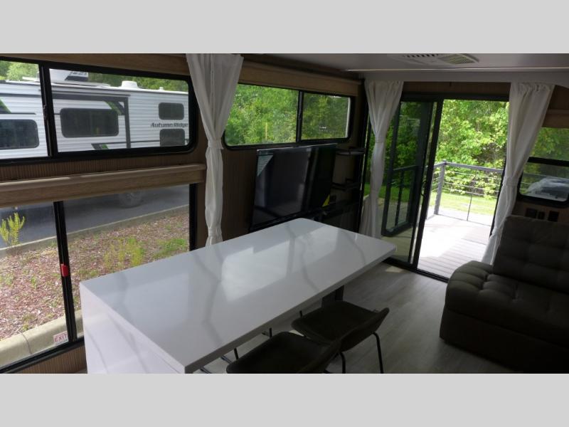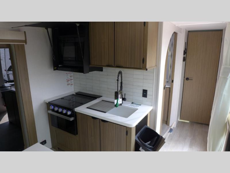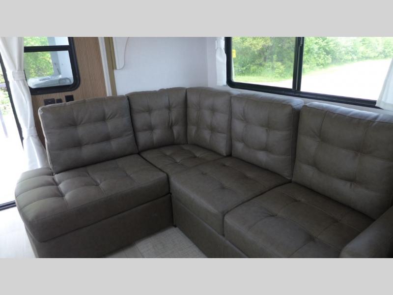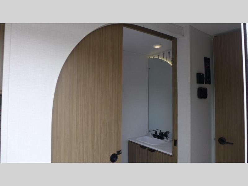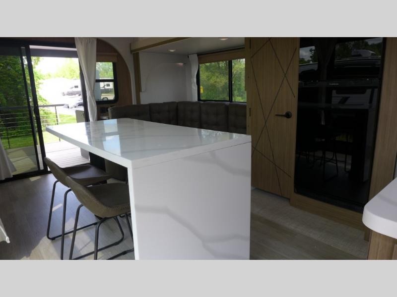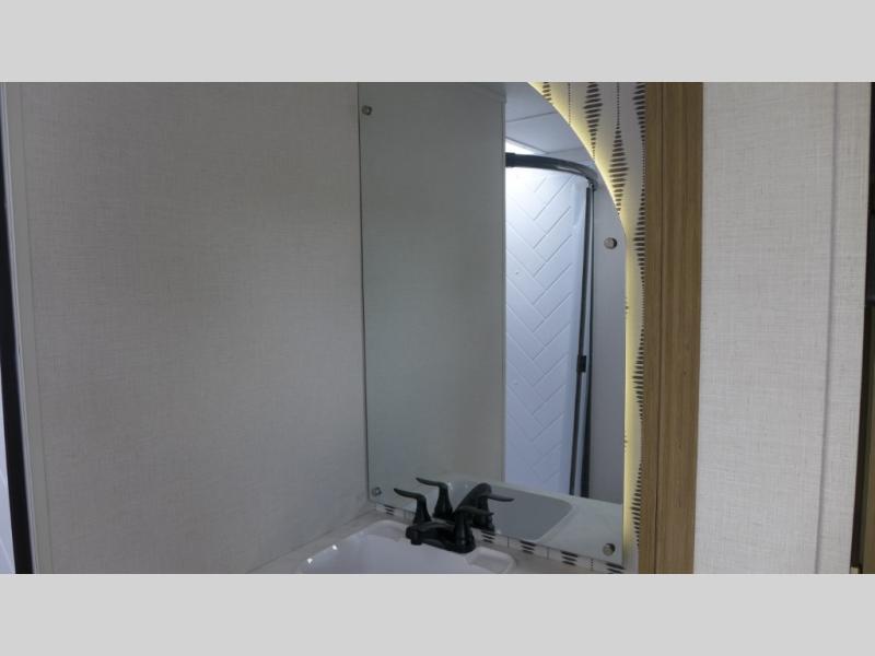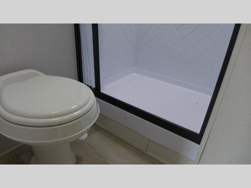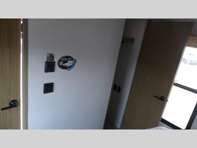 This travel trailer will feel more like home with its rear veranda/porch, dual entry doors, and front private bedroom! There is an outdoor kitchen on the back porch so you can make lunch in the fresh air, and the patio doors lead right into the main living area. Your crew can relax on the L-shaped sofa across from the fireplace, which will make your space more cozy. A kitchen island with four chairs will provide a place to dine at, and there is a spacious pantry and refrigerator for food storage. You will love having your own space in the private bedroom, and the Versa-Tilt custom king bed will let you sit up in bed to read your book at night.