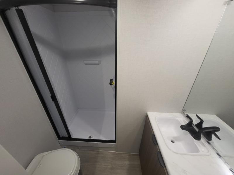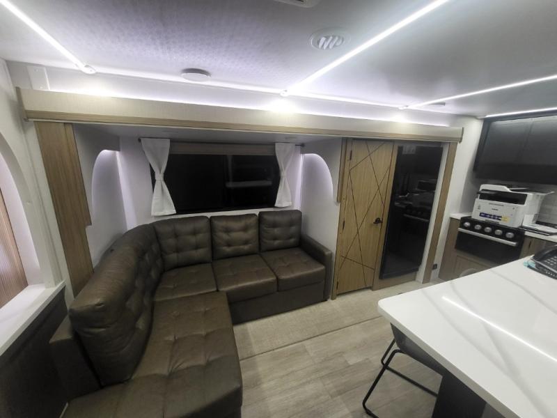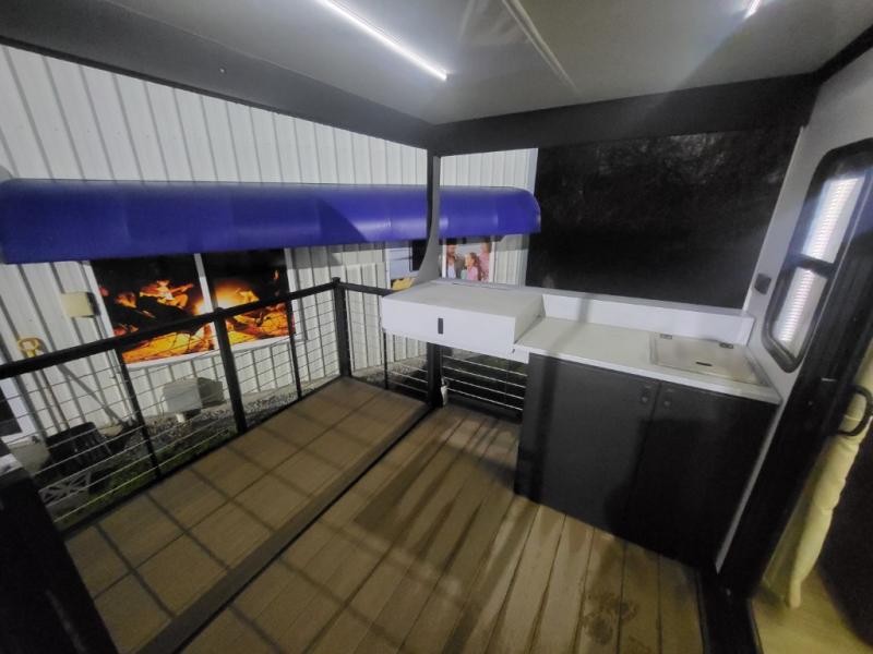 This travel trailer will feel more like home with its rear veranda/porch, dual entry doors, and front private bedroom! There is an outdoor kitchen on the back porch so you can make lunch in the fresh air, and the patio doors lead right into the main living area. Your crew can relax on the L-shaped sofa across from the fireplace, which will make your space more cozy. A kitchen island with four chairs will provide a place to dine at, and there is a spacious pantry and refrigerator for food storage. You will love having your own space in the private bedroom, and the Versa-Tilt custom king bed will let you sit up in bed to read your book at night.