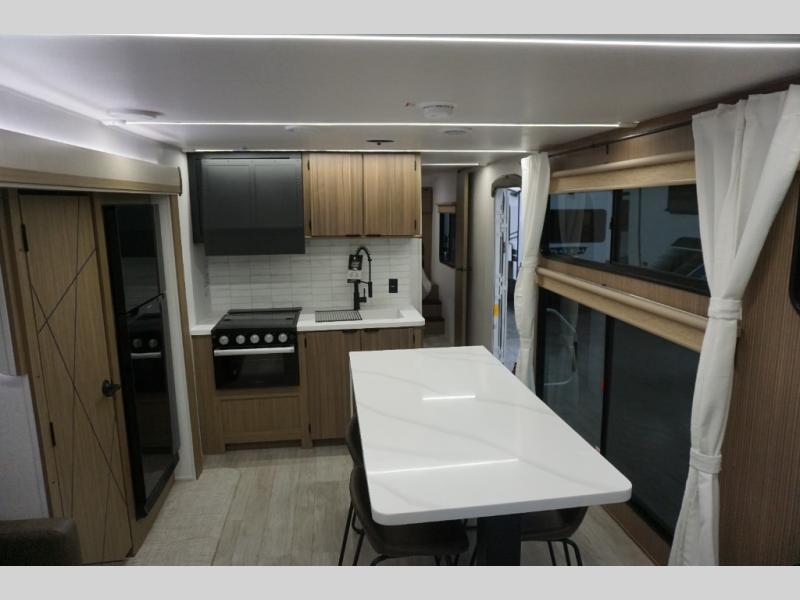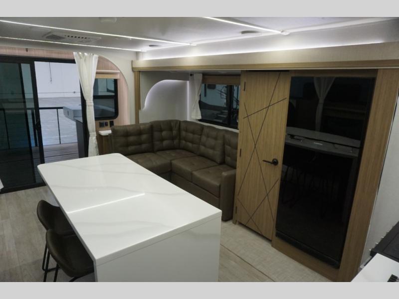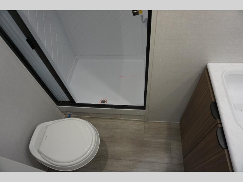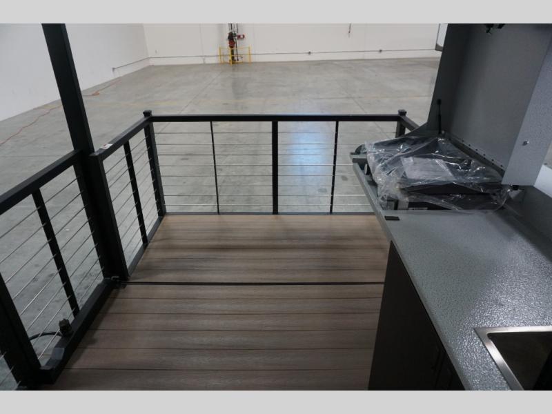 This travel trailer will feel more like home with its rear veranda/porch, dual entry doors, and front private bedroom! There is an outdoor kitchen on the back porch so you can make lunch in the fresh air, and the patio doors lead right into the main living area. Your crew can relax on the L-shaped sofa across from the fireplace, which will make your space more cozy. A kitchen island with four chairs will provide a place to dine at, and there is a spacious pantry and refrigerator for food storage. You will love having your own space in the private bedroom, and the Versa-Tilt custom king bed will let you sit up in bed to read your book at night.