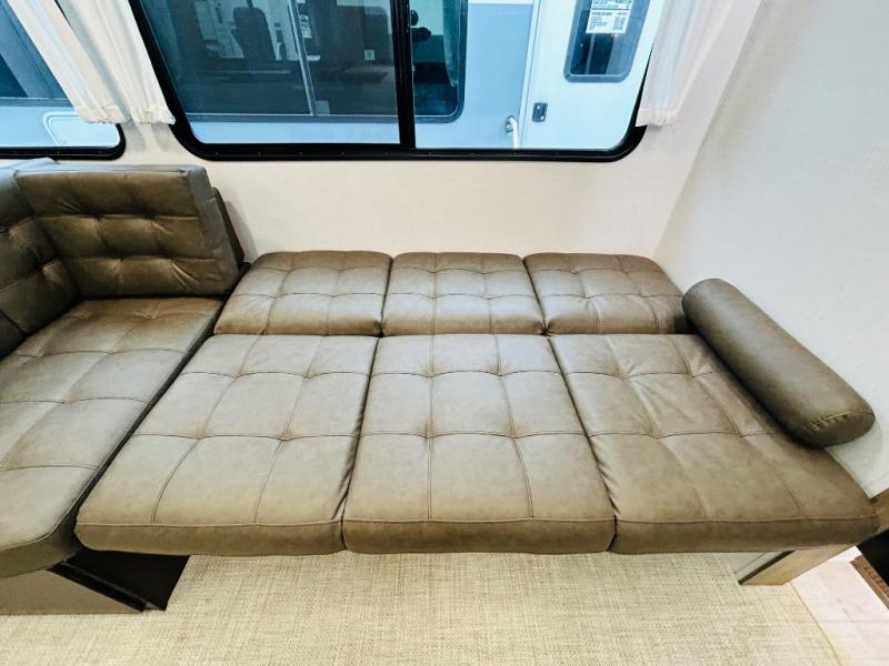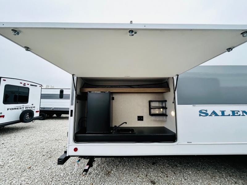 It's time to check out this exciting and full-featured Salem Platinum travel trailer! This unit provides two separated sleeping spaces; a rear private bunkhouse and a front private bedroom. Another feature that is just as helpful as the one in your own home is the kitchen. With an 11 cu. ft. frost free refrigerator, a three burner cooktop, a double sink, and abundant cabinet storage, you will be able to create delicious meals for the entire family. Plus, if you prefer to have a sunrise breakfast, you can simply take your preparations outside to the outdoor kitchen!