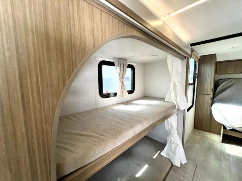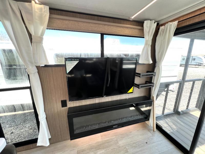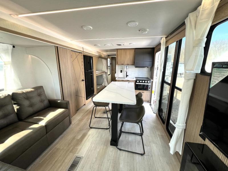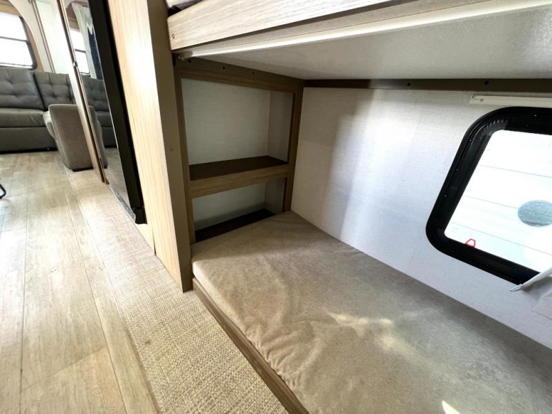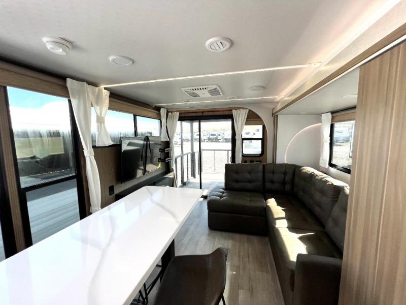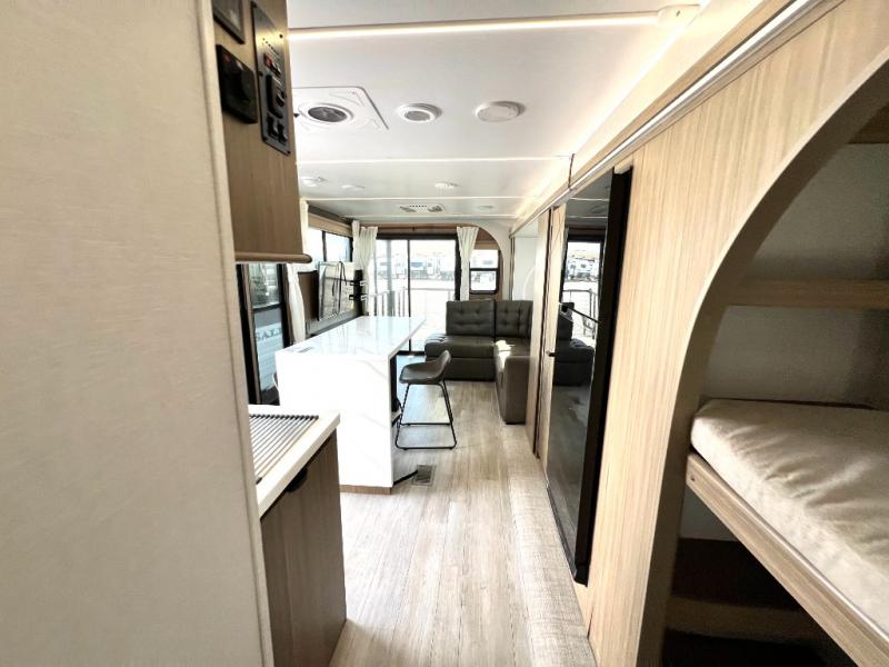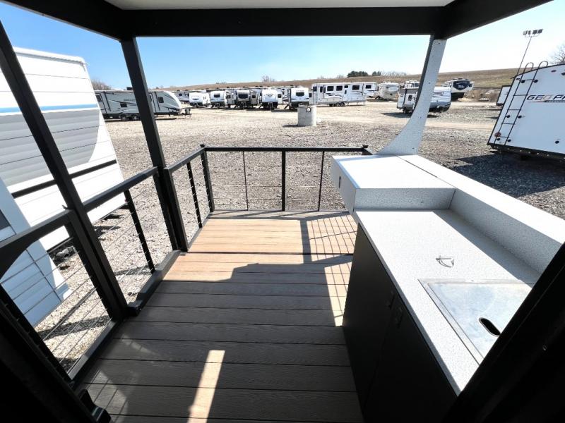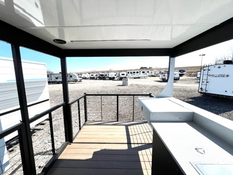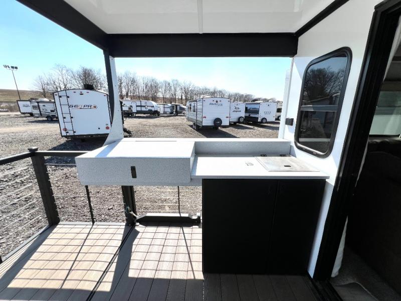 This travel trailer will feel more like home with its rear veranda/porch, dual entry doors, and front private bedroom! There is an outdoor kitchen on the back porch so you can make lunch in the fresh air, and the patio doors lead right into the main living area. Your crew can relax on the L-shaped sofa across from the fireplace, which will make your space more cozy. You will love having your own space in the private bedroom, and the Versa-Tilt custom king bed will let you sit up in bed to read your book at night, while your guests take the bunk beds within the large slide out!