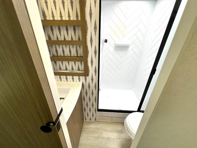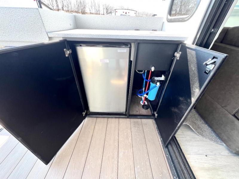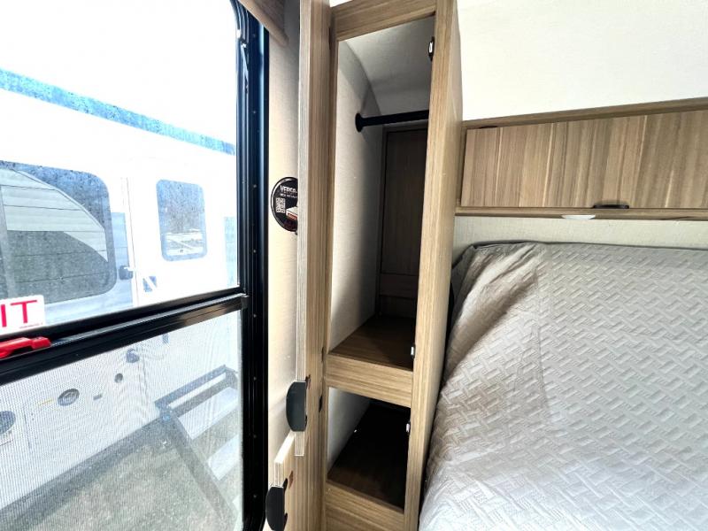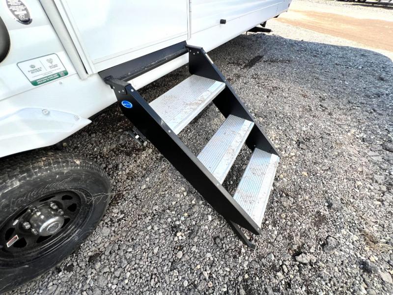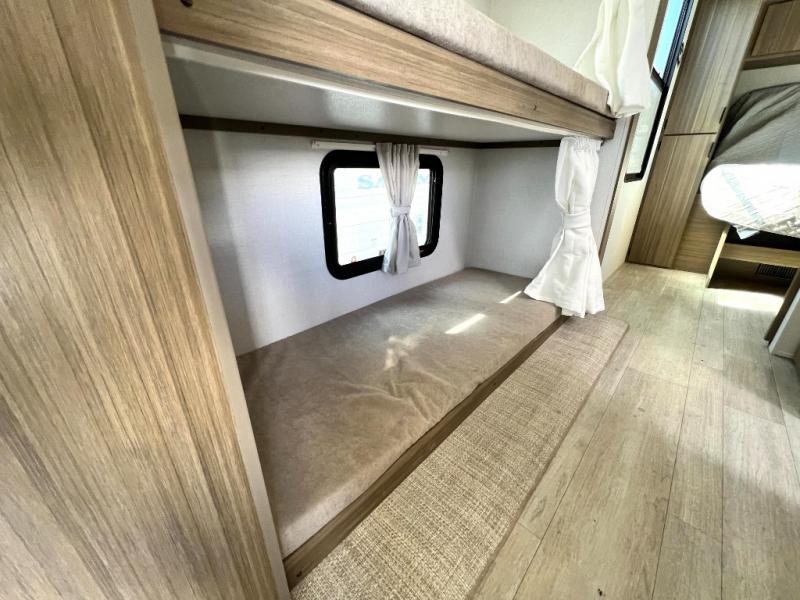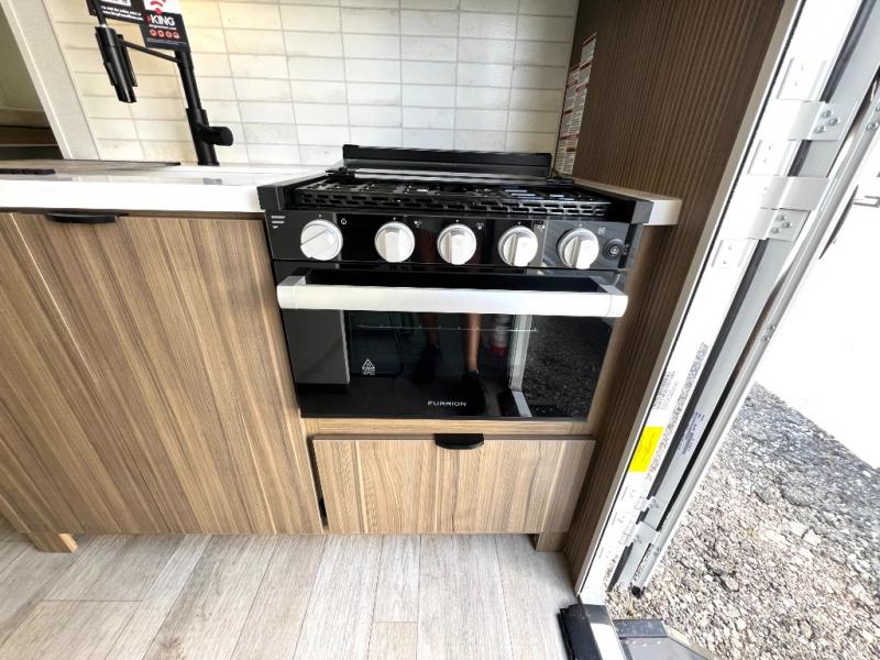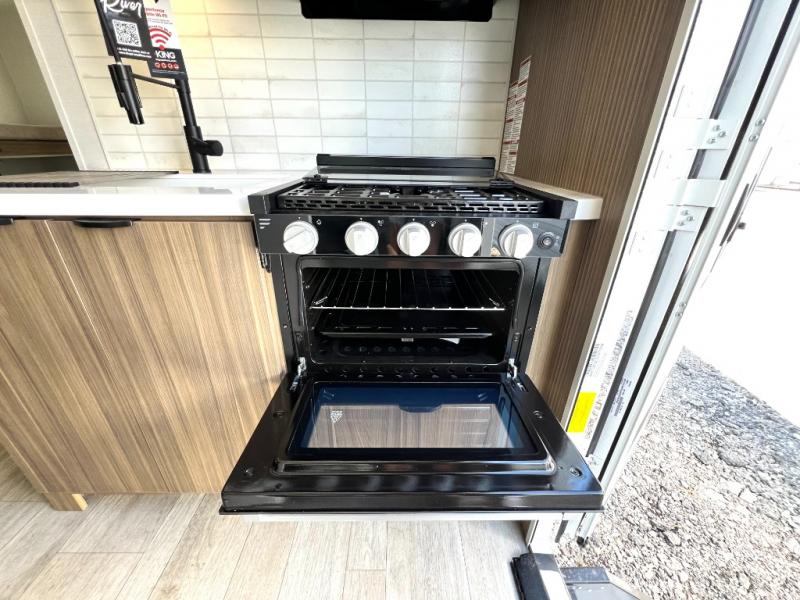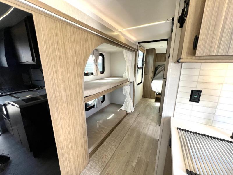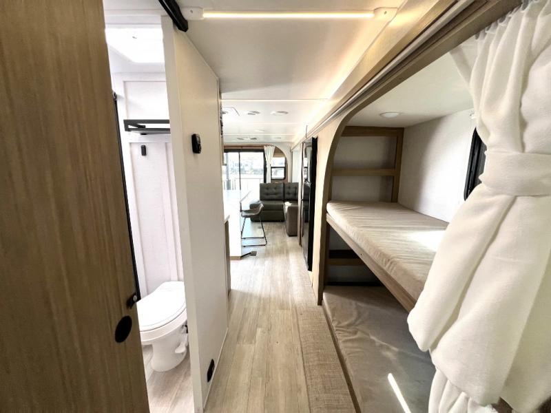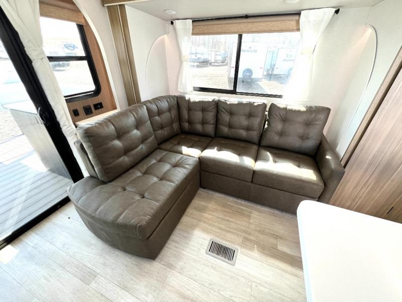 This travel trailer will feel more like home with its rear veranda/porch, dual entry doors, and front private bedroom! There is an outdoor kitchen on the back porch so you can make lunch in the fresh air, and the patio doors lead right into the main living area. Your crew can relax on the L-shaped sofa across from the fireplace, which will make your space more cozy. You will love having your own space in the private bedroom, and the Versa-Tilt custom king bed will let you sit up in bed to read your book at night, while your guests take the bunk beds within the large slide out!