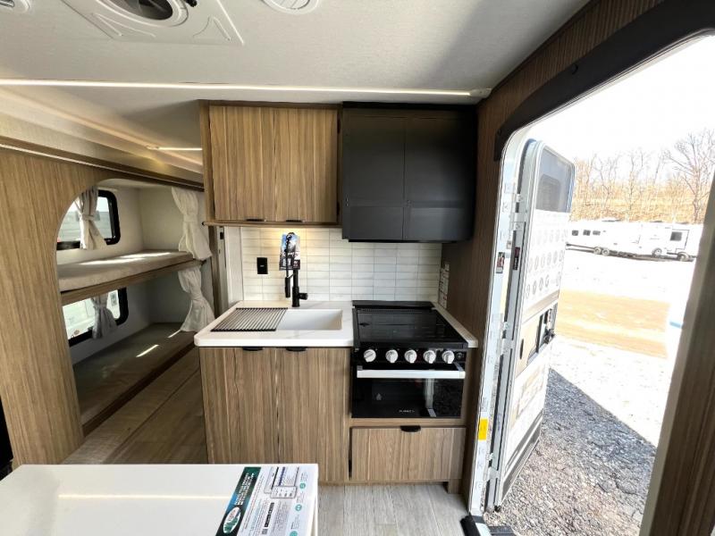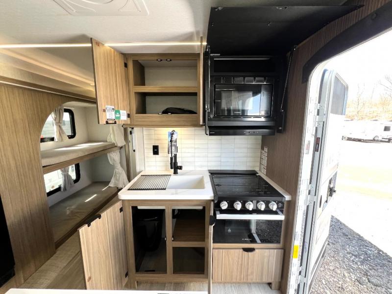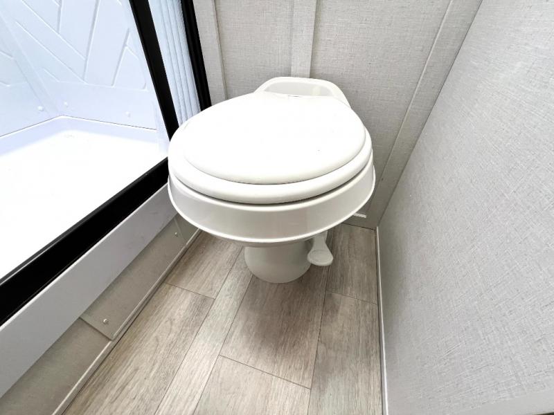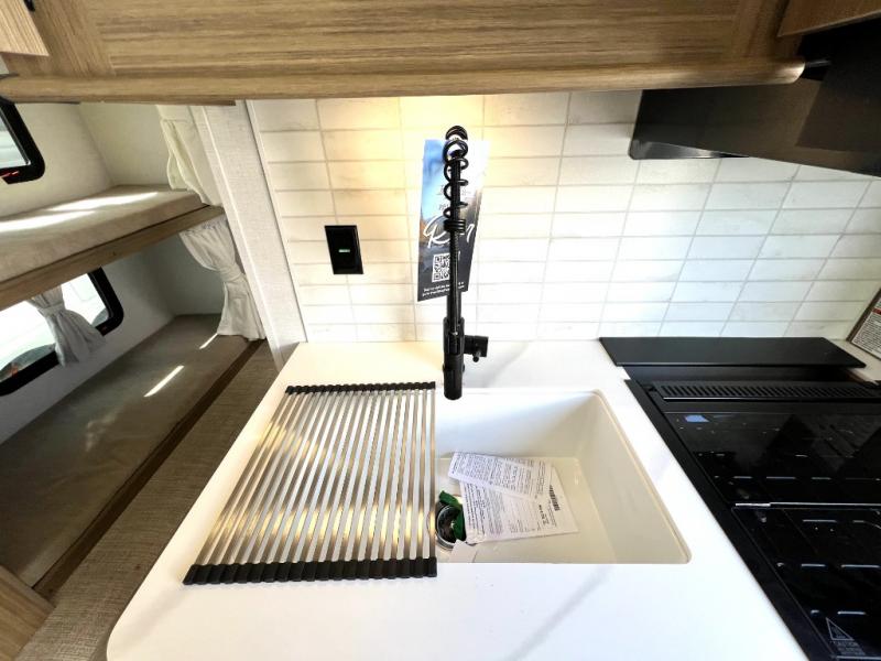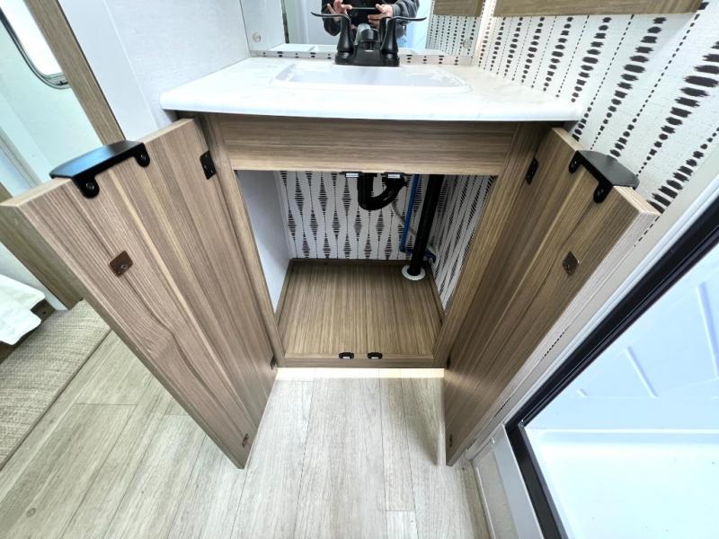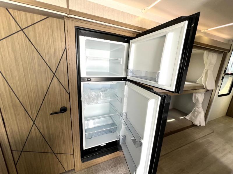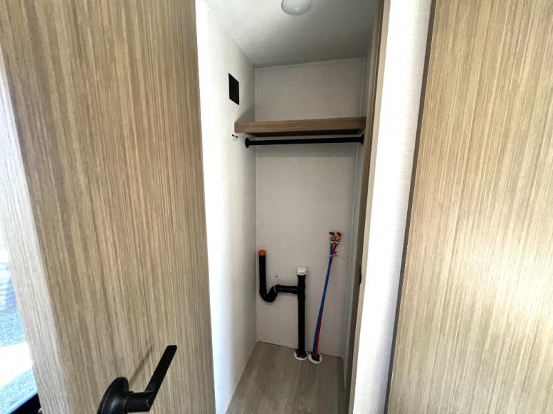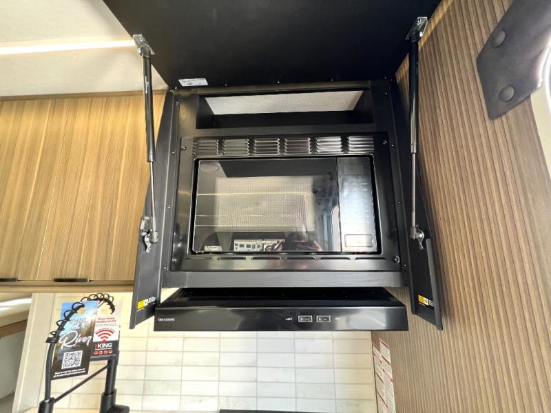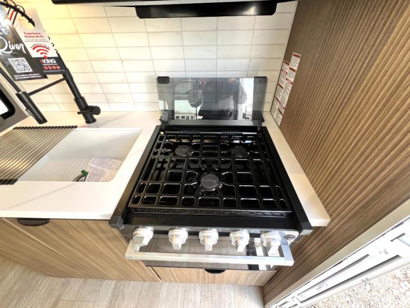 This travel trailer will feel more like home with its rear veranda/porch, dual entry doors, and front private bedroom! There is an outdoor kitchen on the back porch so you can make lunch in the fresh air, and the patio doors lead right into the main living area. Your crew can relax on the L-shaped sofa across from the fireplace, which will make your space more cozy. You will love having your own space in the private bedroom, and the Versa-Tilt custom king bed will let you sit up in bed to read your book at night, while your guests take the bunk beds within the large slide out!