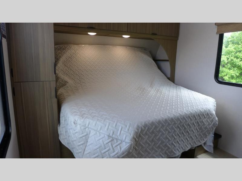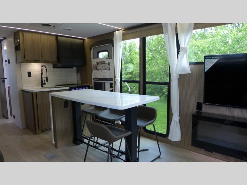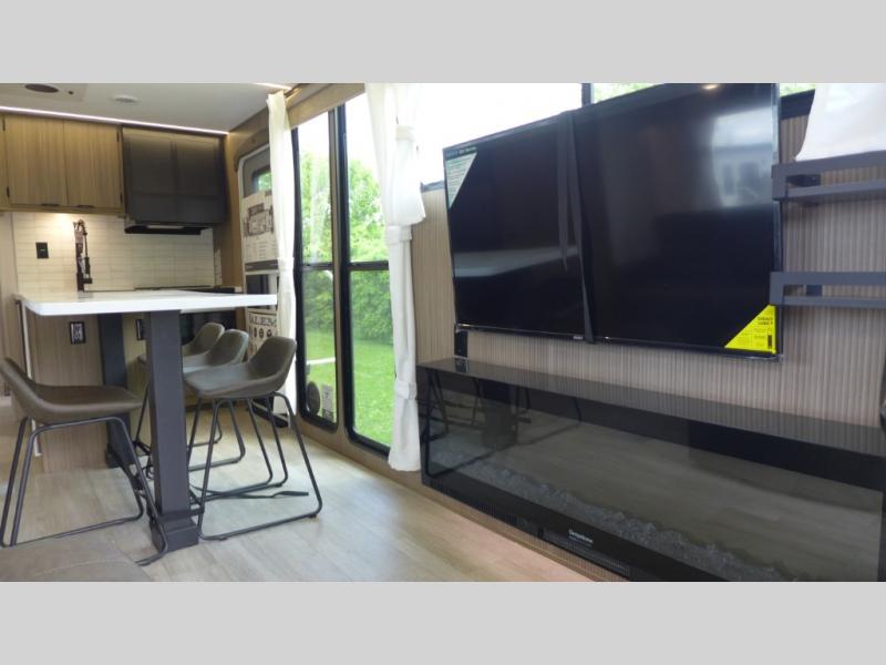 This travel trailer will feel more like home with its rear veranda/porch, dual entry doors, and front private bedroom! There is an outdoor kitchen on the back porch so you can make lunch in the fresh air, and the patio doors lead right into the main living area. Your crew can relax on the L-shaped sofa across from the fireplace, which will make your space more cozy. You will love having your own space in the private bedroom, and the Versa-Tilt custom king bed will let you sit up in bed to read your book at night, while your guests take the bunk beds within the large slide out!