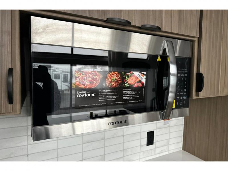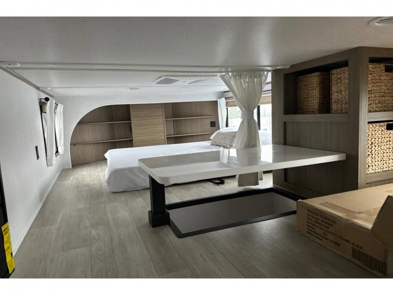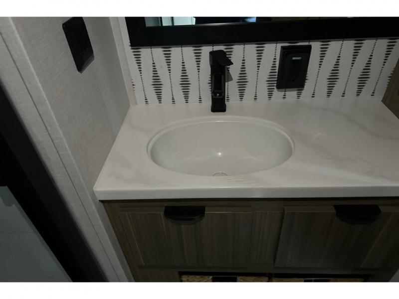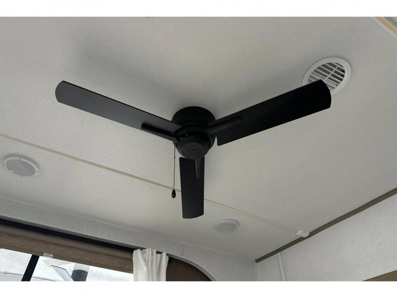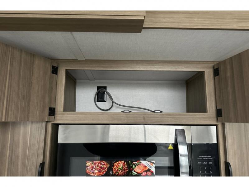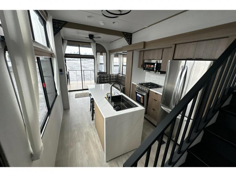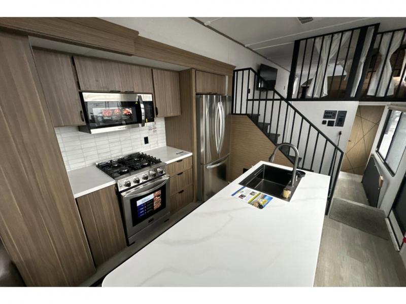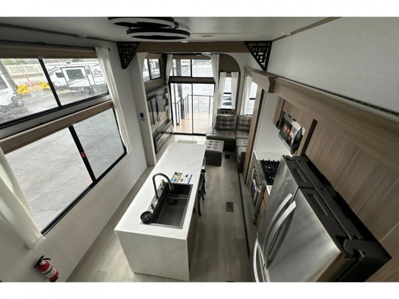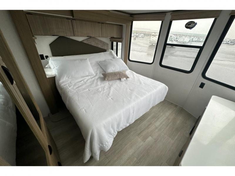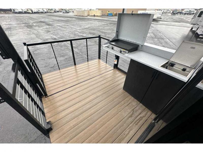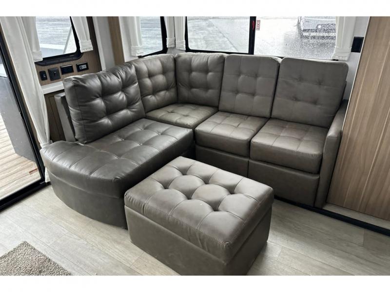 This travel trailer will feel more like home with its rear veranda/porch, dual entry doors, and front private bedroom! There is an outdoor kitchen on the back porch so you can make lunch in the fresh air, and the patio doors lead right into the main living area. Your crew can relax on the L-shaped sofa across from the fireplace, which will make your space more cozy. A kitchen island with four chairs will provide a place to dine at, and there is a spacious pantry and refrigerator for food storage. You will love having your own space in the private bedroom, and the Versa-Tilt custom king bed will let you sit up in bed to read your book at night.