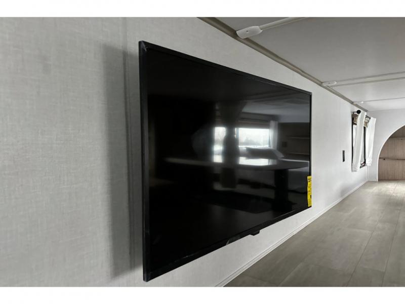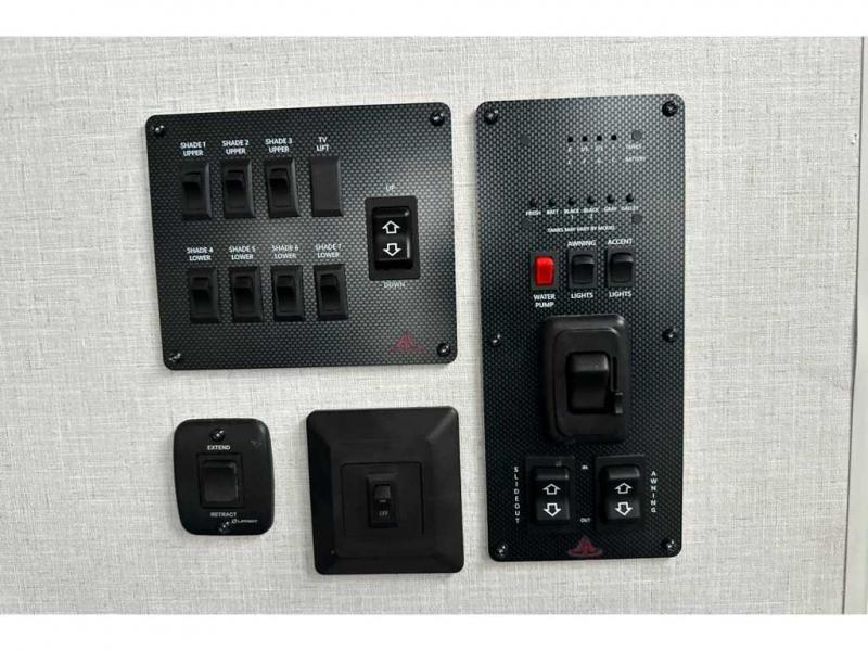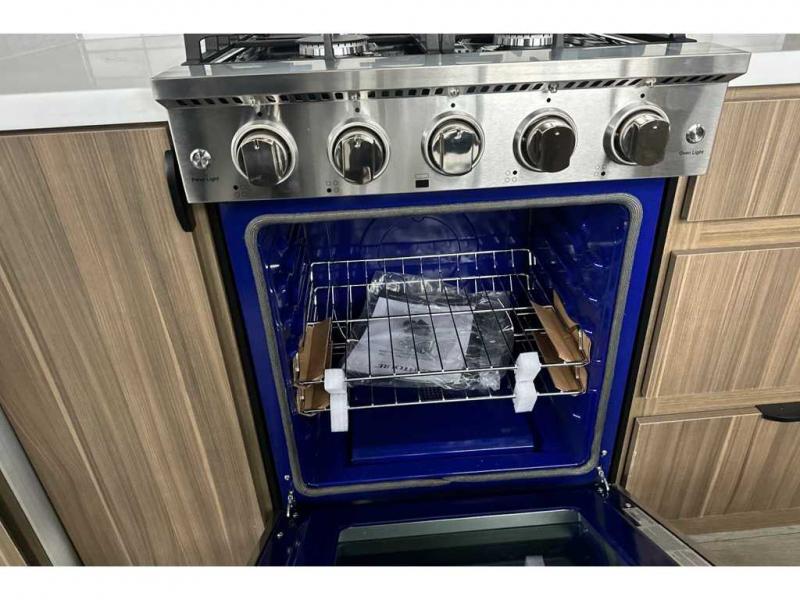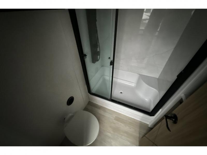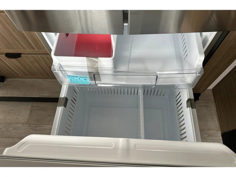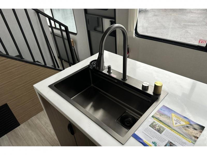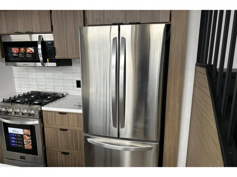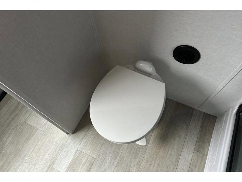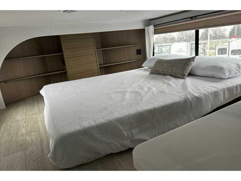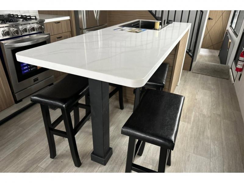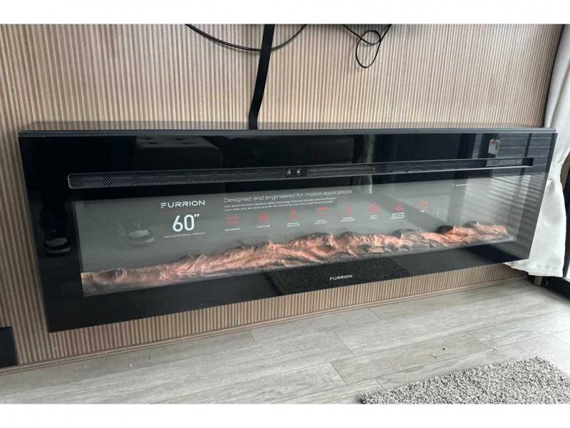 This travel trailer will feel more like home with its rear veranda/porch, dual entry doors, and front private bedroom! There is an outdoor kitchen on the back porch so you can make lunch in the fresh air, and the patio doors lead right into the main living area. Your crew can relax on the L-shaped sofa across from the fireplace, which will make your space more cozy. A kitchen island with four chairs will provide a place to dine at, and there is a spacious pantry and refrigerator for food storage. You will love having your own space in the private bedroom, and the Versa-Tilt custom king bed will let you sit up in bed to read your book at night.