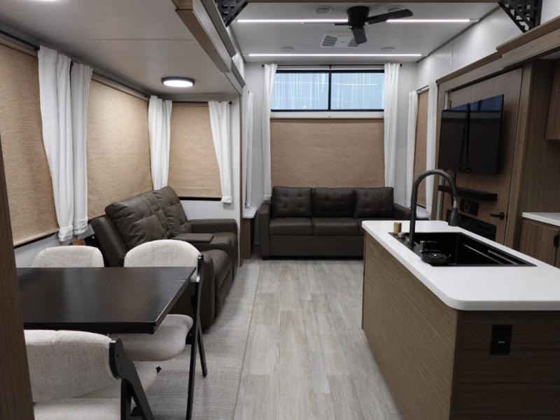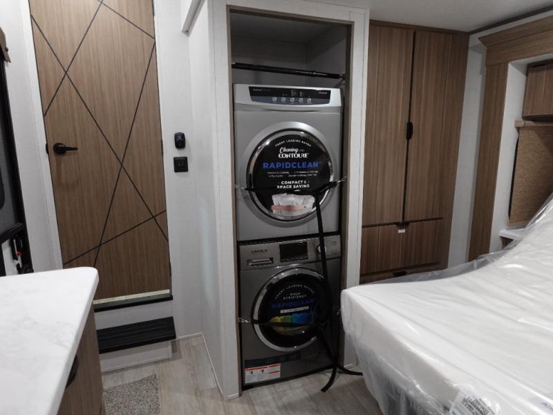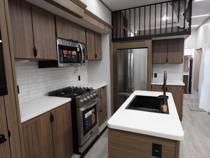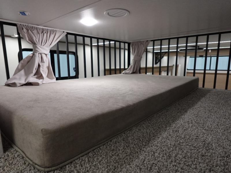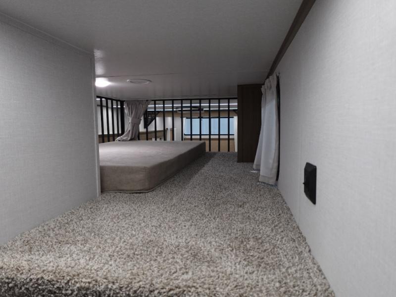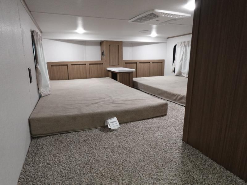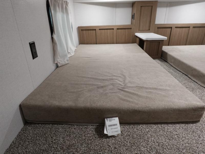 With a double loft in this destination trailer, everyone can join in on the fun! The kids will love having their own space with the two loft areas, one with two 42" x 74" bunk mats and storage area and the other with one 42" x 74" bunk mat and storage area. Plus, you will also have your own privacy with the front private bedroom which features a king bed with Versa-Tilt, front windows for plenty of sunlight to shine through, one of the entry doors, and a closet with washer and dryer. The full bathroom has a walk-in shower with a seat so everyone can stay clean and refreshed. The kitchen island will not only make your meal prep easier, but also your clean up with the Versa-Sink!