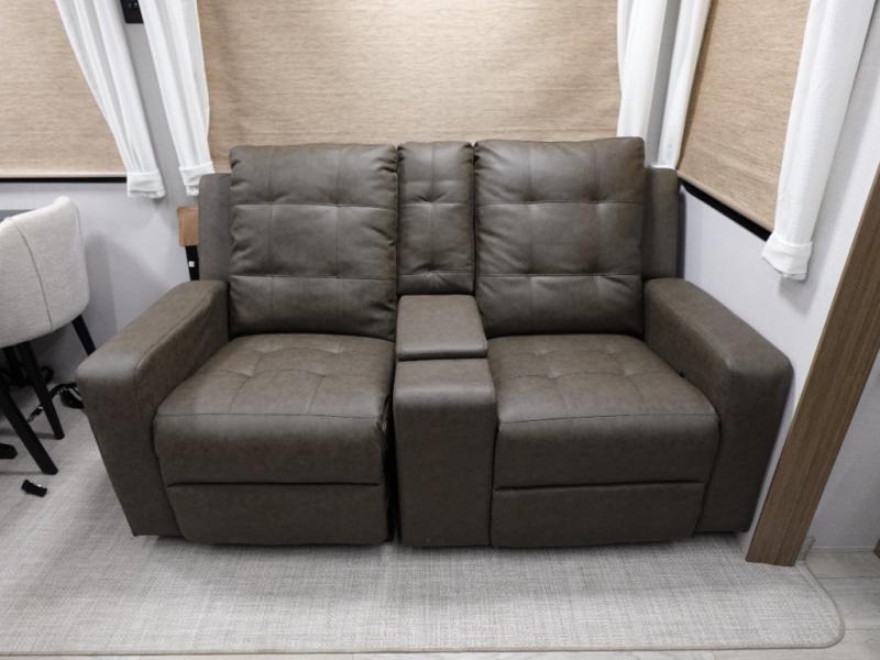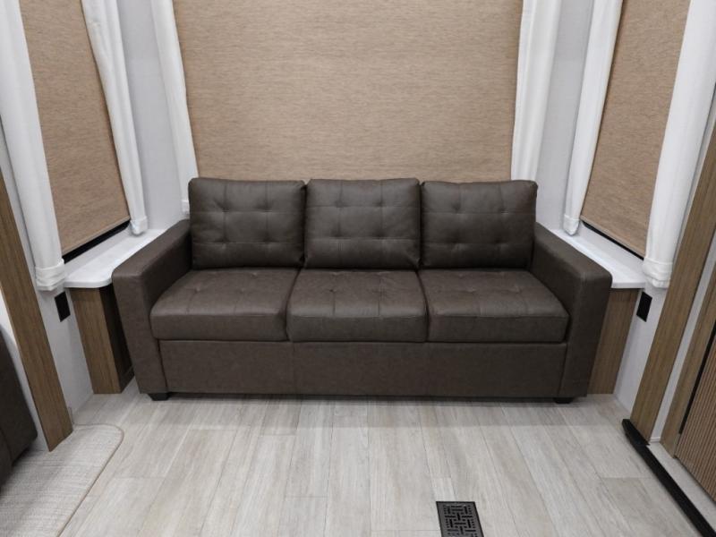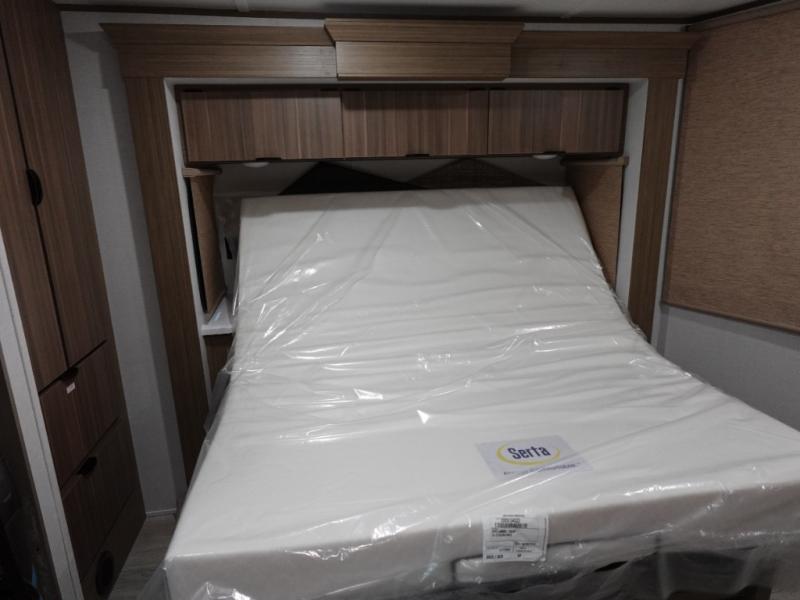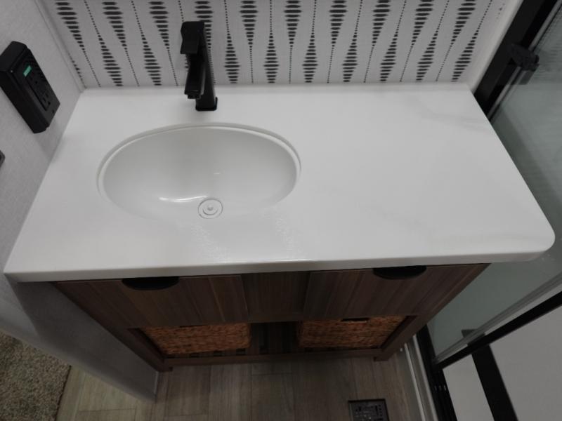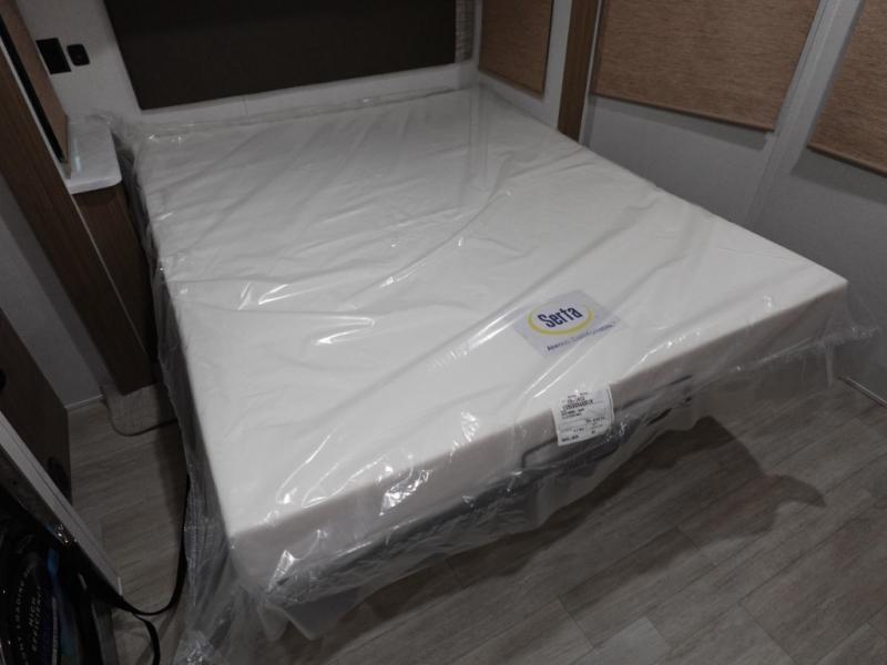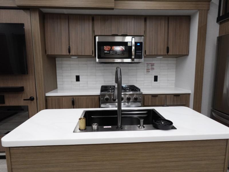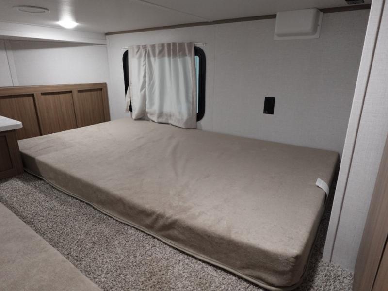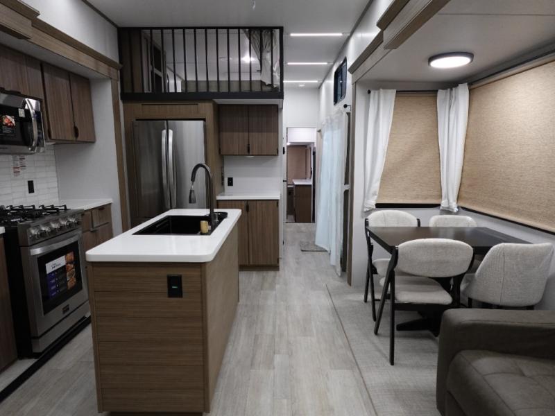 With a double loft in this destination trailer, everyone can join in on the fun! The kids will love having their own space with the two loft areas, one with two 42" x 74" bunk mats and storage area and the other with one 42" x 74" bunk mat and storage area. Plus, you will also have your own privacy with the front private bedroom which features a king bed with Versa-Tilt, front windows for plenty of sunlight to shine through, one of the entry doors, and a closet with washer and dryer. The full bathroom has a walk-in shower with a seat so everyone can stay clean and refreshed. The kitchen island will not only make your meal prep easier, but also your clean up with the Versa-Sink!
