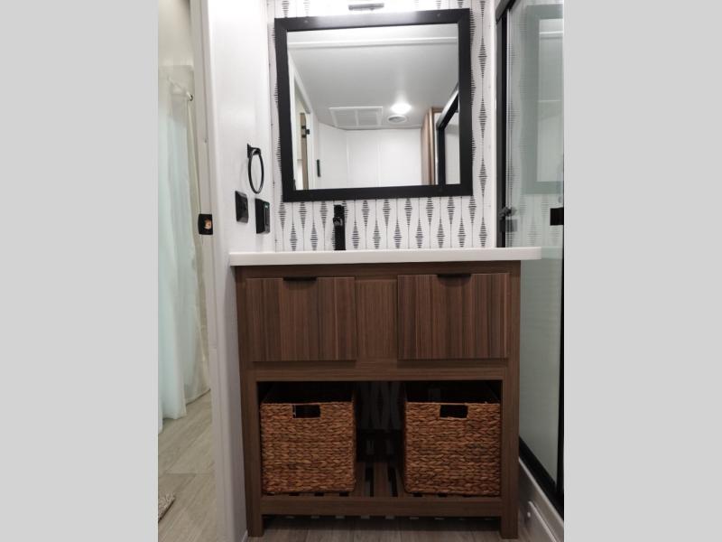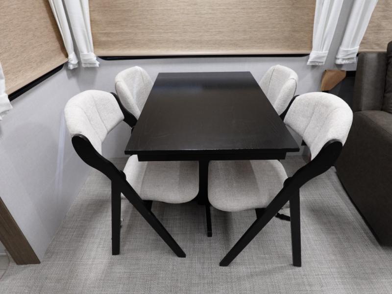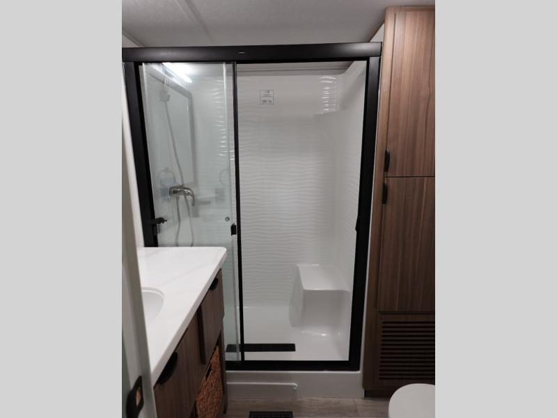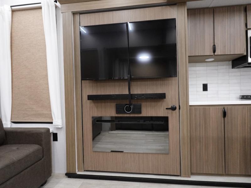 With any Salem Grand Villa destination trailer by Forest River, you can call home wherever you park it! There is a heated and enclosed Accessibelly for added protection in all seasons, LED "Blade Lighting" under the awning, Lippert On-The-Go ladder prep, plus many more exterior conveniences. Elegant curtain rods and curtains will have you feeling right at home, along with stainless steel kitchen appliances, stylish roller shades, and enhanced floating shelves for added storage. Each model includes a central vacuum with a sweep attachment to help keep your space tidy, a 60k on-demand tankless water heater for endless hot showers, a JBL 3-Zone media center, plus more.