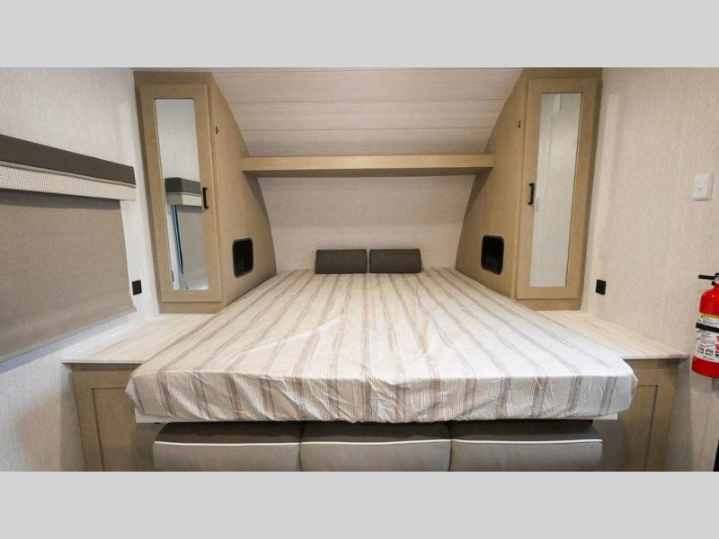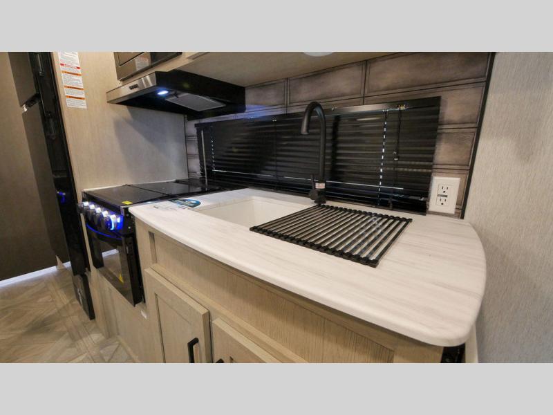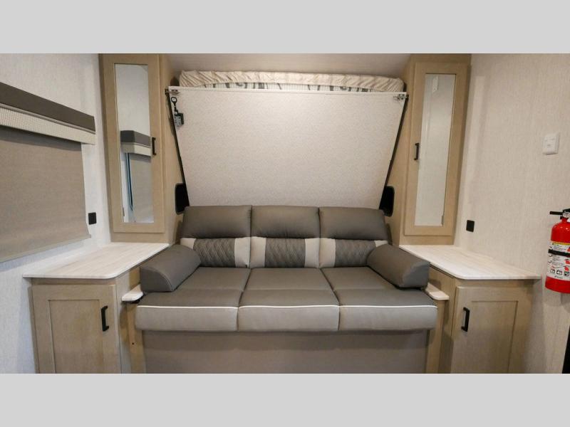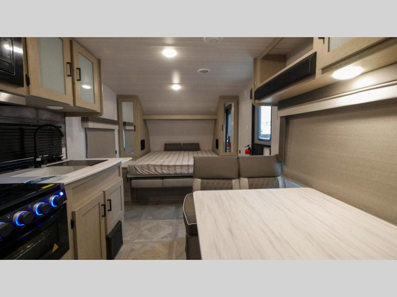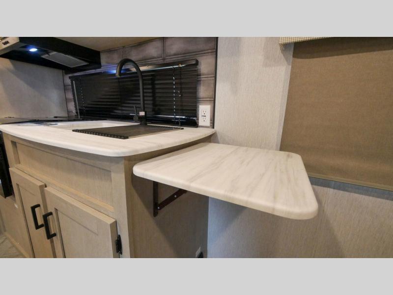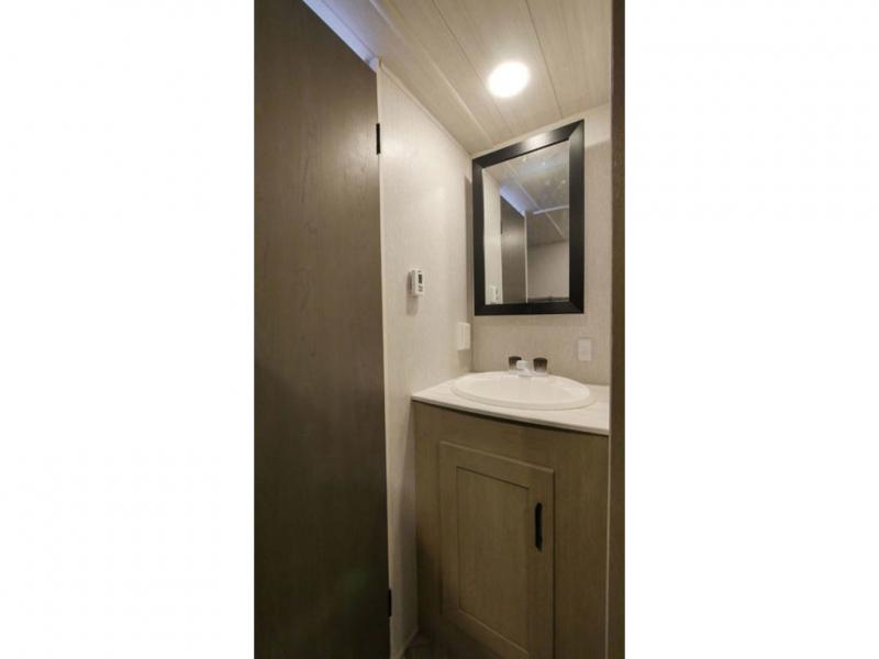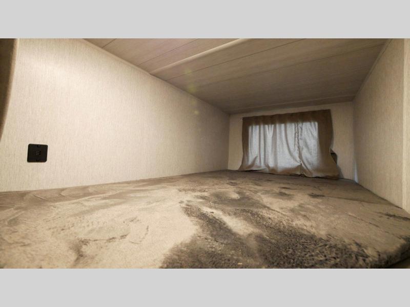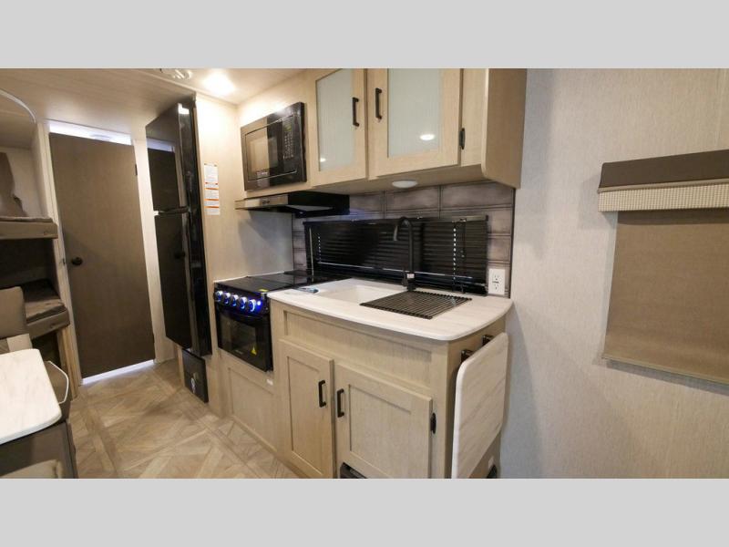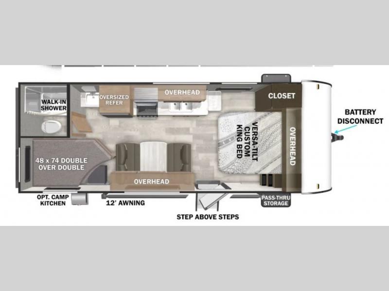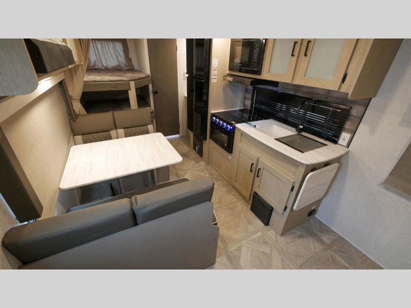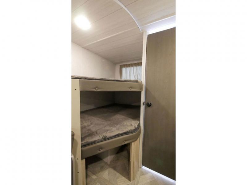 If you're looking for a bunkhouse travel trailer that weighs less than 5,000 lbs. then look no farther! Everyone can freshen up each morning in the rear corner bathroom with the walk-in shower with a skylight above for added natural lighting. The kids can sleep on the 48" x 74" double-size bunk beds and you can sleep on the front Versa-Tilt custom king bed. The booth dinette can also transform into an extra sleeping space when you're not using it to enjoy your meals or playing card games. You might even like to add the optional outside kitchen if you enjoy breakfast outdoors!
