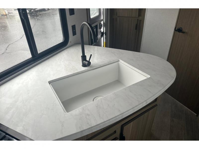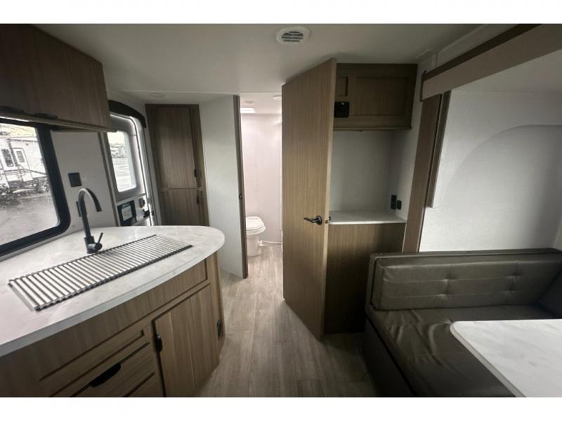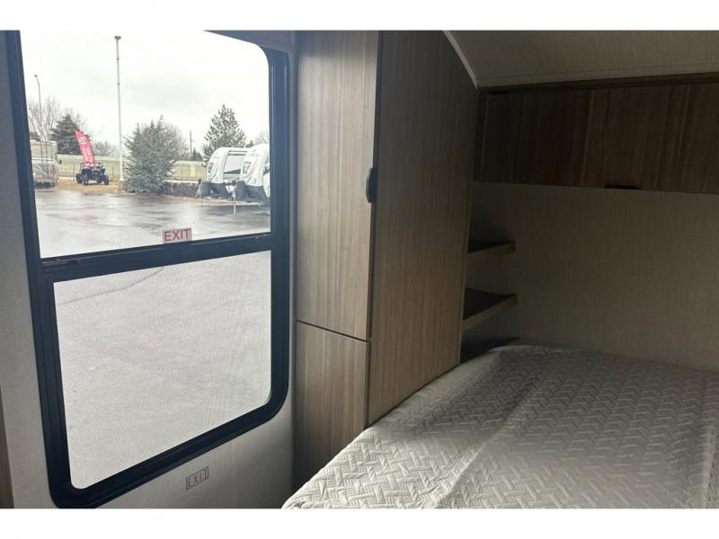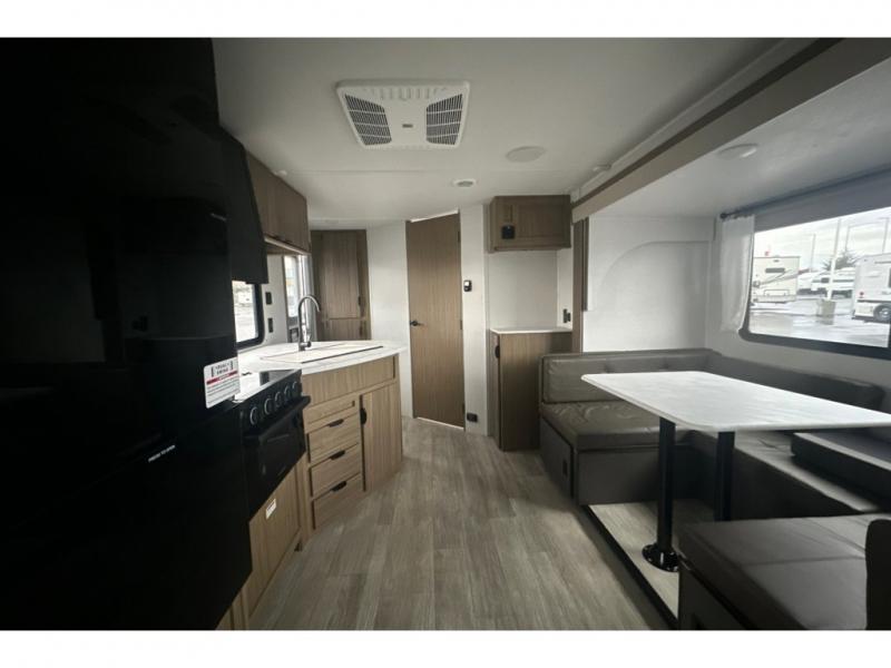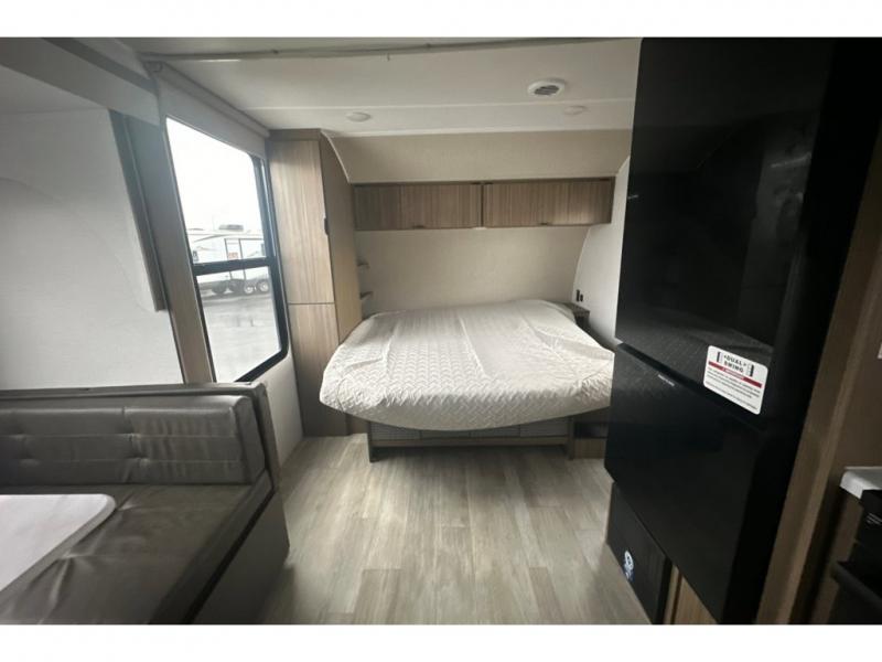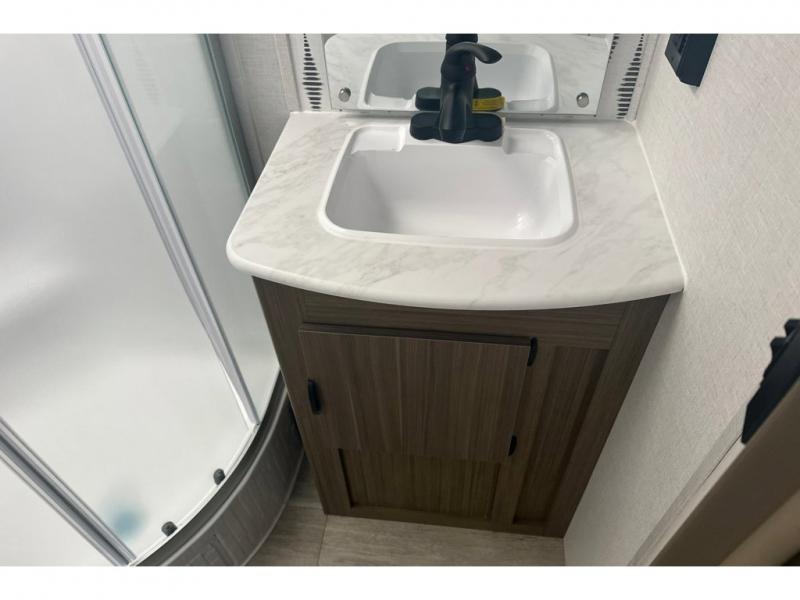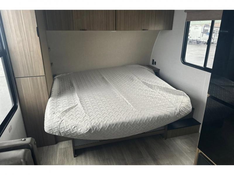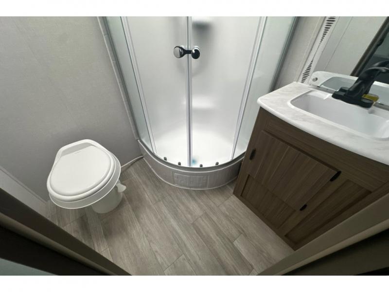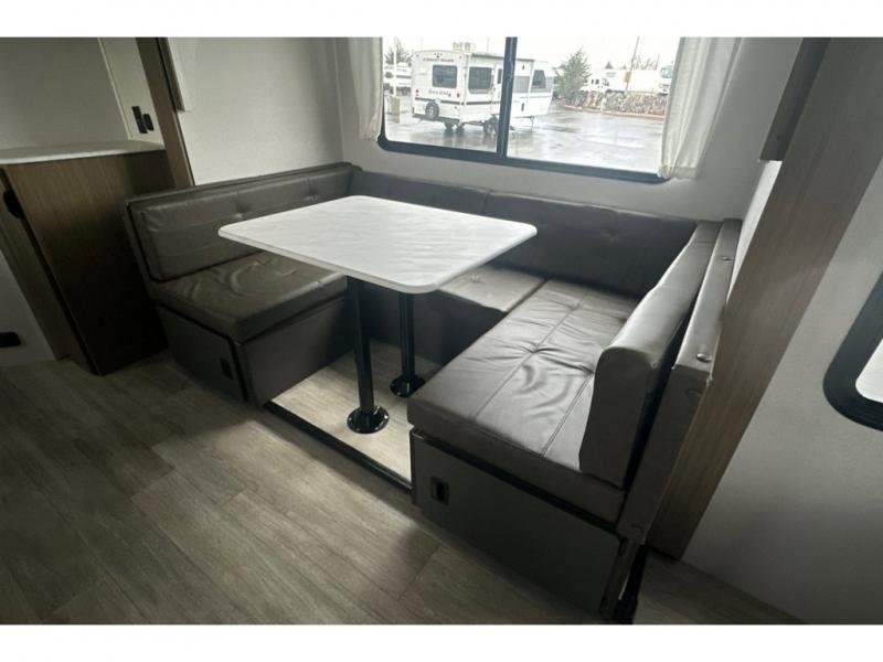 Pick your favorite campsite and load up this travel trailer for a fun weekend getaway! There is a wardrobe/pantry big enough to store your favorite snacks and a cooktop for you to create delicious home cooked meals. The U-shaped dinette slide is not only great for enjoying your meals at or playing card games, but also for transforming into an extra sleeping space. The rear corner bathroom has everything you will need to end each night feeling squeaky clean including a radius glass shower. The front custom king bed with Versa-Tilt welcomes you to enjoy a good night's rest, and the closets on either side of the bed will keep your clothes wrinkle-free!