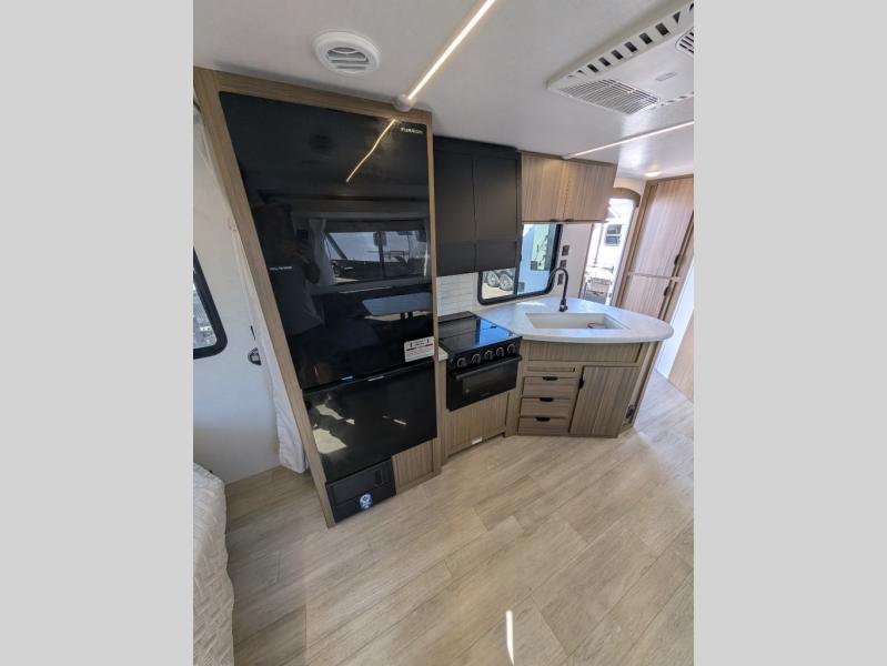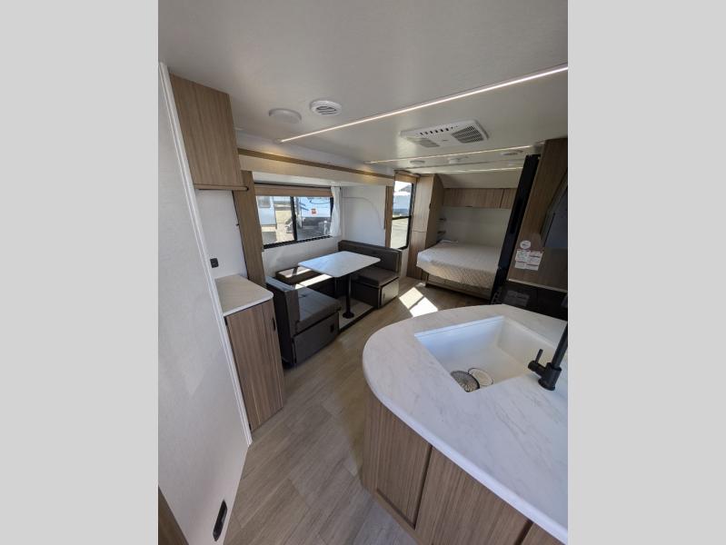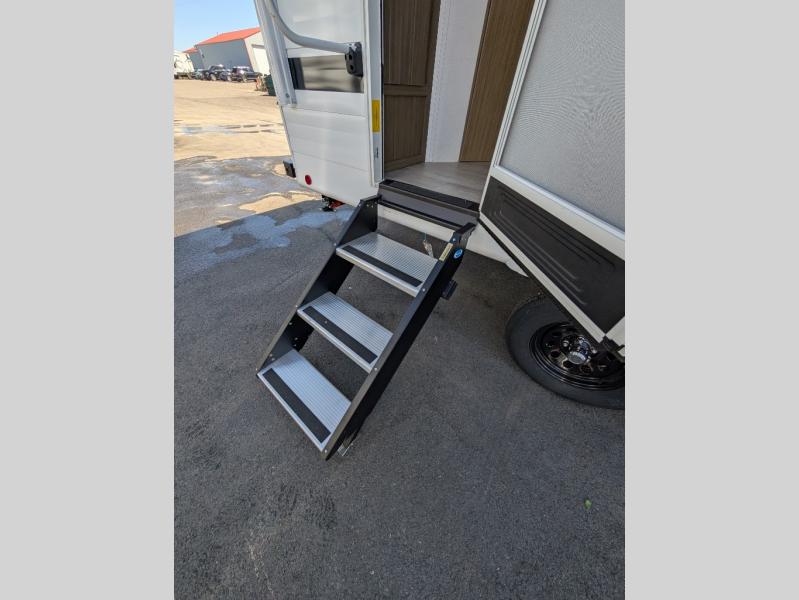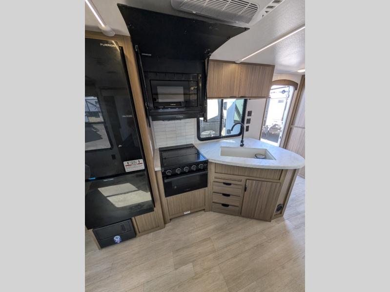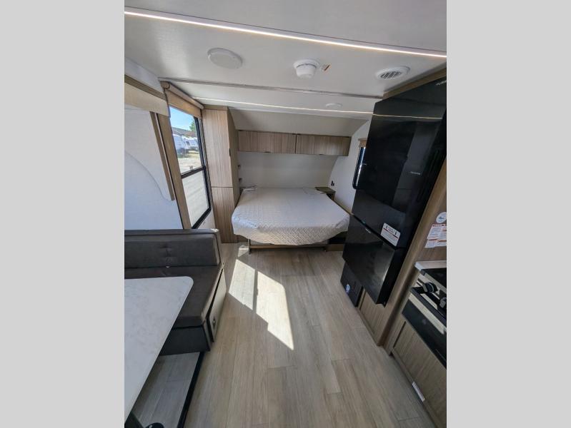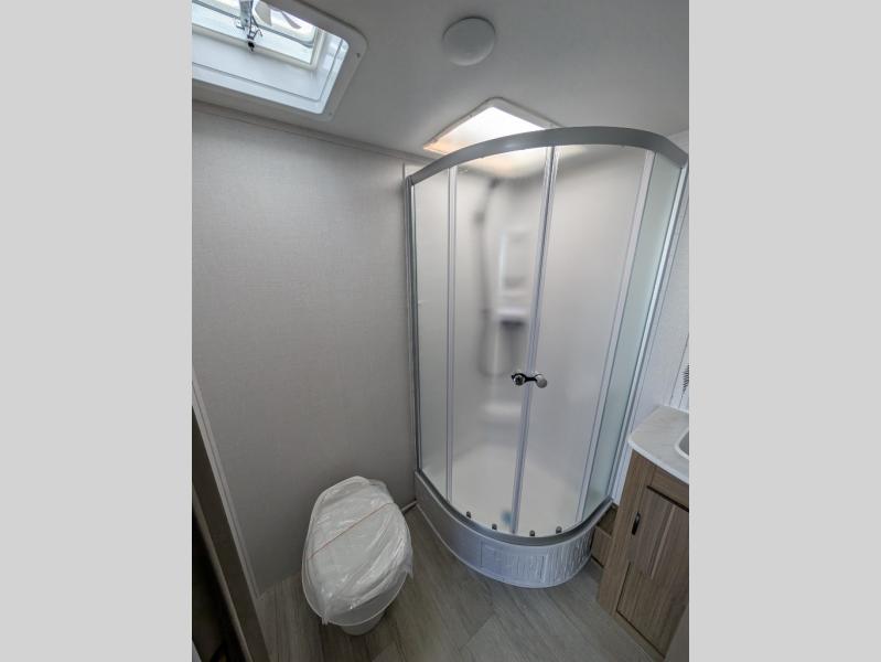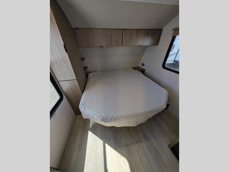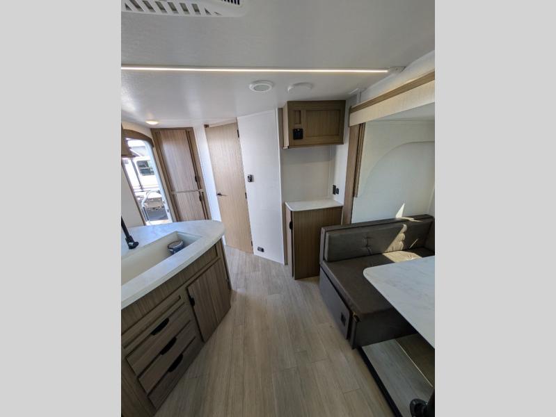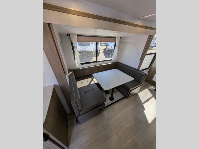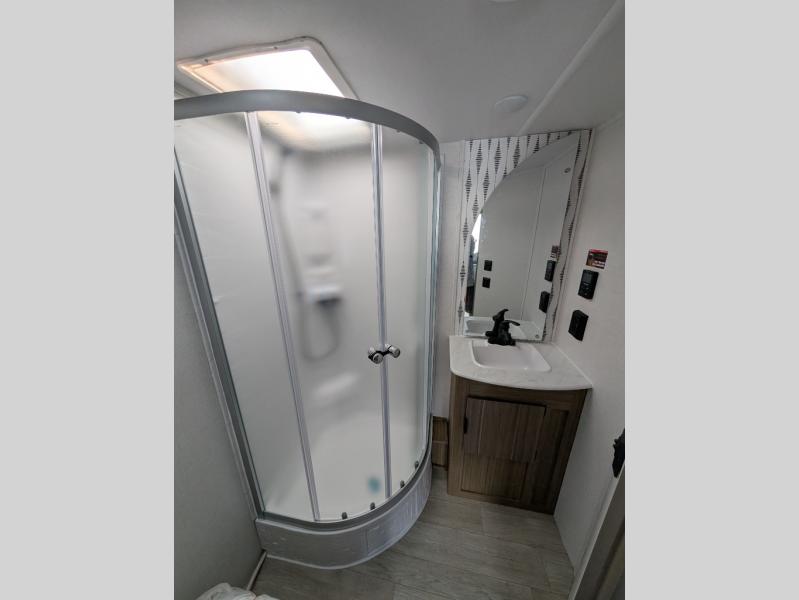 Pick your favorite campsite and load up this travel trailer for a fun weekend getaway! There is a wardrobe/pantry big enough to store your favorite snacks and a cooktop for you to create delicious home cooked meals. The U-shaped dinette slide is not only great for enjoying your meals at or playing card games, but also for transforming into an extra sleeping space. The rear corner bathroom has everything you will need to end each night feeling squeaky clean including a radius glass shower. The front custom king bed with Versa-Tilt welcomes you to enjoy a good night's rest, and the closets on either side of the bed will keep your clothes wrinkle-free!