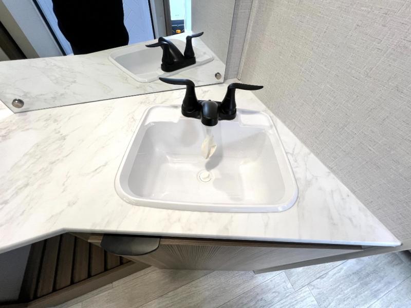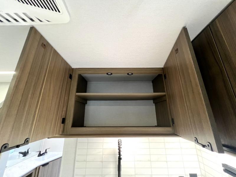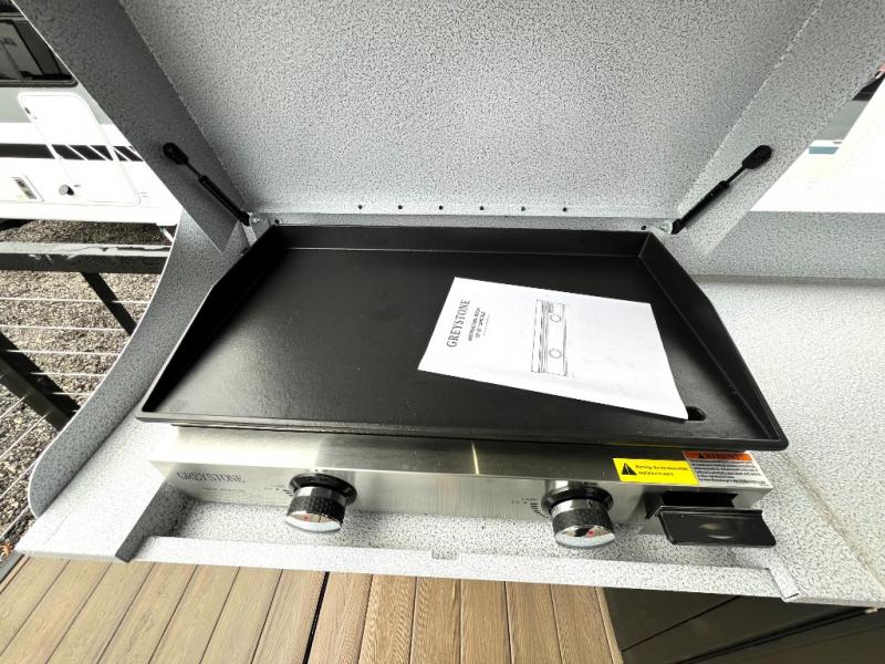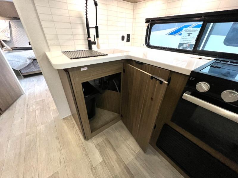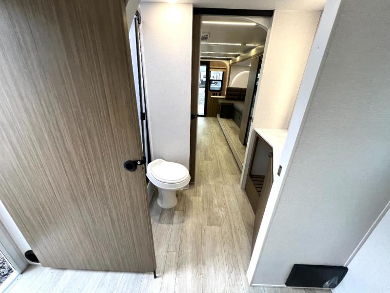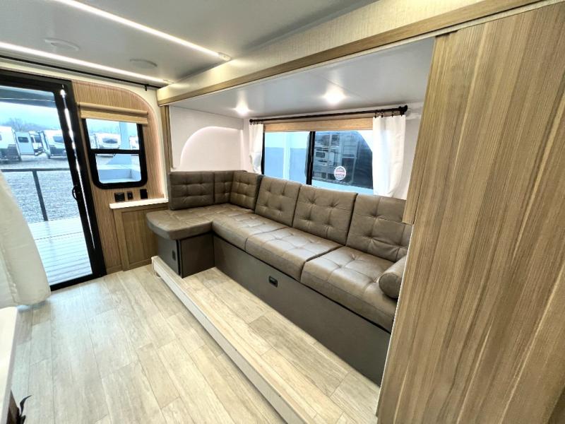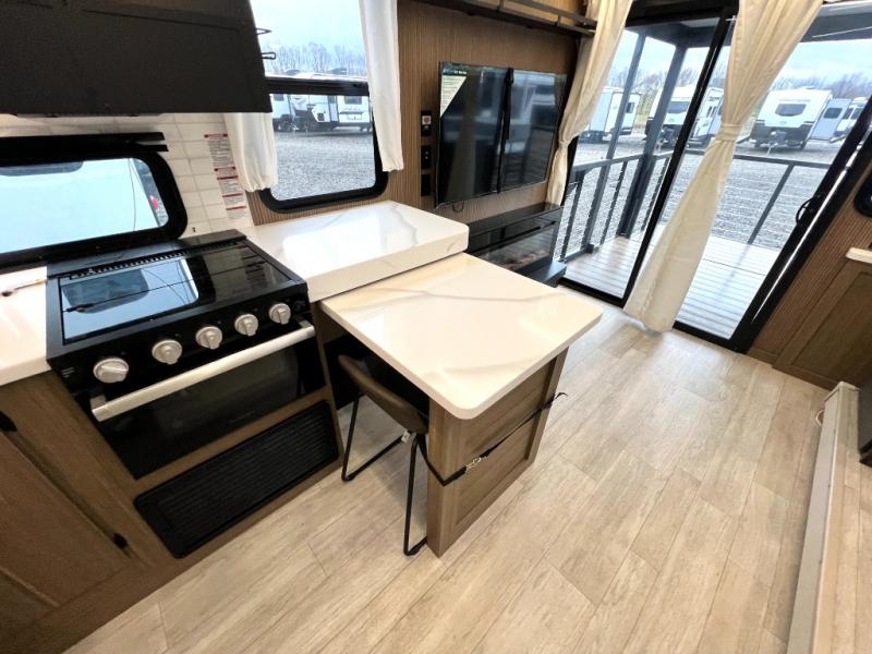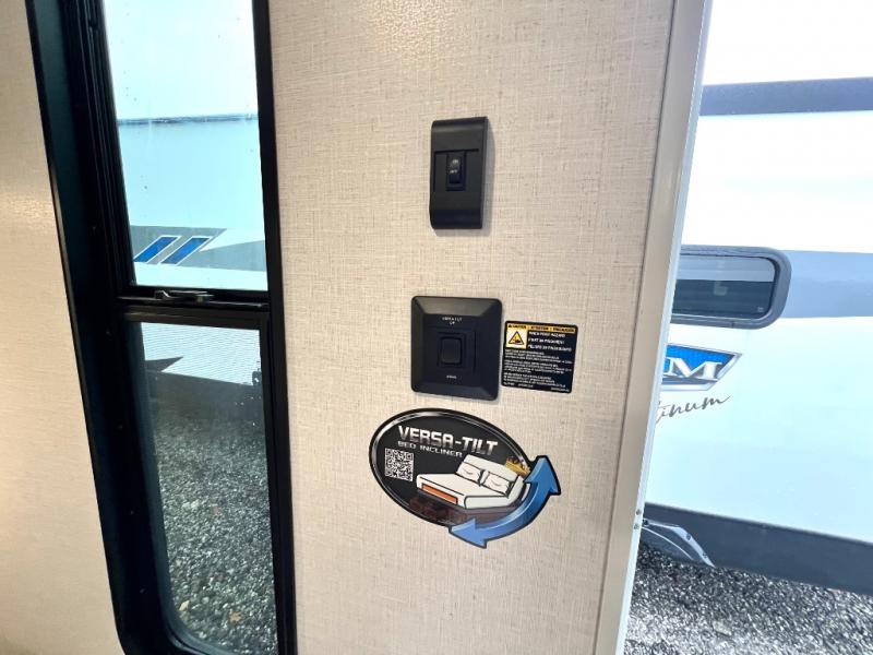 This travel trailer will feel more like home with its rear veranda/porch, dual entry doors, and front master bedroom! There is an outdoor kitchen on the back porch so you can make lunch in the fresh air, and the patio doors lead right into the main living area. Your crew can relax on the L-shaped sofa across from the fireplace, which will make your space more cozy. The U-shaped kitchen counter includes a pull-out table for even more counter space, and the walk-thru bath is easily accessible for everyone to use. You will love having your own space in the master bedroom, and the Versa-Tilt custom king bed will let you sit up in bed to read your book at night. One of the dual entry doors is also found here for added convenience!
