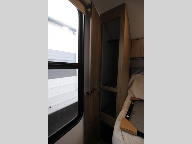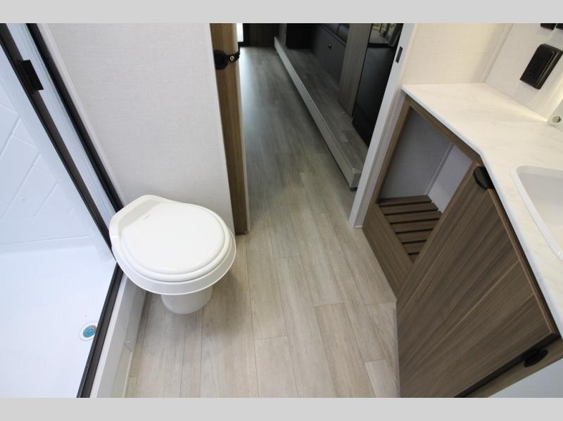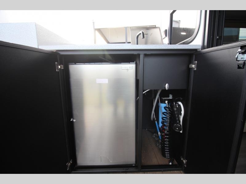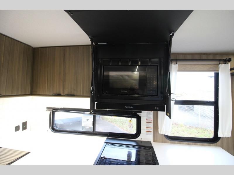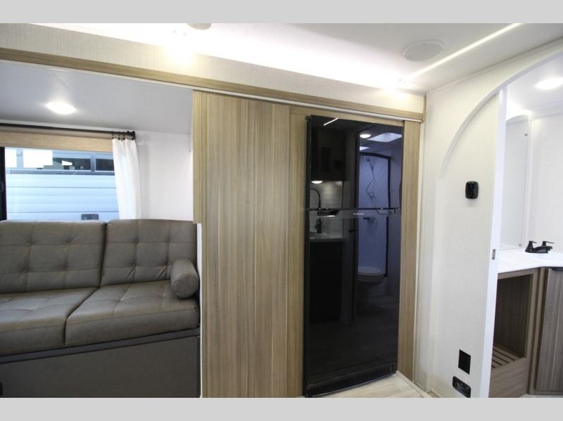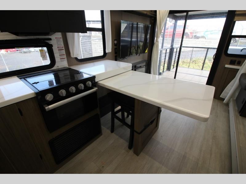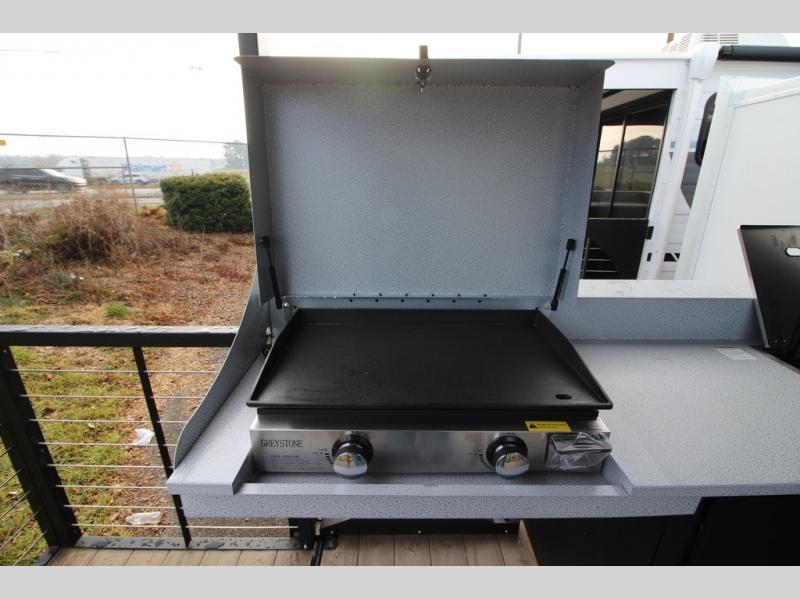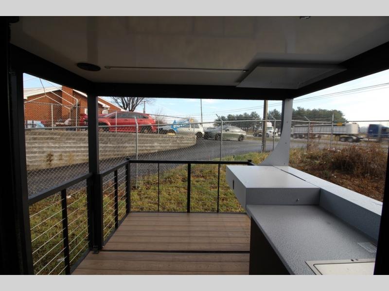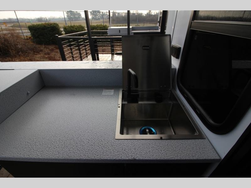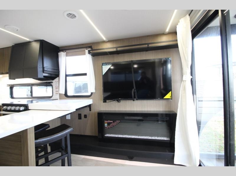 This travel trailer will feel more like home with its rear veranda/porch, dual entry doors, and front master bedroom! There is an outdoor kitchen on the back porch so you can make lunch in the fresh air, and the patio doors lead right into the main living area. Your crew can relax on the L-shaped sofa across from the fireplace, which will make your space more cozy. The U-shaped kitchen counter includes a pull-out table for even more counter space, and the walk-thru bath is easily accessible for everyone to use. You will love having your own space in the master bedroom, and the Versa-Tilt custom king bed will let you sit up in bed to read your book at night. One of the dual entry doors is also found here for added convenience!