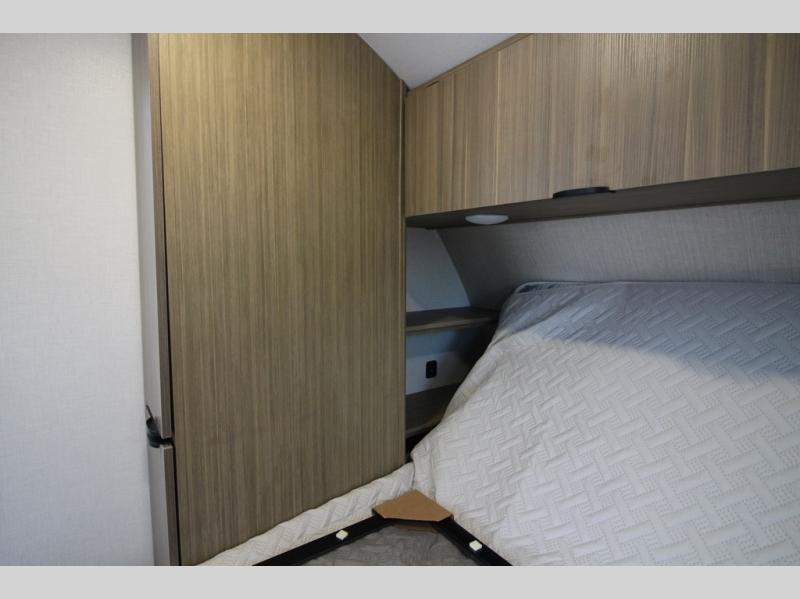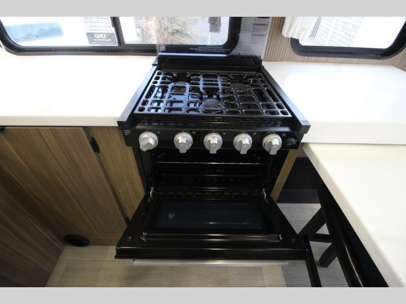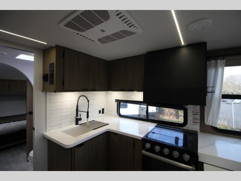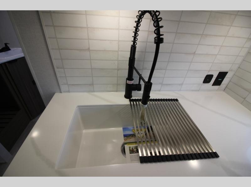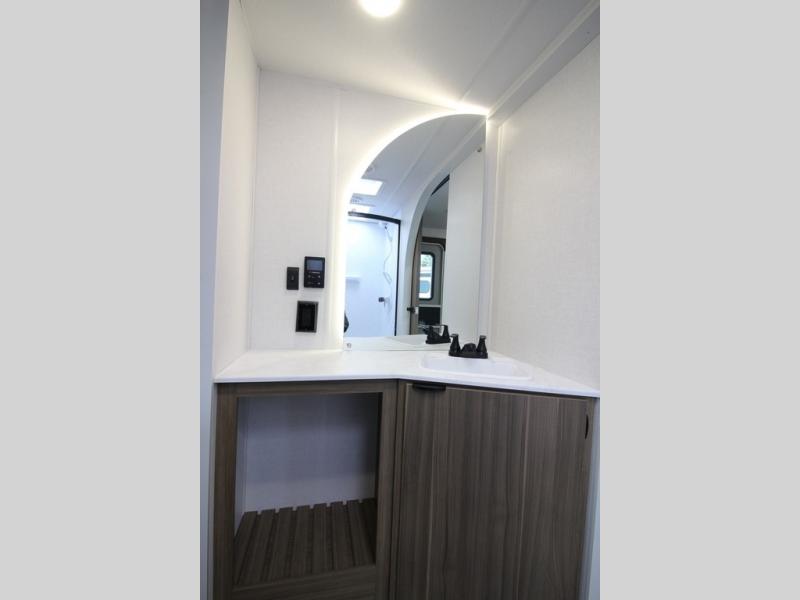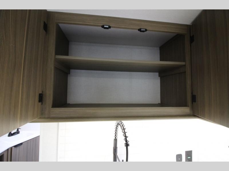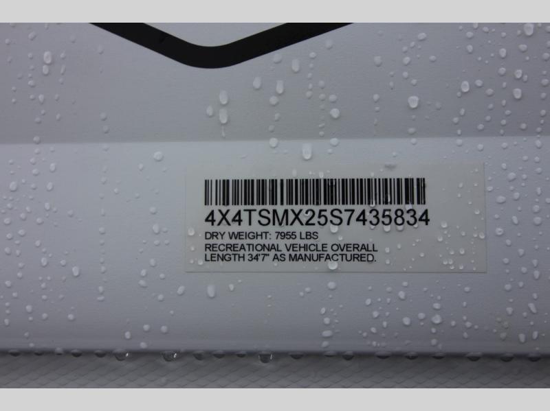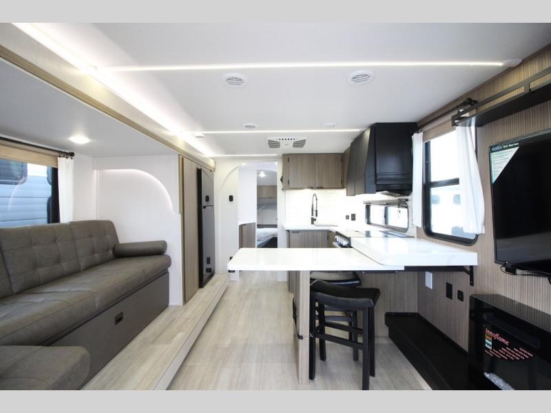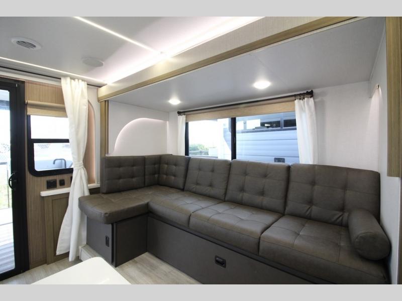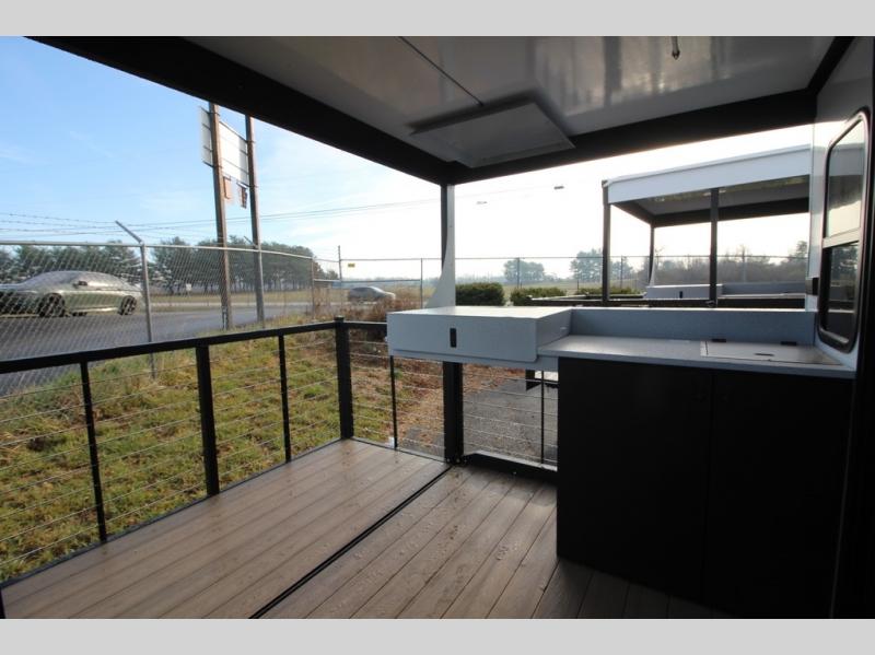 This travel trailer will feel more like home with its rear veranda/porch, dual entry doors, and front master bedroom! There is an outdoor kitchen on the back porch so you can make lunch in the fresh air, and the patio doors lead right into the main living area. Your crew can relax on the L-shaped sofa across from the fireplace, which will make your space more cozy. The U-shaped kitchen counter includes a pull-out table for even more counter space, and the walk-thru bath is easily accessible for everyone to use. You will love having your own space in the master bedroom, and the Versa-Tilt custom king bed will let you sit up in bed to read your book at night. One of the dual entry doors is also found here for added convenience!