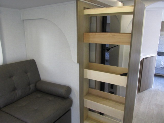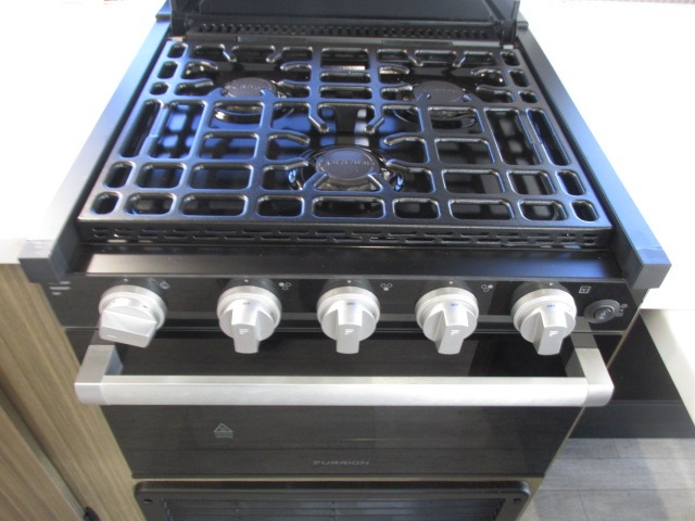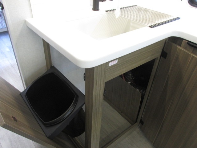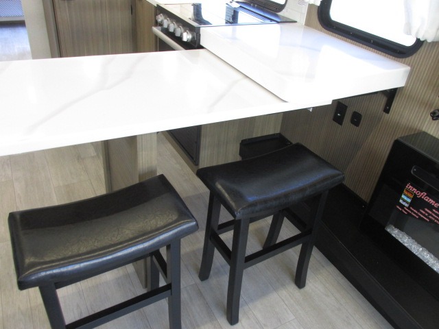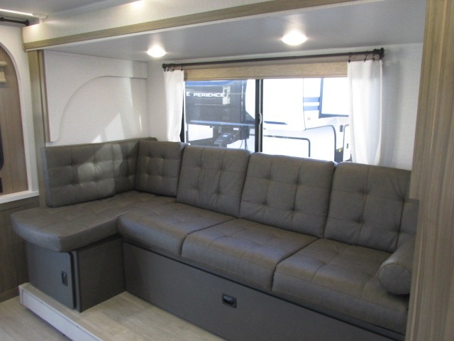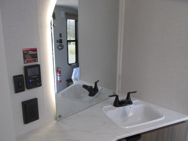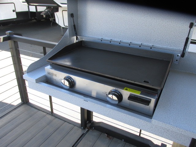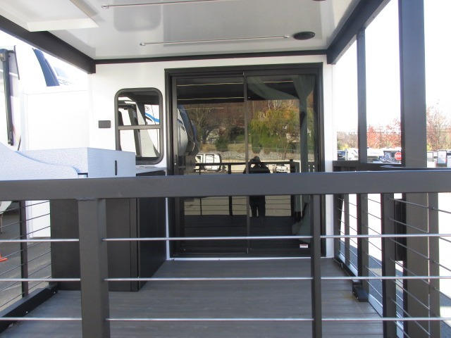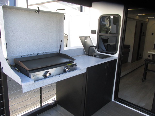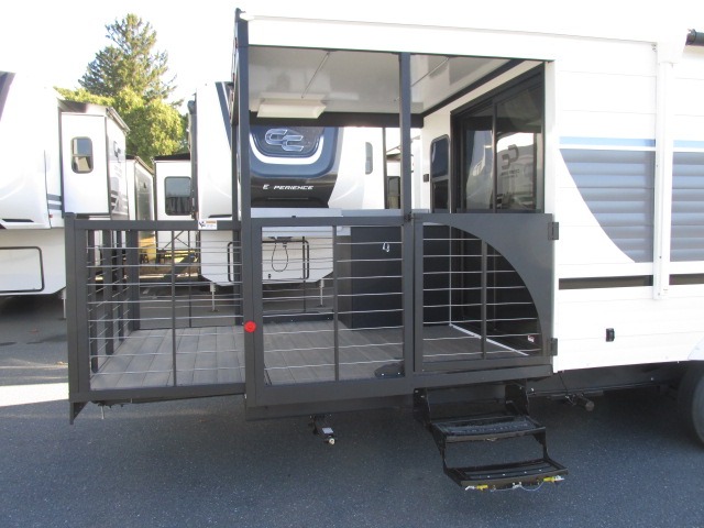 This travel trailer will feel more like home with its rear veranda/porch, dual entry doors, and front master bedroom! There is an outdoor kitchen on the back porch so you can make lunch in the fresh air, and the patio doors lead right into the main living area. Your crew can relax on the L-shaped sofa across from the fireplace, which will make your space more cozy. The U-shaped kitchen counter includes a pull-out table for even more counter space, and the walk-thru bath is easily accessible for everyone to use. You will love having your own space in the master bedroom, and the Versa-Tilt custom king bed will let you sit up in bed to read your book at night. One of the dual entry doors is also found here for added convenience!