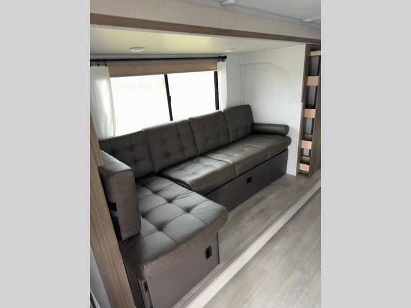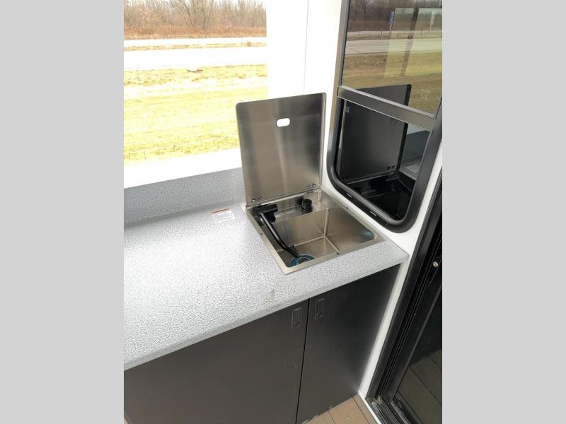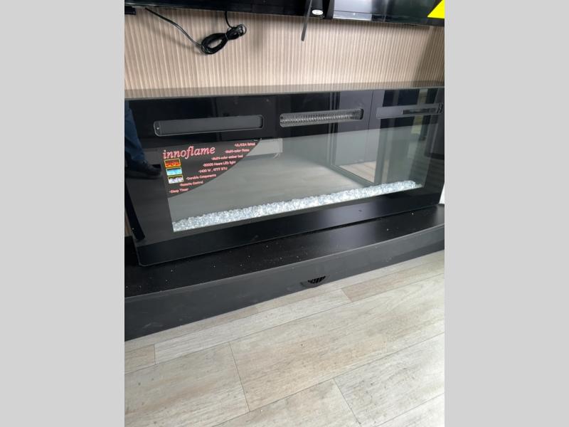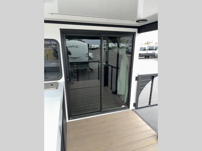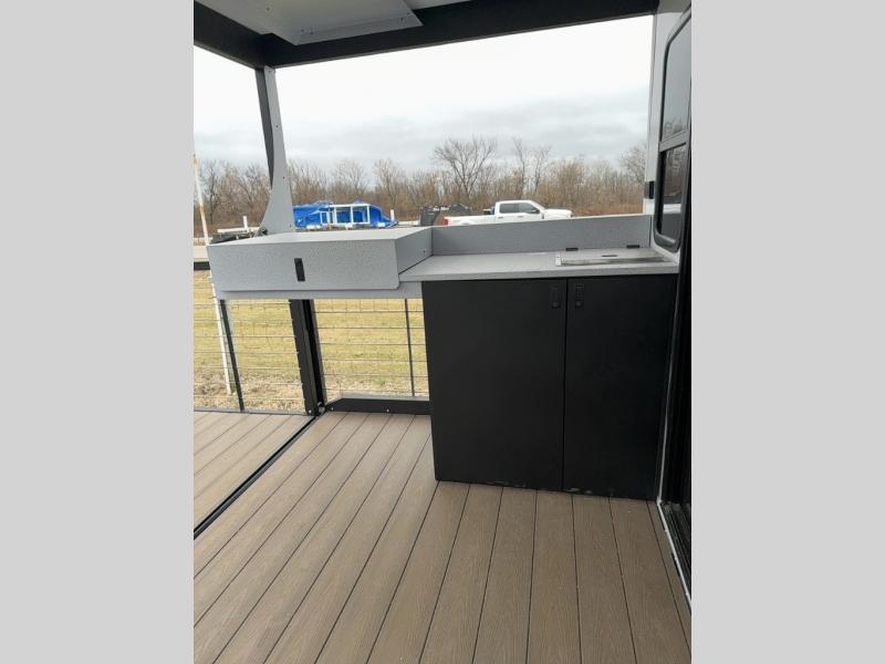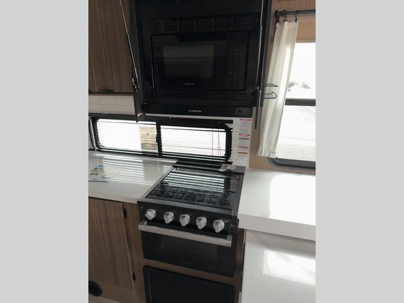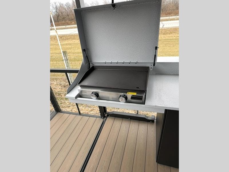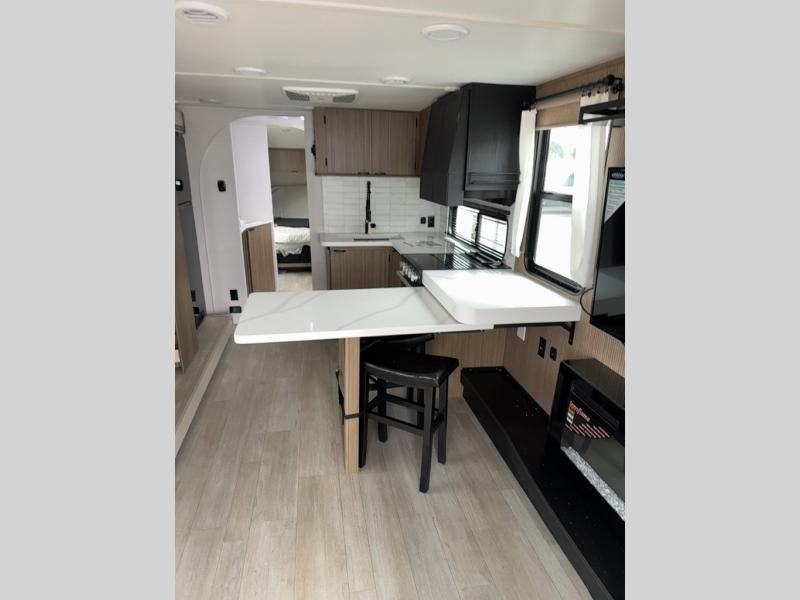 This travel trailer will feel more like home with its rear veranda/porch, dual entry doors, and front master bedroom! There is an outdoor kitchen on the back porch so you can make lunch in the fresh air, and the patio doors lead right into the main living area. Your crew can relax on the L-shaped sofa across from the fireplace, which will make your space more cozy. The U-shaped kitchen counter includes a pull-out table for even more counter space, and the walk-thru bath is easily accessible for everyone to use. You will love having your own space in the master bedroom, and the Versa-Tilt custom king bed will let you sit up in bed to read your book at night. One of the dual entry doors is also found here for added convenience!
