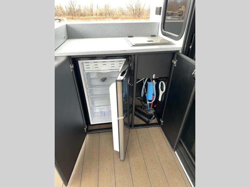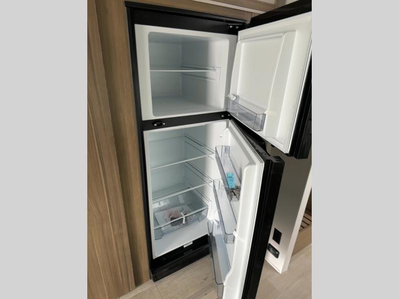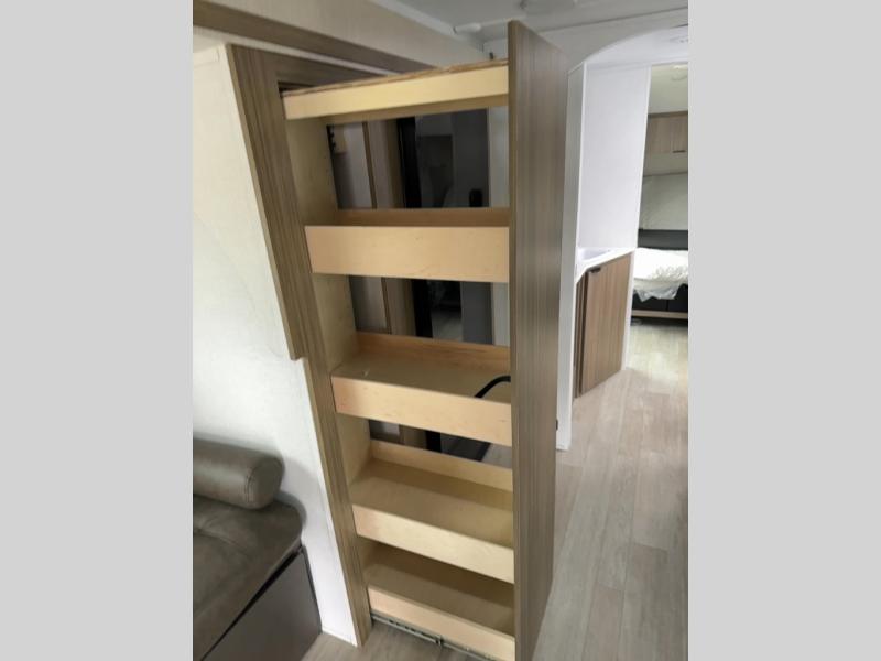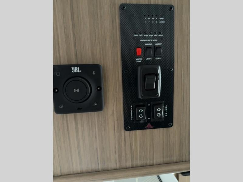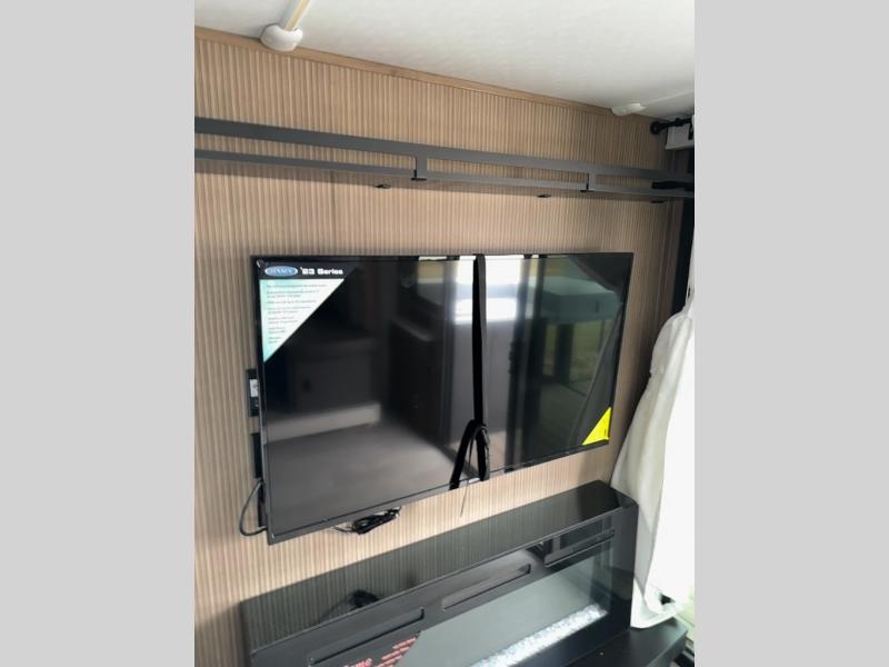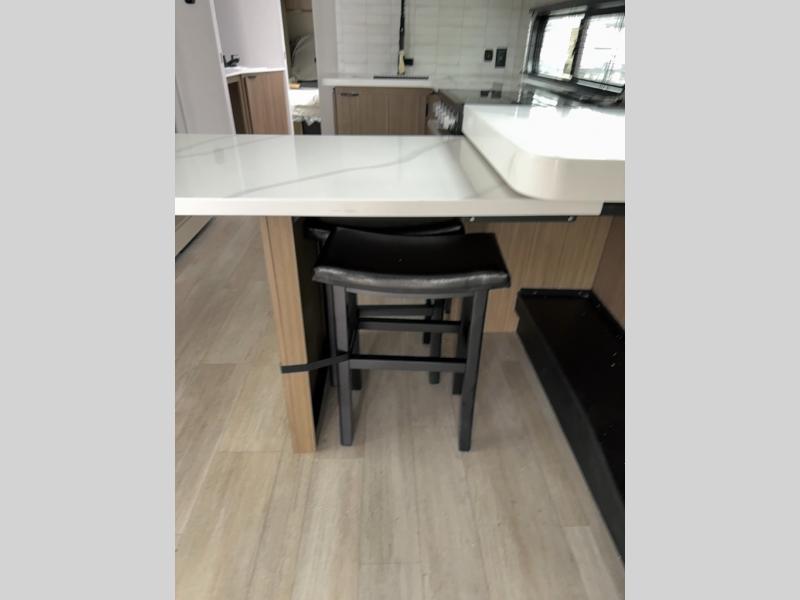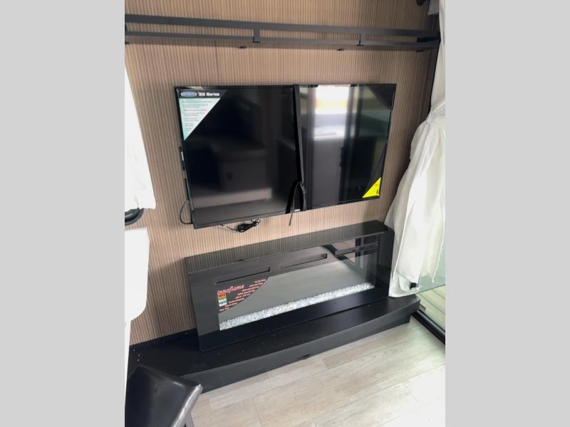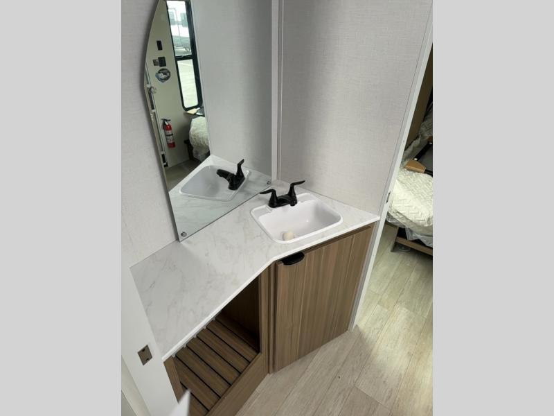This travel trailer will feel more like home with its rear veranda/porch, dual entry doors, and front master bedroom! There is an outdoor kitchen on the back porch so you can make lunch in the fresh air, and the patio doors lead right into the main living area. Your crew can relax on the L-shaped sofa across from the fireplace, which will make your space more cozy. The U-shaped kitchen counter includes a pull-out table for even more counter space, and the walk-thru bath is easily accessible for everyone to use. You will love having your own space in the master bedroom, and the Versa-Tilt custom king bed will let you sit up in bed to read your book at night. One of the dual entry doors is also found here for added convenience!