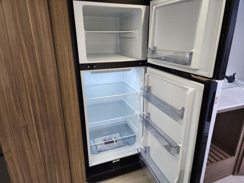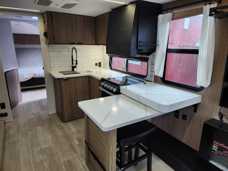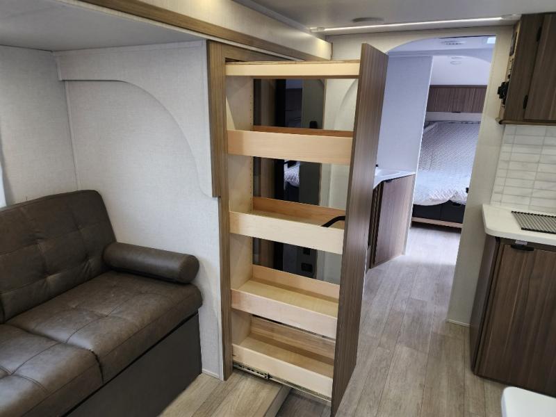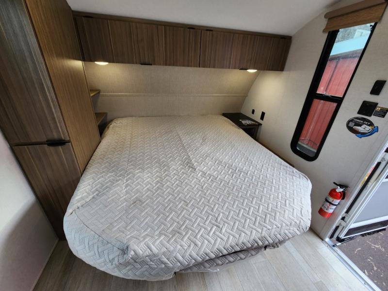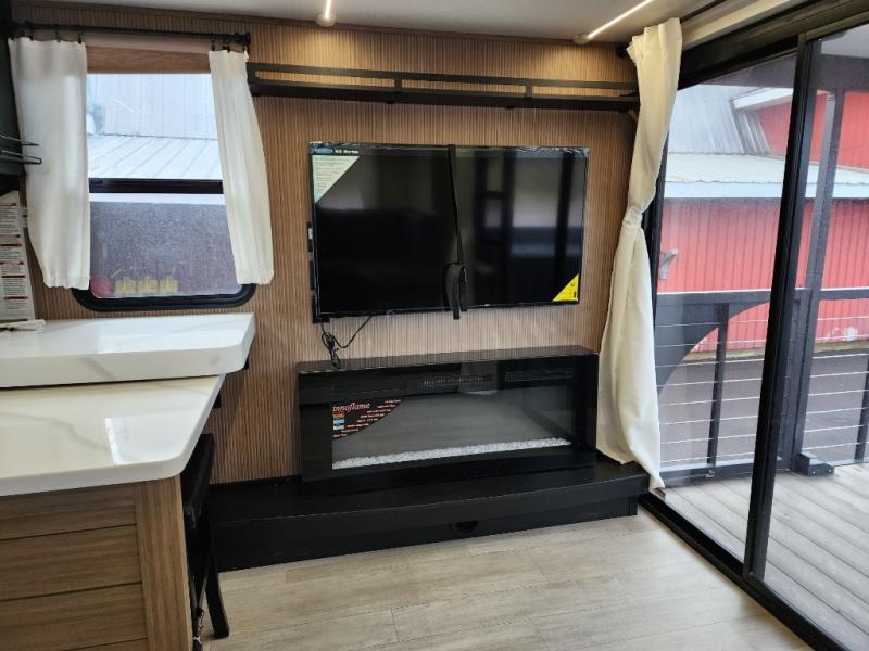 This travel trailer will feel more like home with its rear veranda/porch, dual entry doors, and front master bedroom! There is an outdoor kitchen on the back porch so you can make lunch in the fresh air, and the patio doors lead right into the main living area. Your crew can relax on the L-shaped sofa across from the fireplace, which will make your space more cozy. The U-shaped kitchen counter includes a pull-out table for even more counter space, and the walk-thru bath is easily accessible for everyone to use. You will love having your own space in the master bedroom, and the Versa-Tilt custom king bed will let you sit up in bed to read your book at night. One of the dual entry doors is also found here for added convenience!