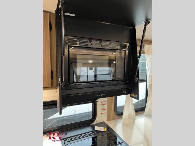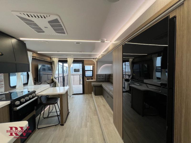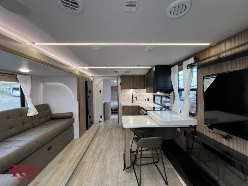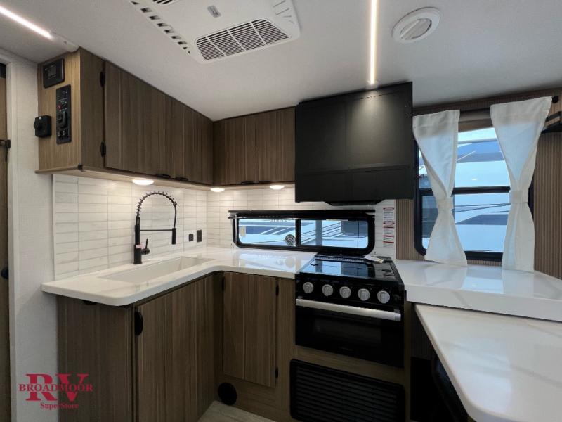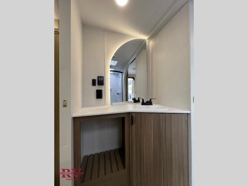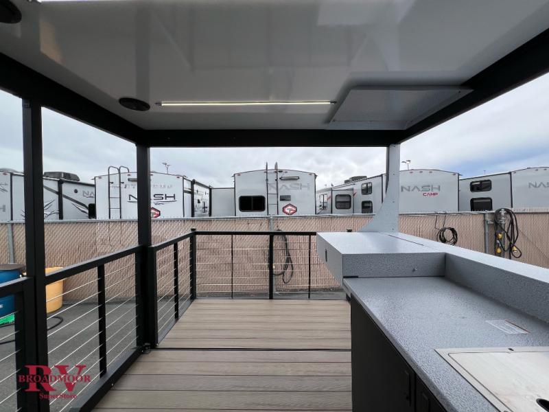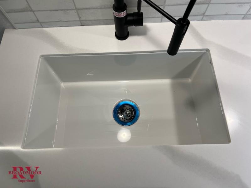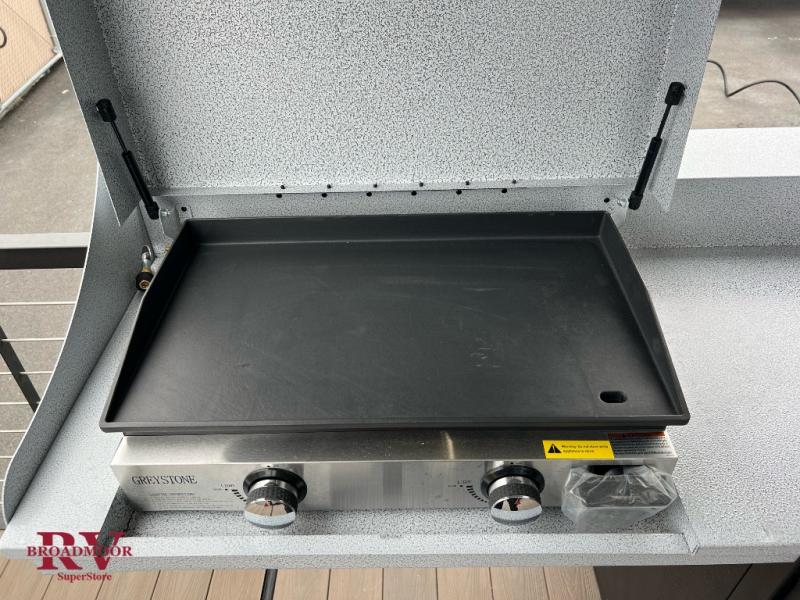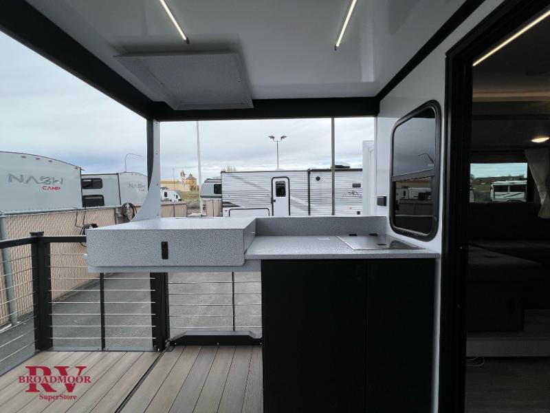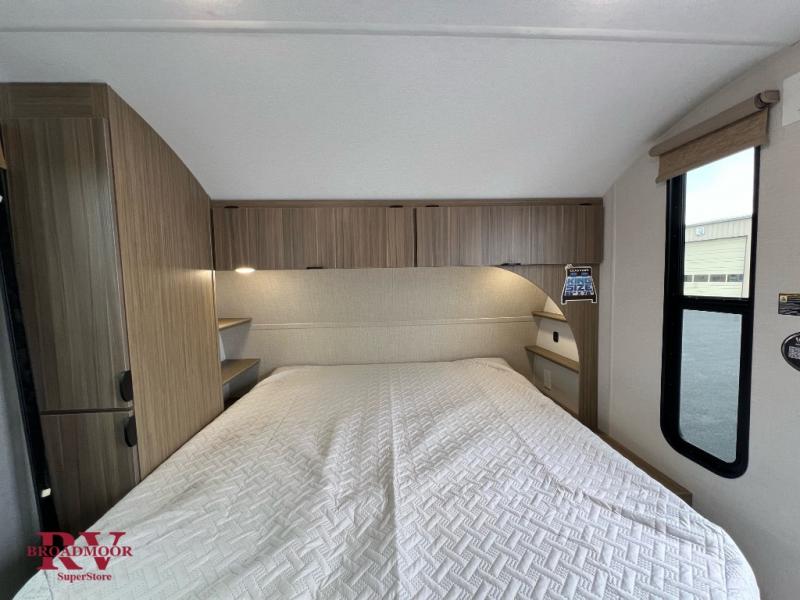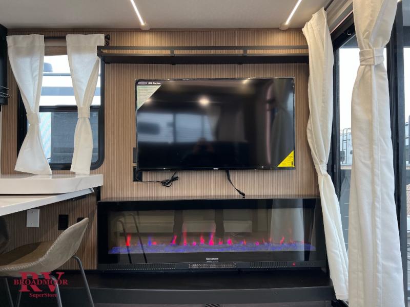 This travel trailer will feel more like home with its rear veranda/porch, dual entry doors, and front master bedroom! There is an outdoor kitchen on the back porch so you can make lunch in the fresh air, and the patio doors lead right into the main living area. Your crew can relax on the L-shaped sofa across from the fireplace, which will make your space more cozy. The U-shaped kitchen counter includes a pull-out table for even more counter space, and the walk-thru bath is easily accessible for everyone to use. You will love having your own space in the master bedroom, and the Versa-Tilt custom king bed will let you sit up in bed to read your book at night. One of the dual entry doors is also found here for added convenience!