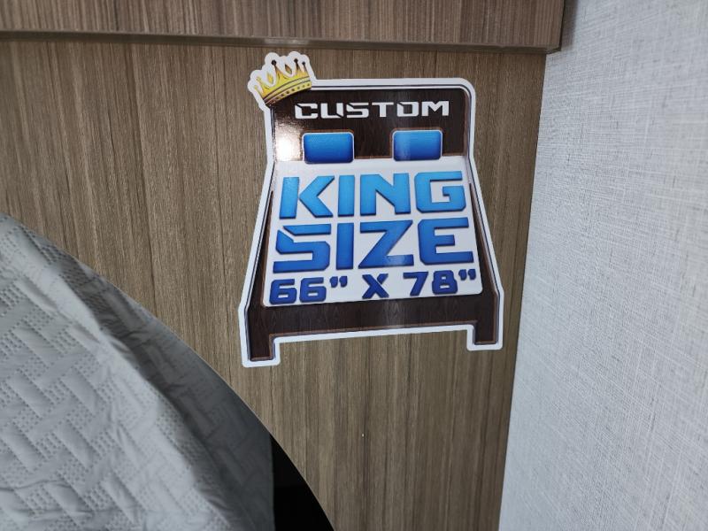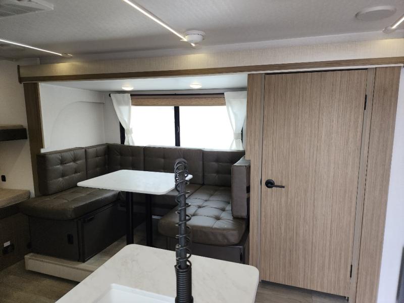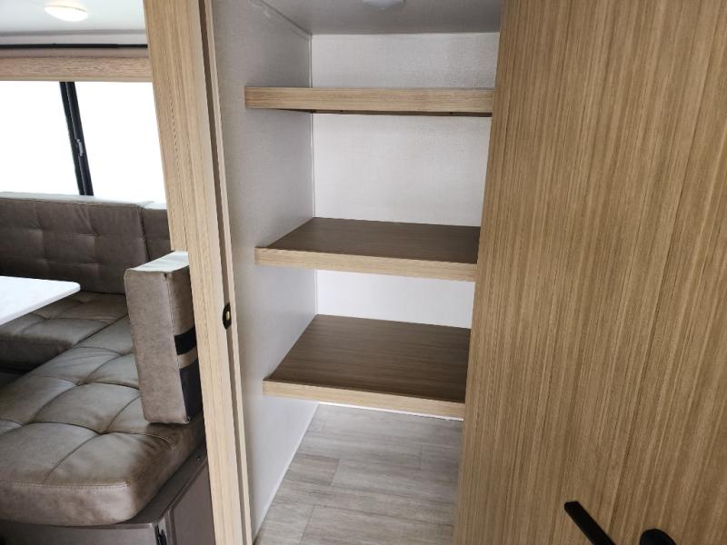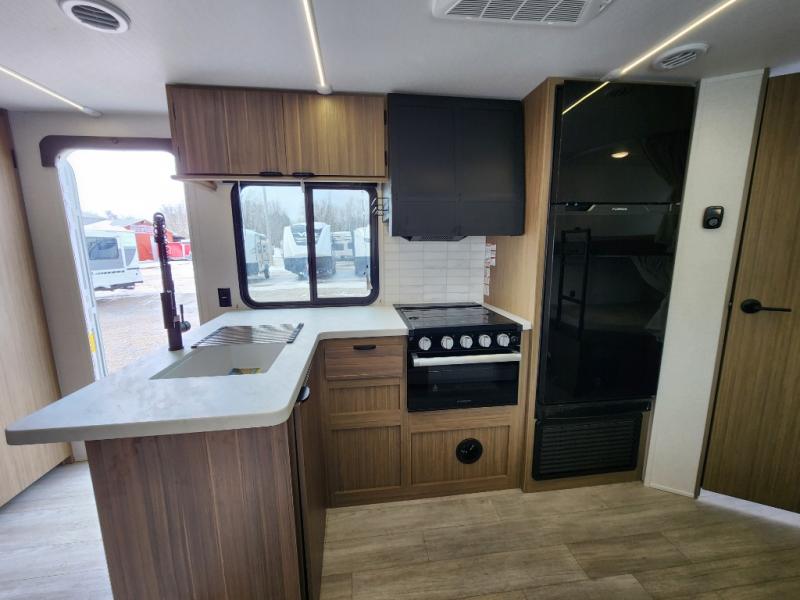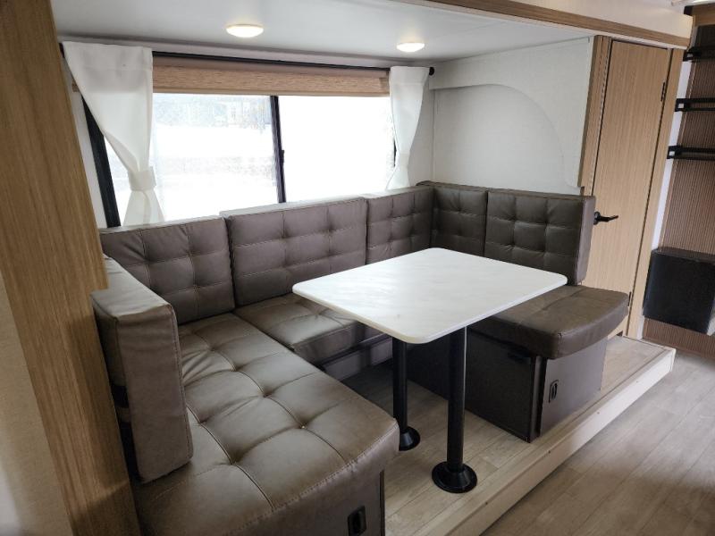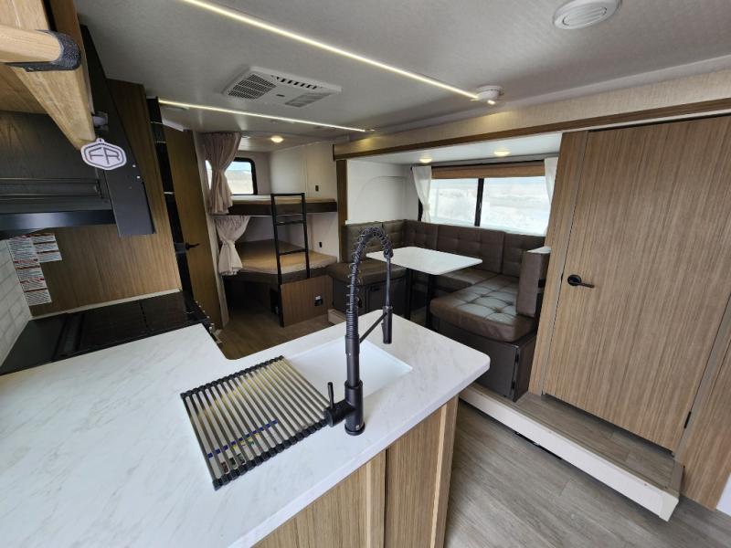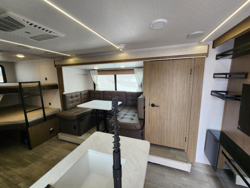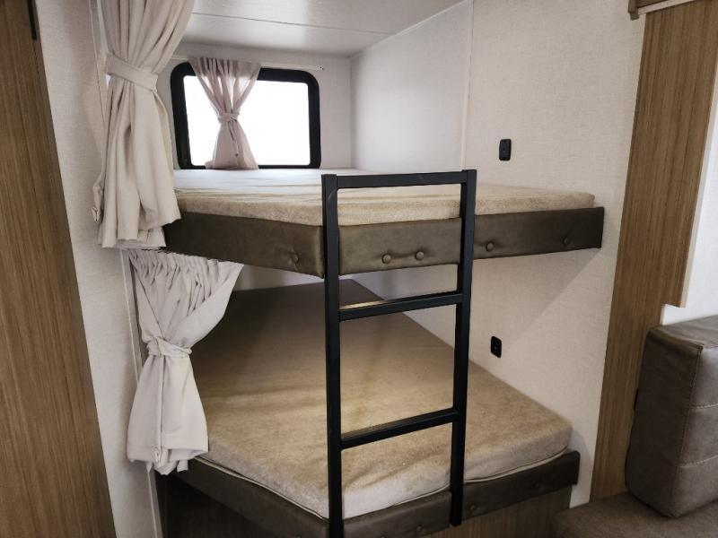 This travel trailer is big enough for the whole family to join in on the fun and weighs in at less than 6,000 lbs.! The kiddos can sleep on the corner 46" 74" double-size bunk beds, and you can sleep on the Versa Tilt custom king bed inside the front private bedroom, plus the U-shaped dinette can transform into an extra sleeping space. It also has a panoramic window for you to look out at your beautiful scenery while you eat. The rear corner bathroom has everything you will need to get squeaky clean each morning, as well as an exit/entrance door to the unit. The oversized refrigerator will keep your perishables fresh and the cooktop is just waiting for you to create a delicious meal. There is also a walk-in pantry for canned goods and an outside kitchen for the cook to enjoy!