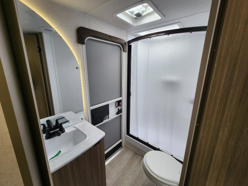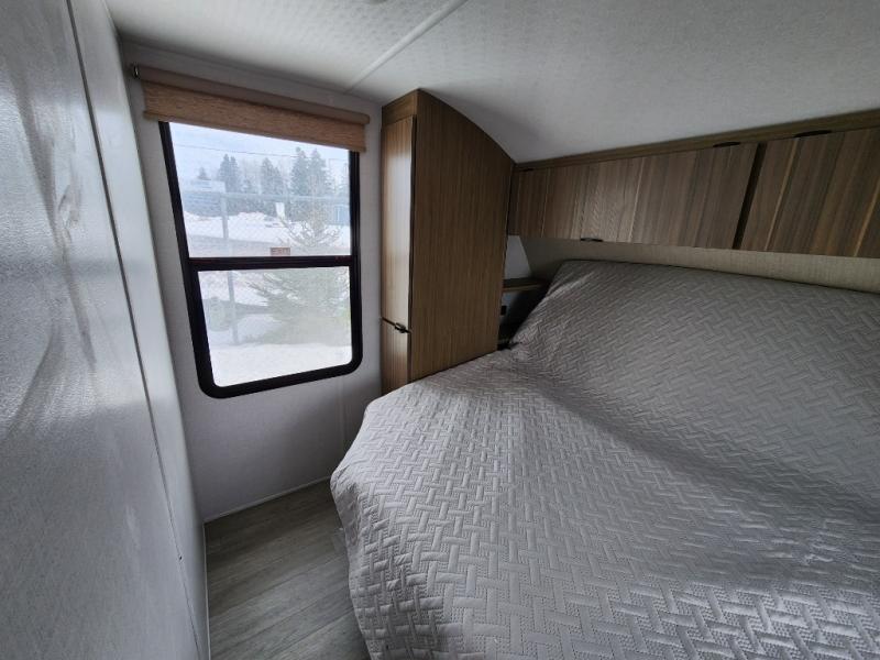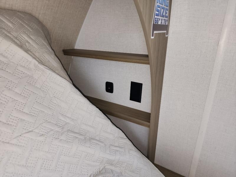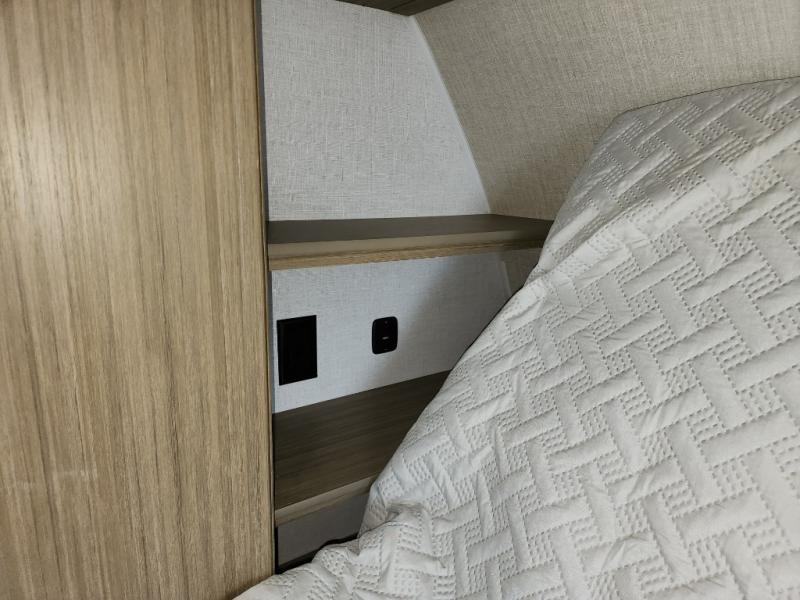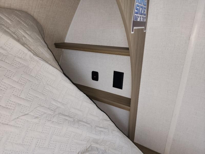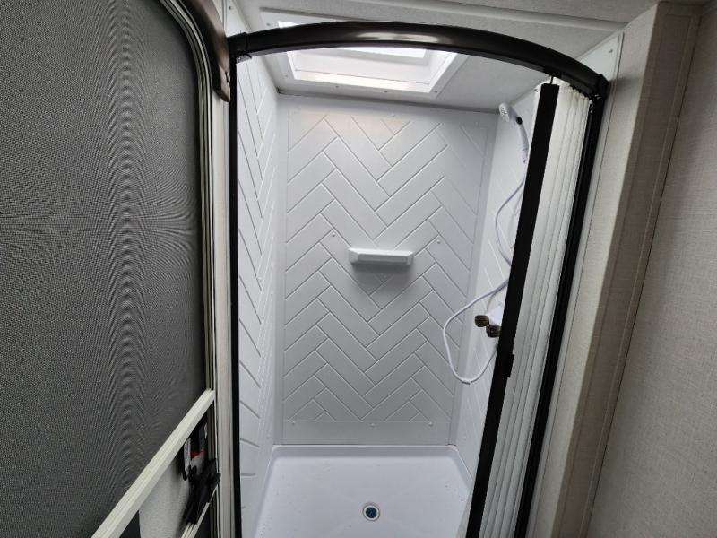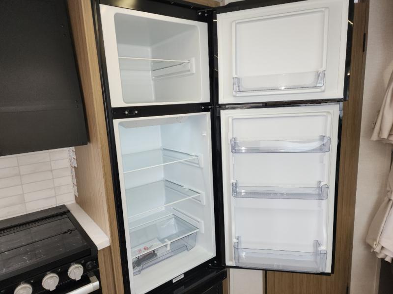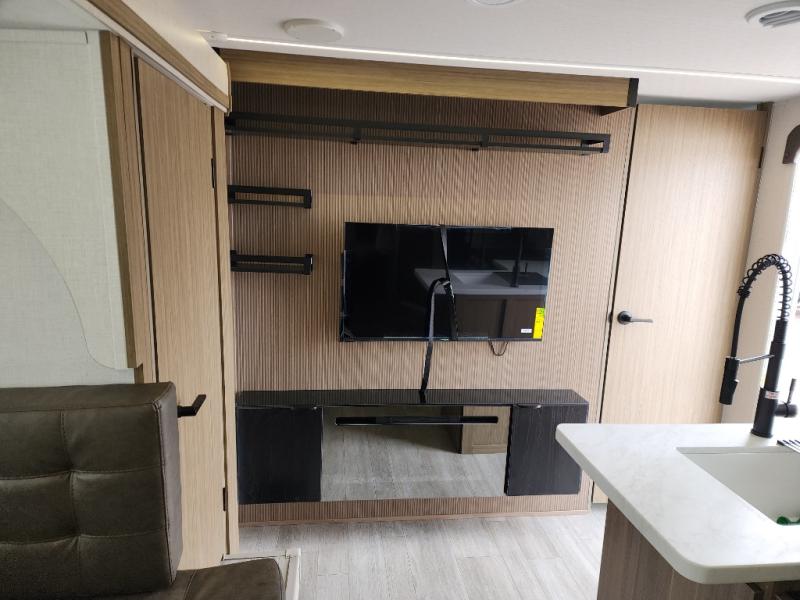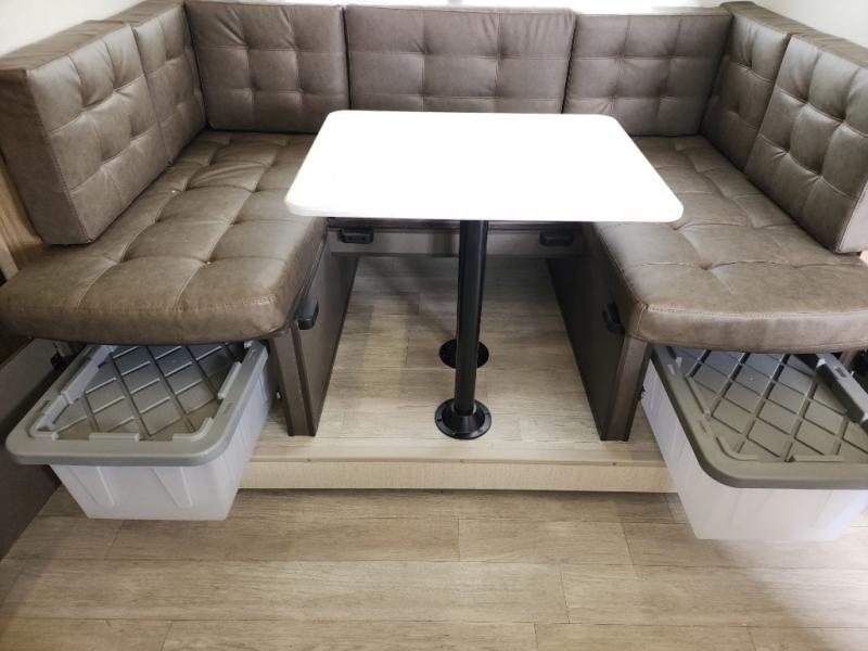 This travel trailer is big enough for the whole family to join in on the fun and weighs in at less than 6,000 lbs.! The kiddos can sleep on the corner 46" 74" double-size bunk beds, and you can sleep on the Versa Tilt custom king bed inside the front private bedroom, plus the U-shaped dinette can transform into an extra sleeping space. It also has a panoramic window for you to look out at your beautiful scenery while you eat. The rear corner bathroom has everything you will need to get squeaky clean each morning, as well as an exit/entrance door to the unit. The oversized refrigerator will keep your perishables fresh and the cooktop is just waiting for you to create a delicious meal. There is also a walk-in pantry for canned goods and an outside kitchen for the cook to enjoy!
