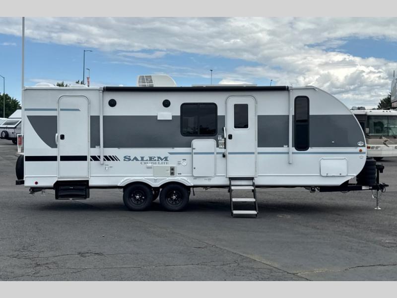 The Salem Cruise Lite travel trailers and toy haulers are value-minded units packed with great camping features! There are a variety of floorplans to choose from between three different regions. The enclosed Accessibelly will help protect against the elements and debris during transport, and the exterior retro/metal redesign is sure to be eye-catching! There are stylish roller shades inside, along with updated backsplash, elegant curtain rods and curtains, plus many more interior comforts! Choose a Salem Cruise Lite today for quality and value!