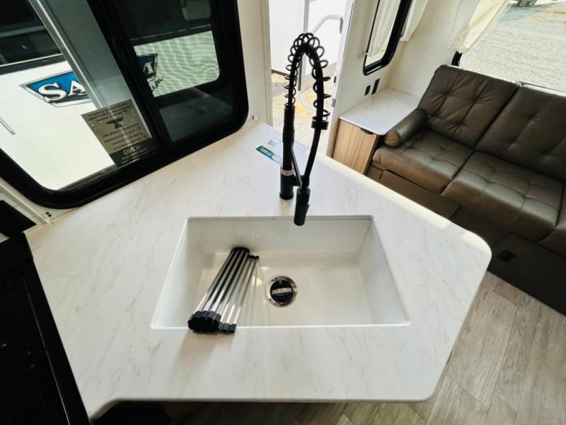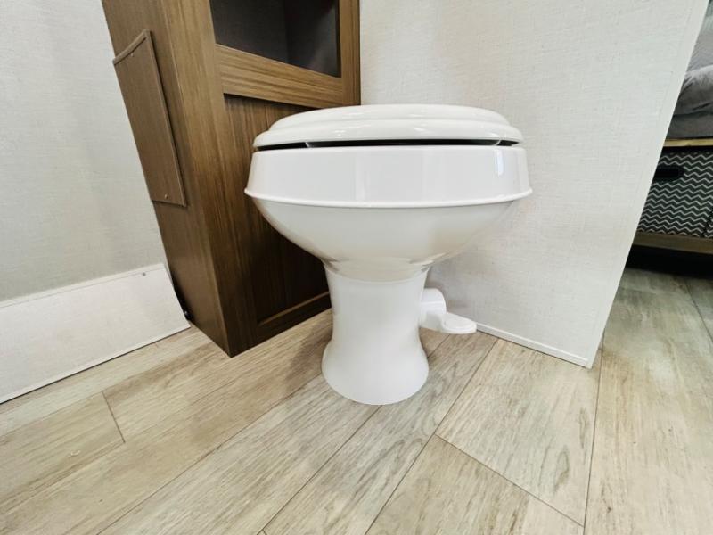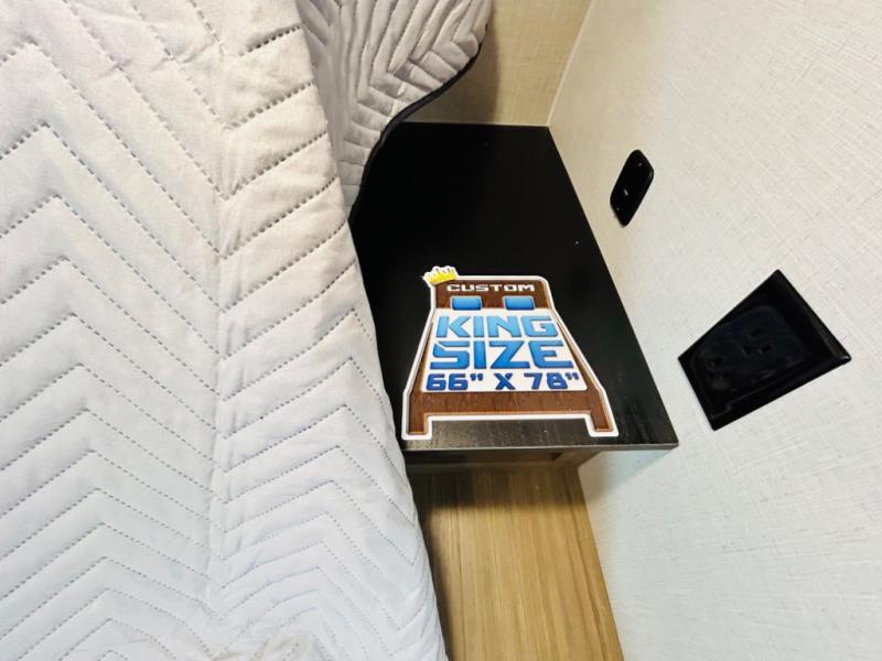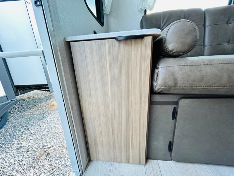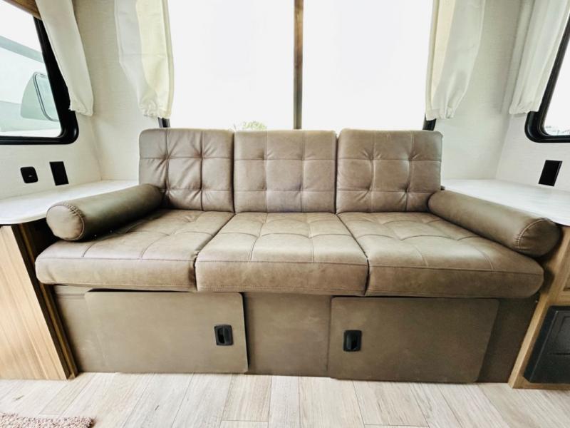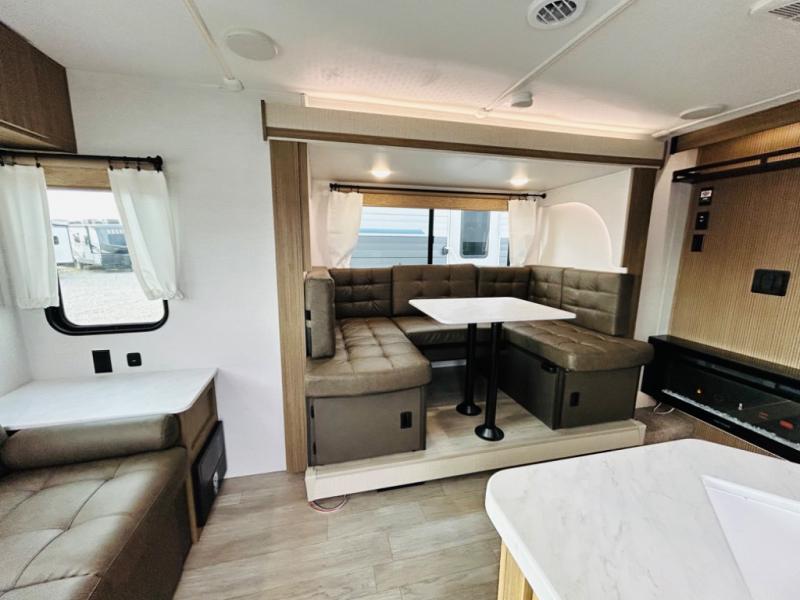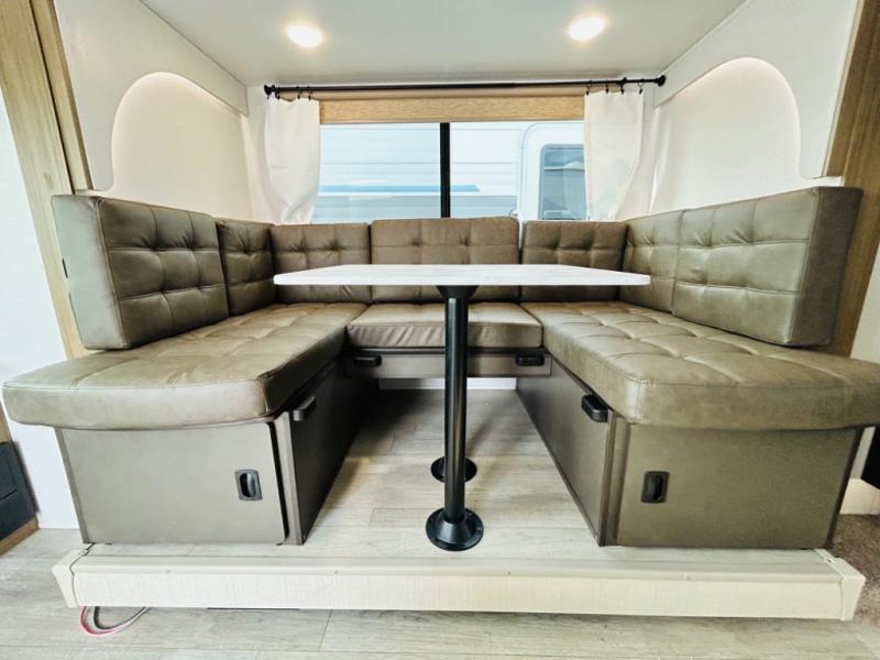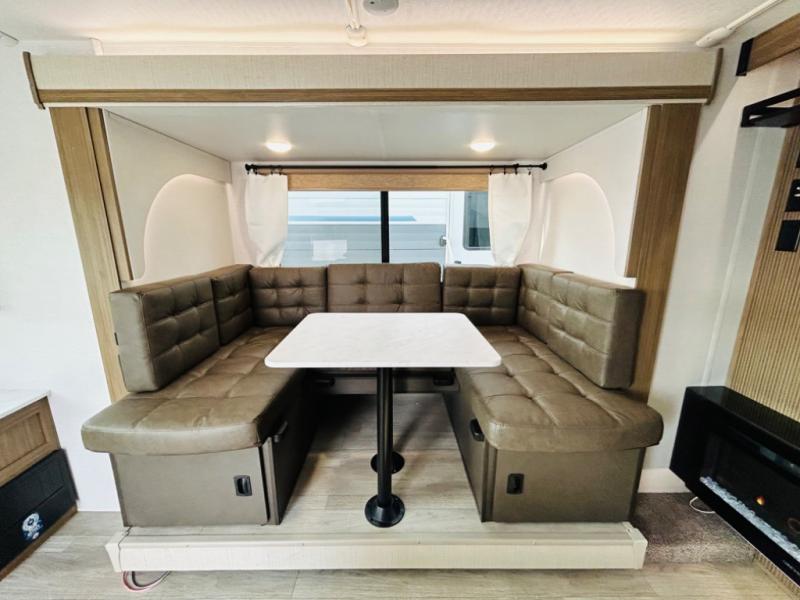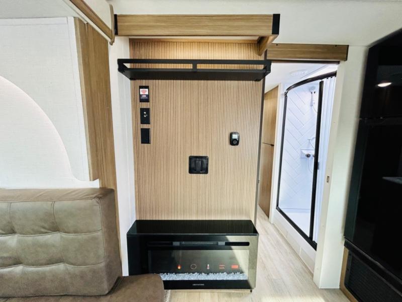 This travel trailer is packed full of features, but is still lightweight coming in at just over 5,000 lbs.! You will feel right at home in the front master bedroom with a custom king bed with Versa Tilt and a closet to keep your clothes tidy. The walk-through bathroom has a walk-in shower with fiberglass surround and a skylight above for added natural lighting as you get ready. The U-shaped dinette slide has a panoramic window for you to enjoy your beautiful scenery as you eat dinner, and there is a fireplace at the entertainment center for a relaxing evening indoors. There is a pass-through storage area to store your outdoor camping gear, and a 16' awning will provide shade as you're visiting outdoors.