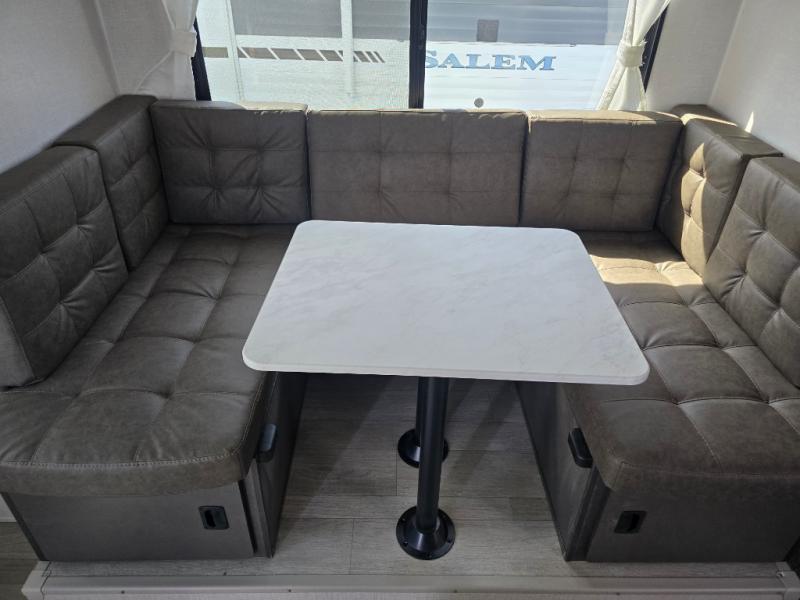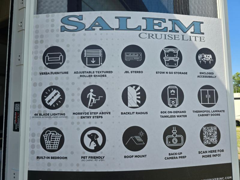 The Salem Cruise Lite travel trailers and toy haulers are value-minded units packed with great camping features! There are a variety of floorplans to choose from between three different regions. The enclosed Accessibelly will help protect against the elements and debris during transport, and the exterior retro/metal redesign is sure to be eye-catching! There are stylish roller shades inside, along with updated backsplash, elegant curtain rods and curtains, plus many more interior comforts! Choose a Salem Cruise Lite today for quality and value!