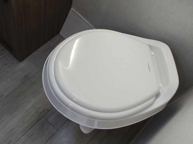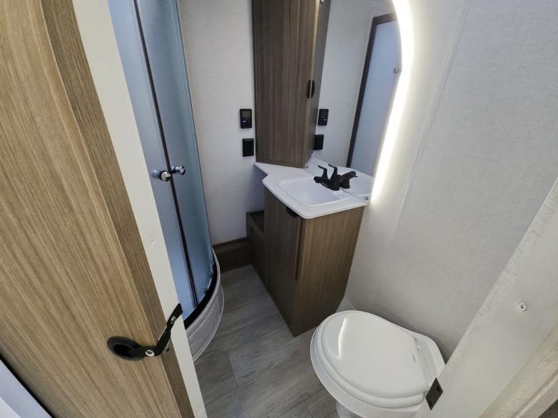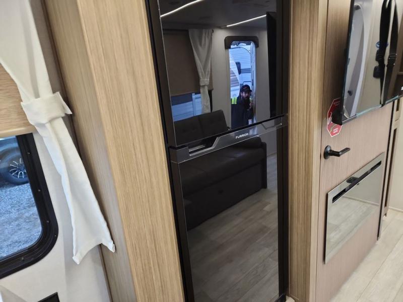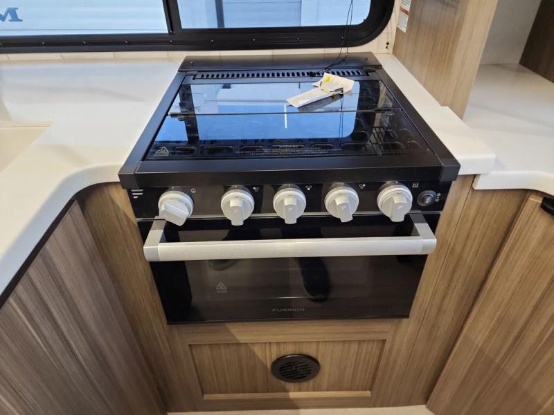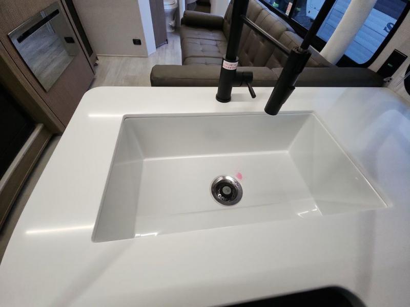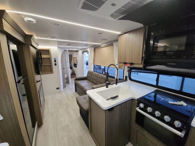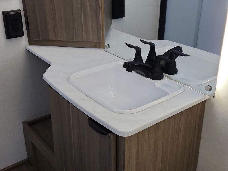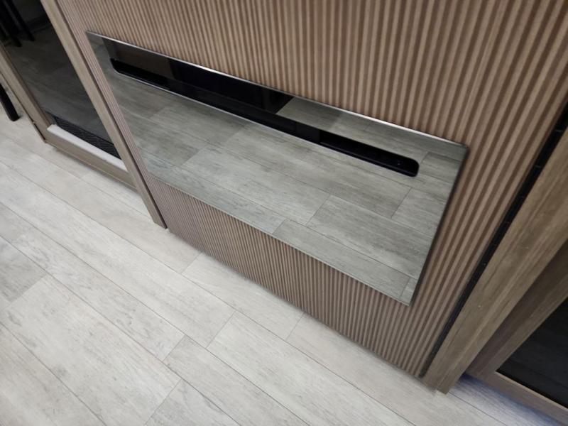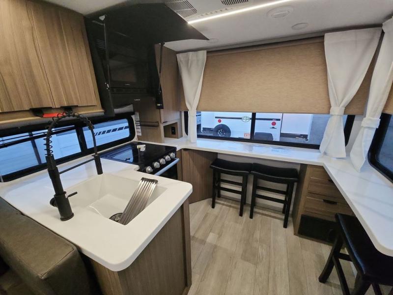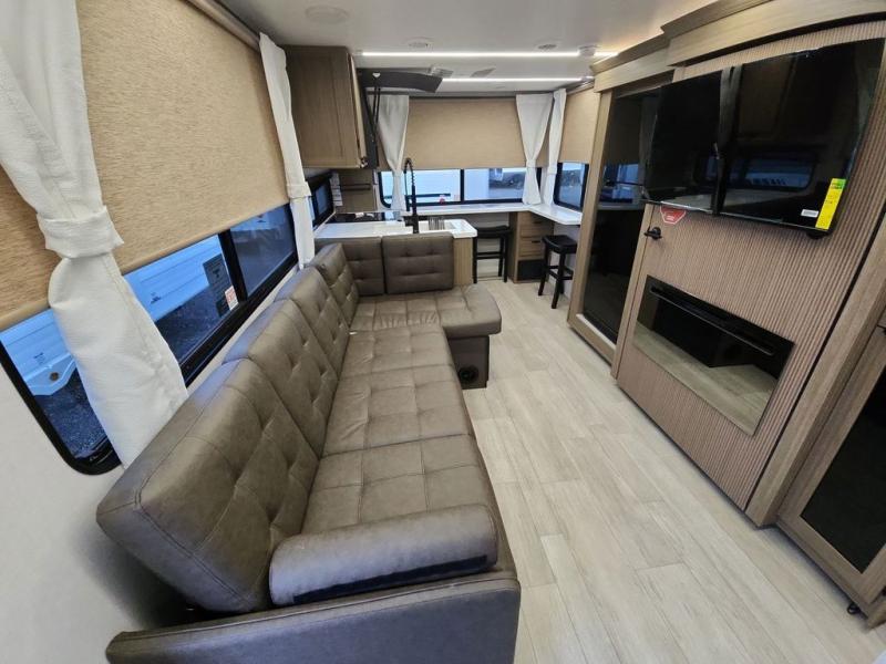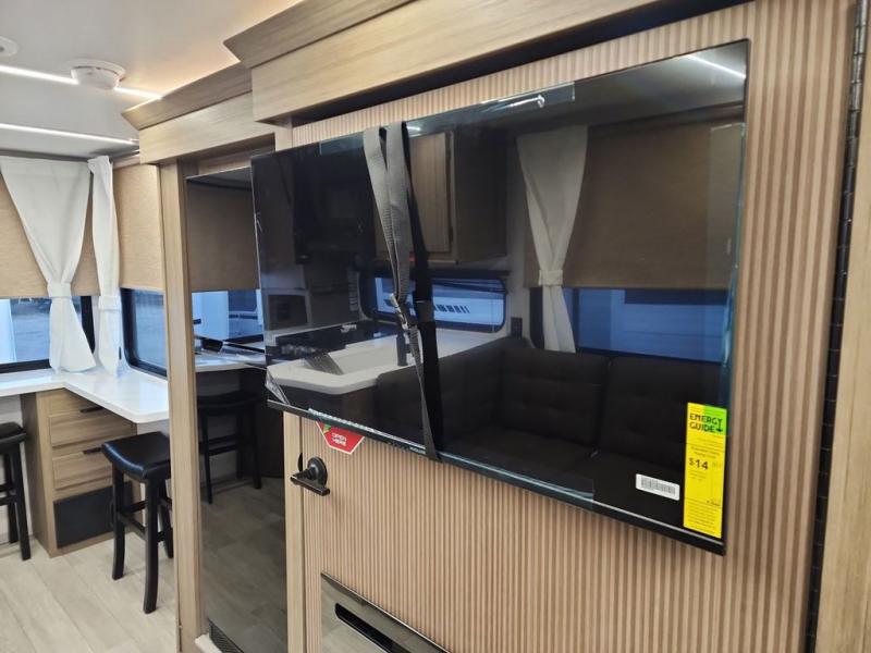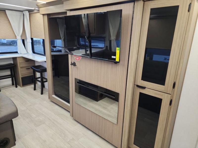 Enjoy your surroundings with 64 square feet of windows! The rear kitchen features 18 linear feet of wrap-around counter space including a double sink and cook-top with an overhead microwave oven. There are bar stools for dining inside along the rear counter, and an L-shaped chaise lounge for additional seating in the open living area. Here, behind the entertainment center, is a multi-purpose space hidden behind the fireplace including a hinged top mattress above a lower bunk, a desk beneath the mattress if you need office space during the day, and storage cubbies for your things, all within the Versa-Slide that also houses an oversized refrigerator for all of your perishables. The front private bedroom features a Versa-Tilt custom king bed with dual nightstands and closets, plus overhead storage. You will also find additional storage in a large pass-through beneath on the exterior. This model also includes an exterior camp kitchen so you can make a sunrise breakfast!