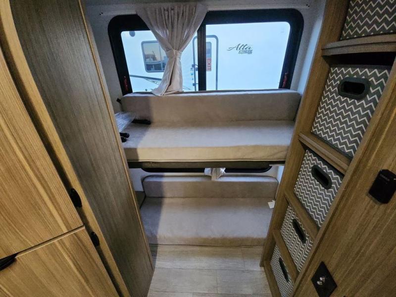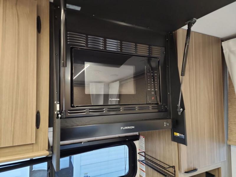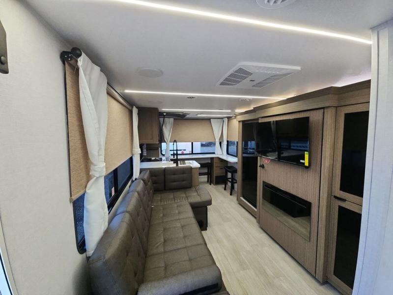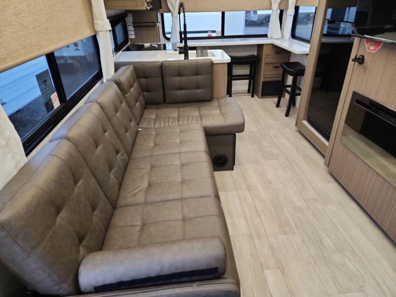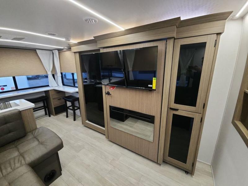 Enjoy your surroundings with 64 square feet of windows! The rear kitchen features 18 linear feet of wrap-around counter space including a double sink and cook-top with an overhead microwave oven. There are bar stools for dining inside along the rear counter, and an L-shaped chaise lounge for additional seating in the open living area. Here, behind the entertainment center, is a multi-purpose space hidden behind the fireplace including a hinged top mattress above a lower bunk, a desk beneath the mattress if you need office space during the day, and storage cubbies for your things, all within the Versa-Slide that also houses an oversized refrigerator for all of your perishables. The front private bedroom features a Versa-Tilt custom king bed with dual nightstands and closets, plus overhead storage. You will also find additional storage in a large pass-through beneath on the exterior. This model also includes an exterior camp kitchen so you can make a sunrise breakfast!