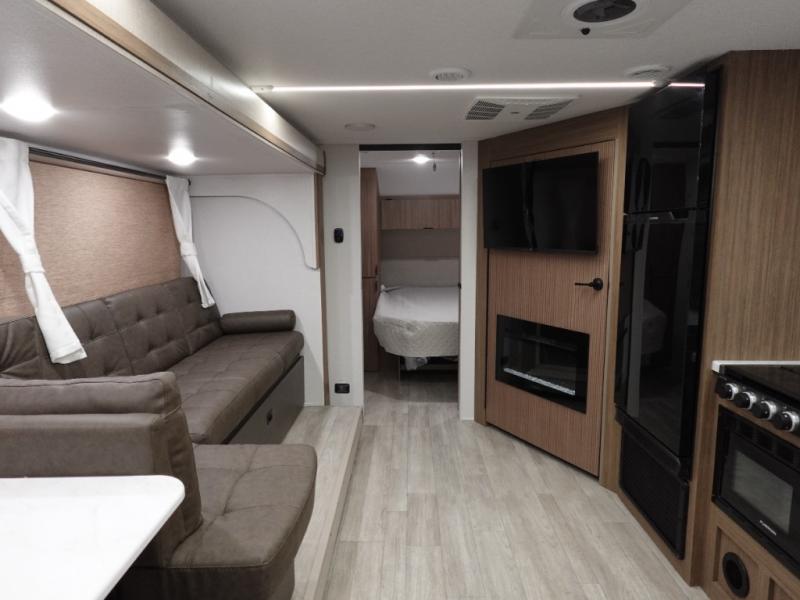 You're sure to make camping memories in this spacious travel trailer! You can sleep four to five people each night thanks to the the custom king bed with Versa Tilt in the front bedroom plus the Versa-Lounge and booth dinette within the large slide out! The full kitchen will let you make meals each day, and you'll appreciate the hidden pantry with shelves behind the fireplace. And don't overlook the full rear bath, complete with a tub/shower and ample counter space for your things.