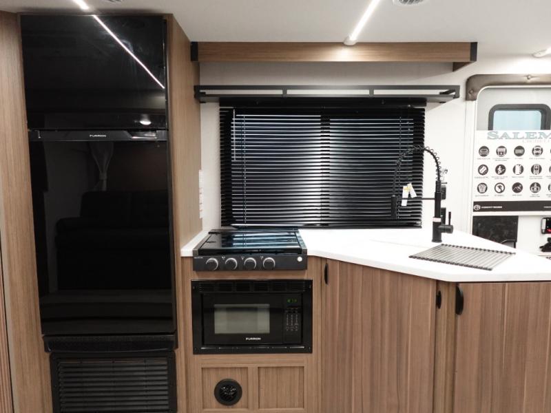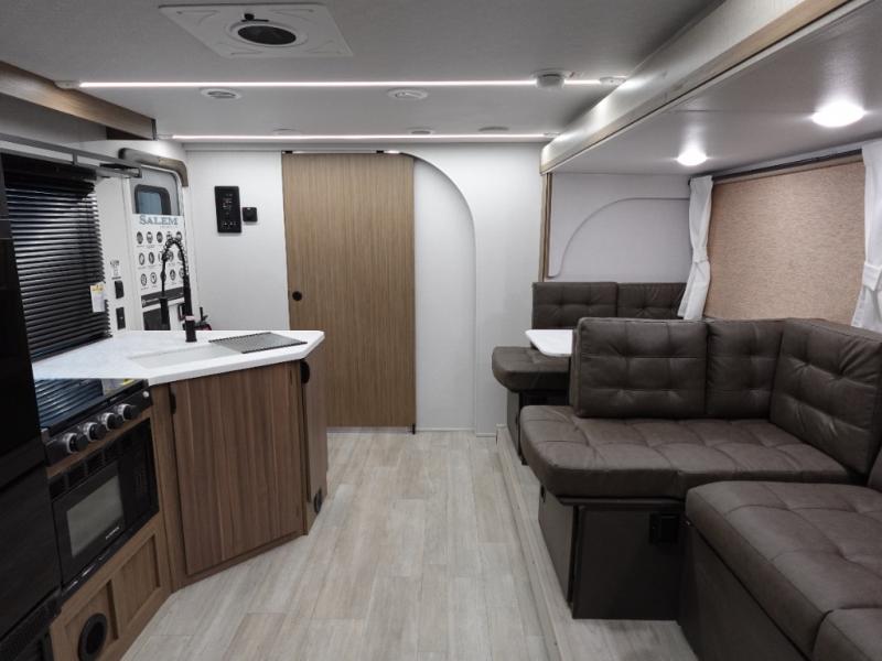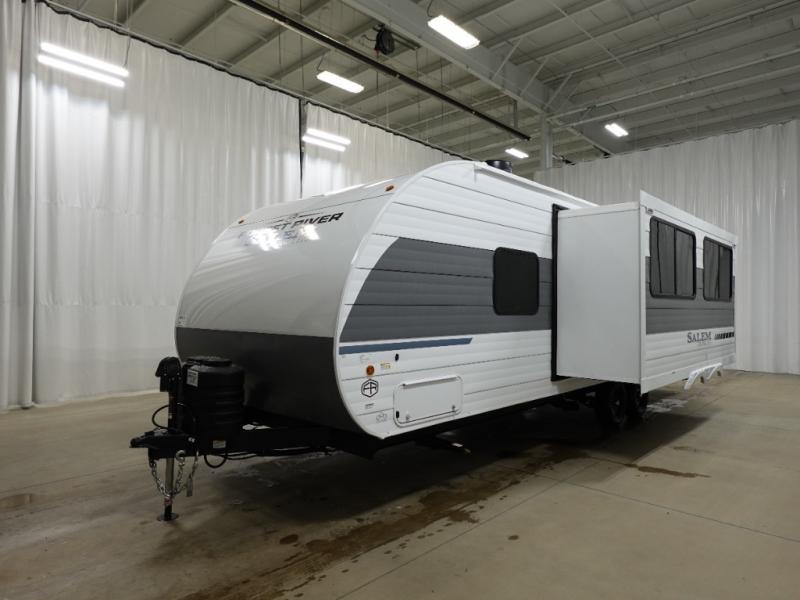 The Salem Cruise Lite travel trailers and toy haulers are value-minded units packed with great camping features! There are a variety of floorplans to choose from between three different regions. The enclosed Accessibelly will help protect against the elements and debris during transport, and the exterior retro/metal redesign is sure to be eye-catching! There are stylish roller shades inside, along with updated backsplash, elegant curtain rods and curtains, plus many more interior comforts! Choose a Salem Cruise Lite today for quality and value!