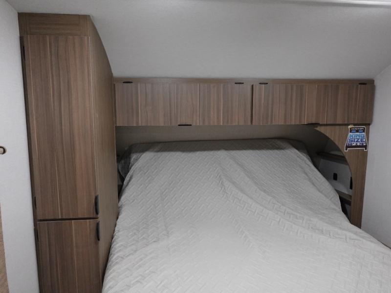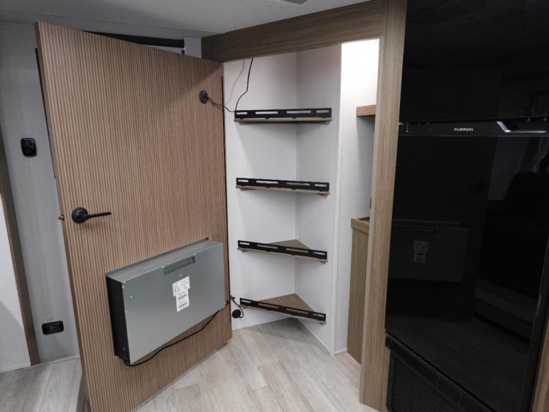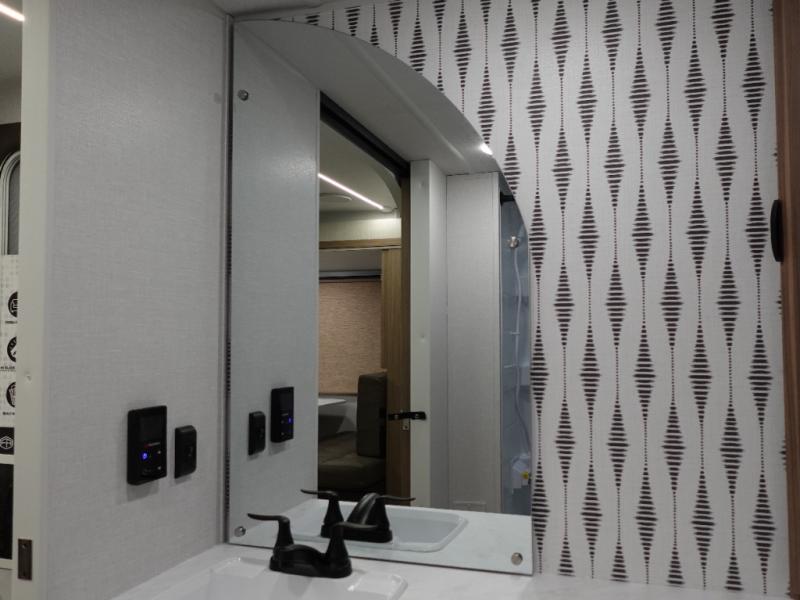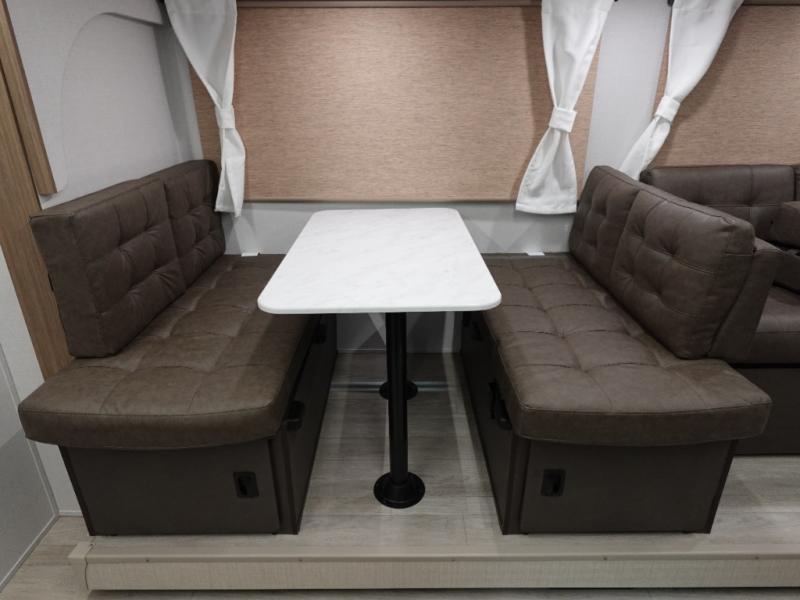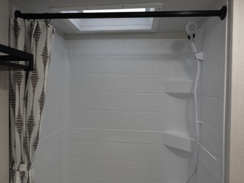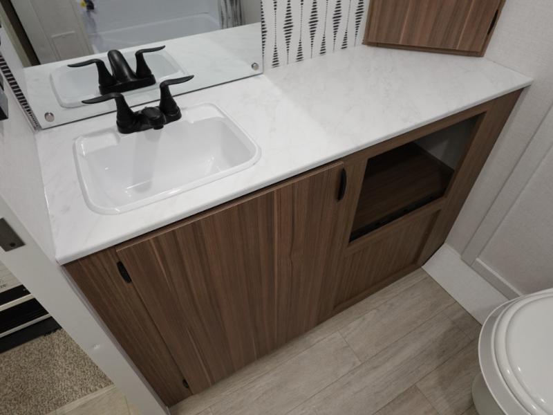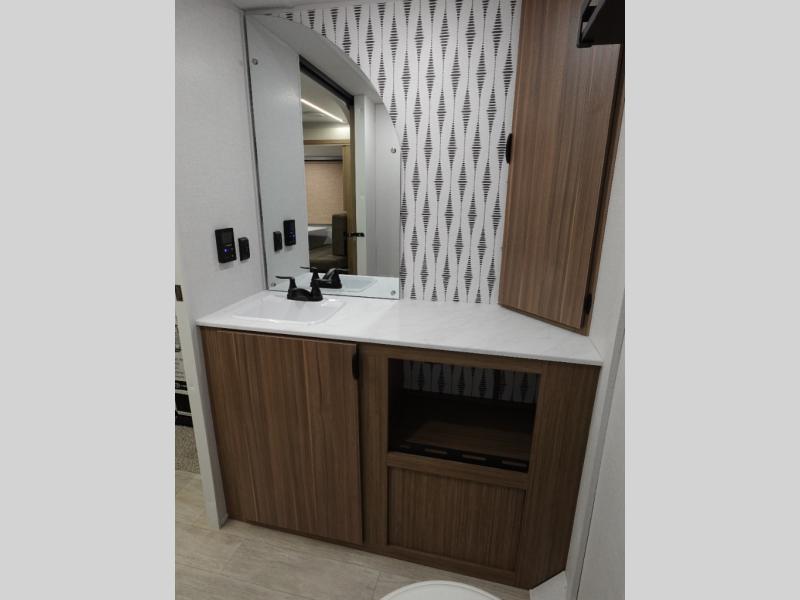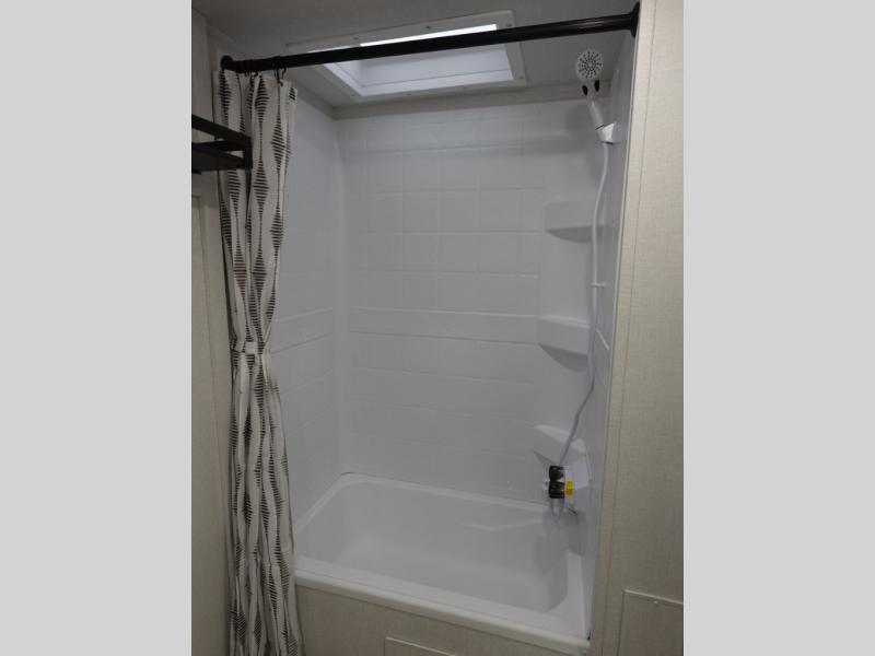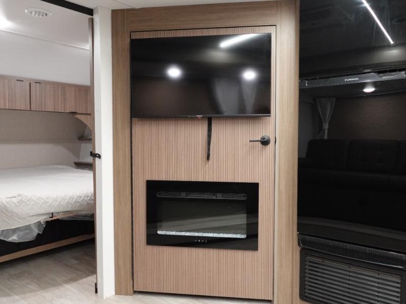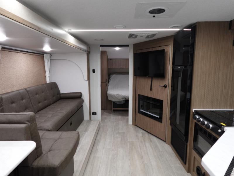 You're sure to make camping memories in this spacious travel trailer! You can sleep four to five people each night thanks to the the custom king bed with Versa Tilt in the front bedroom plus the Versa-Lounge and booth dinette within the large slide out! The full kitchen will let you make meals each day, and you'll appreciate the hidden pantry with shelves behind the fireplace. And don't overlook the full rear bath, complete with a tub/shower and ample counter space for your things.