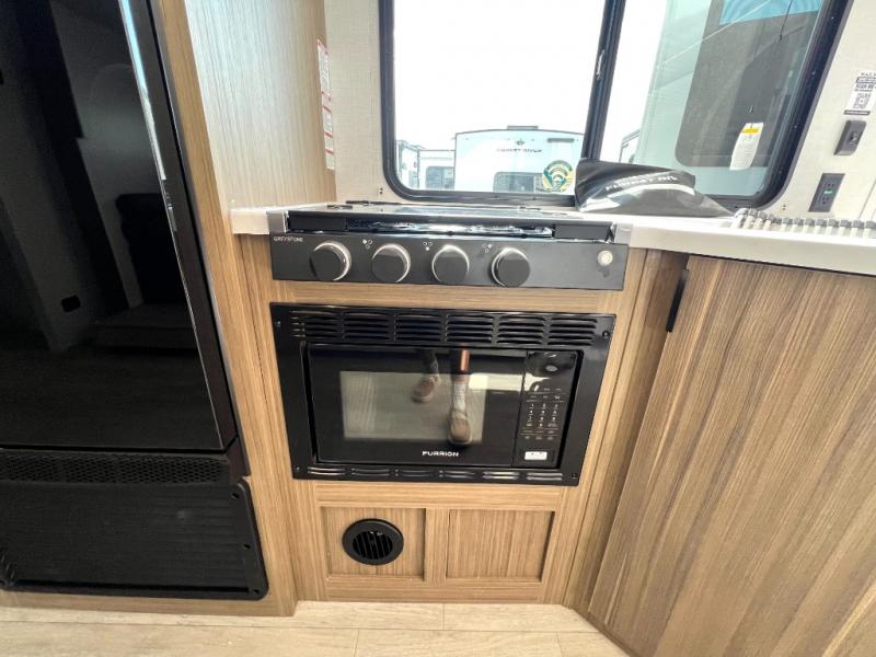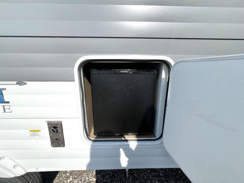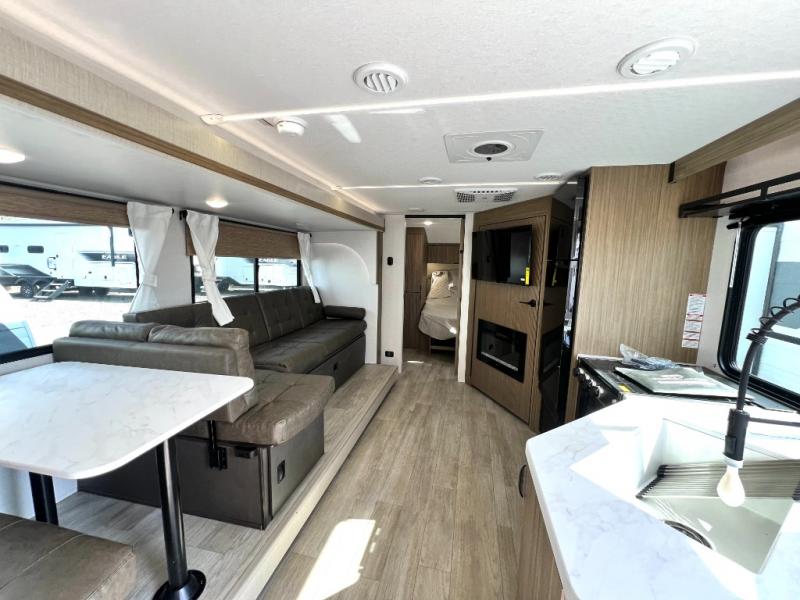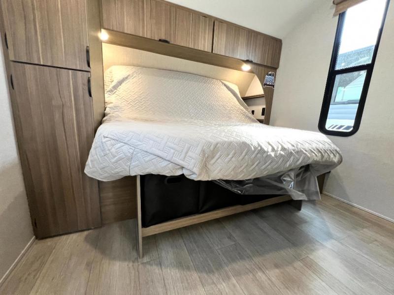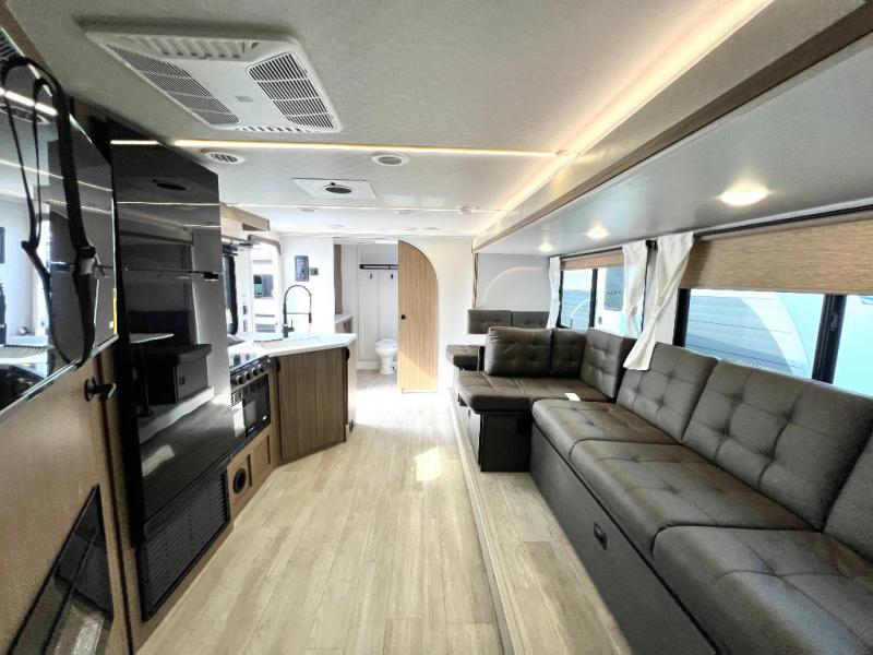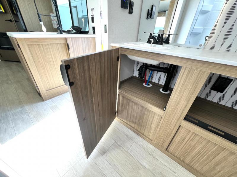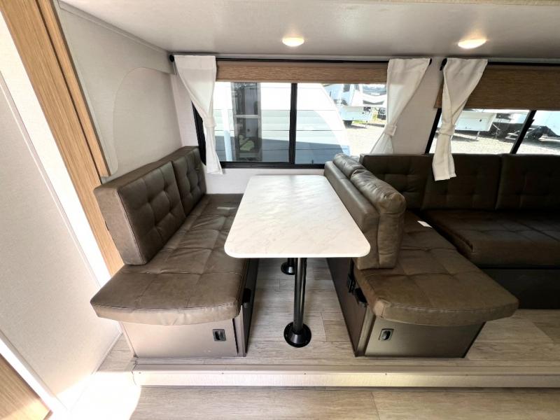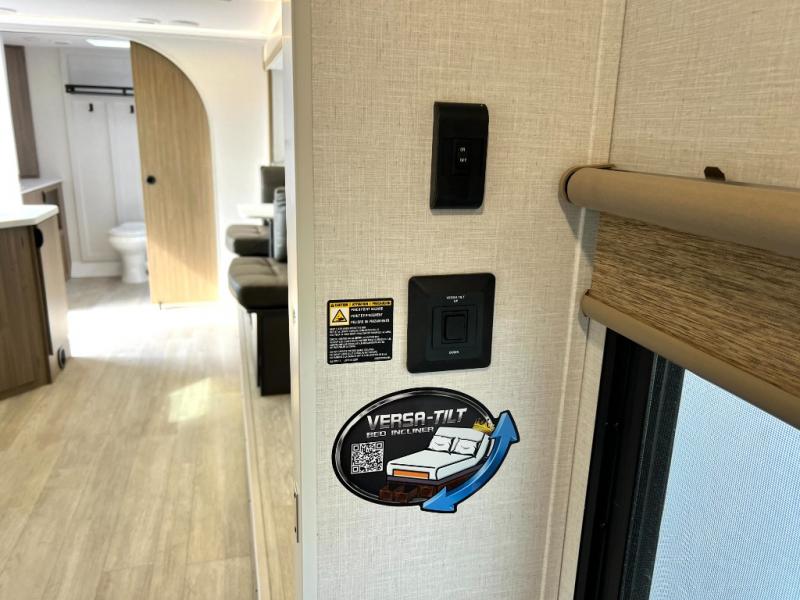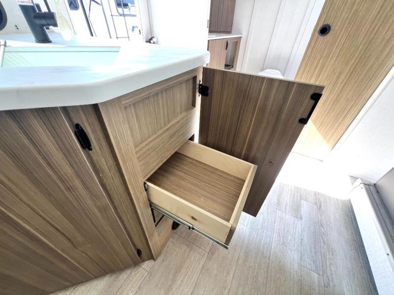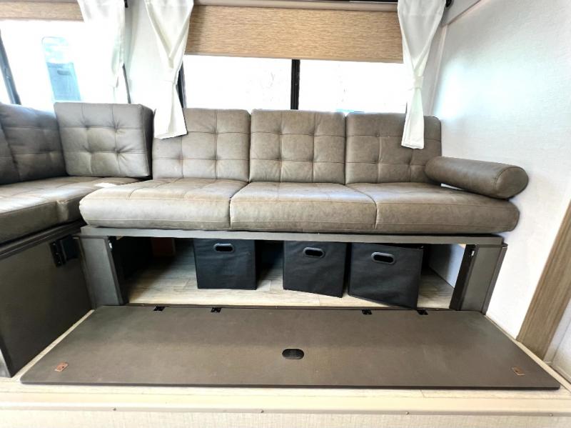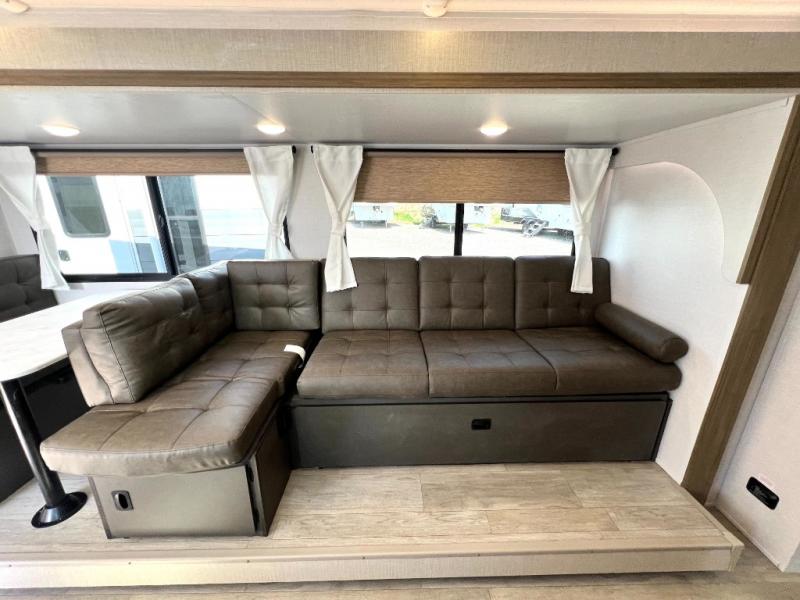 You're sure to make camping memories in this spacious travel trailer! You can sleep four to five people each night thanks to the the custom king bed with Versa Tilt in the front bedroom plus the Versa-Lounge and booth dinette within the large slide out! The full kitchen will let you make meals each day, and you'll appreciate the hidden pantry with shelves behind the fireplace. And don't overlook the full rear bath, complete with a tub/shower and ample counter space for your things.