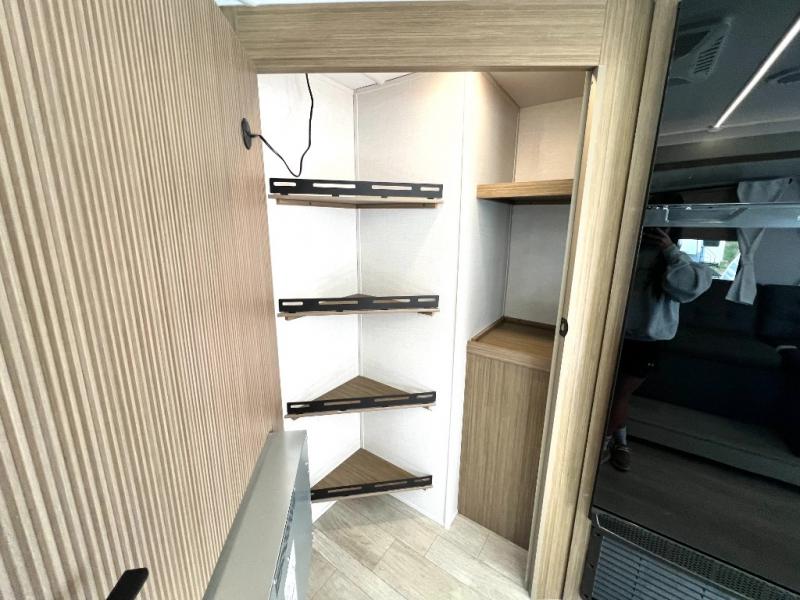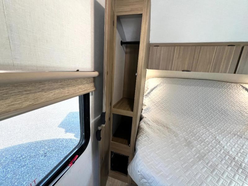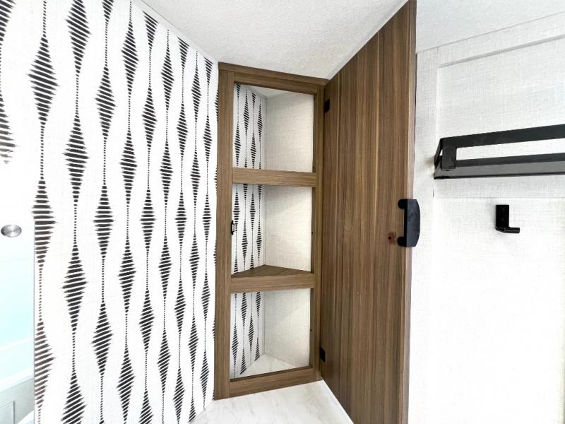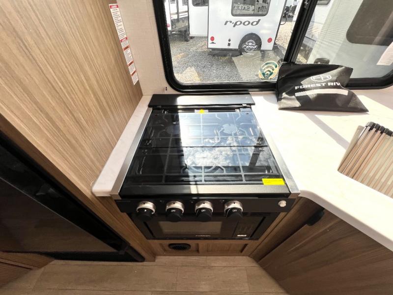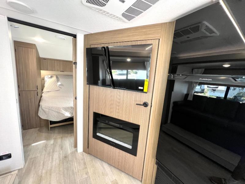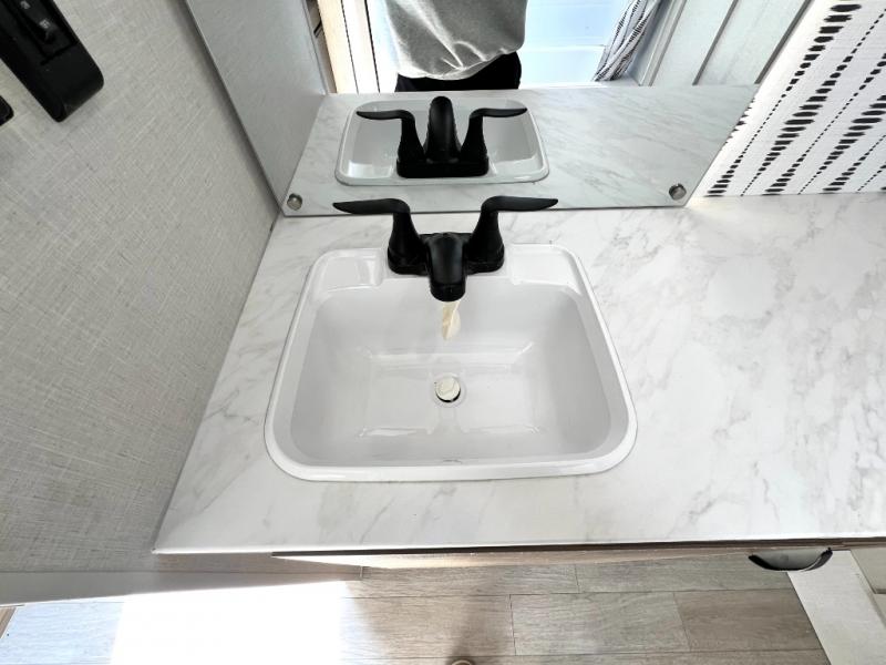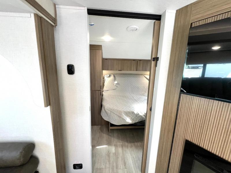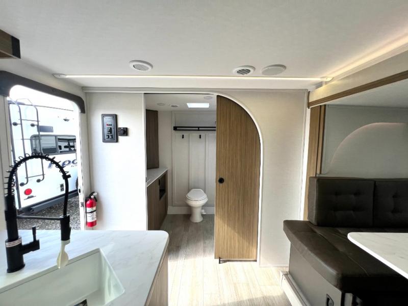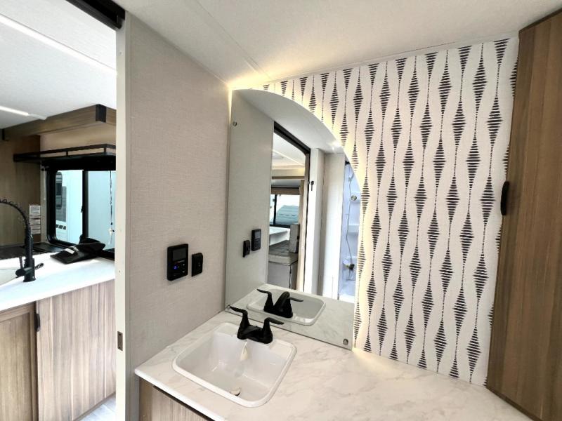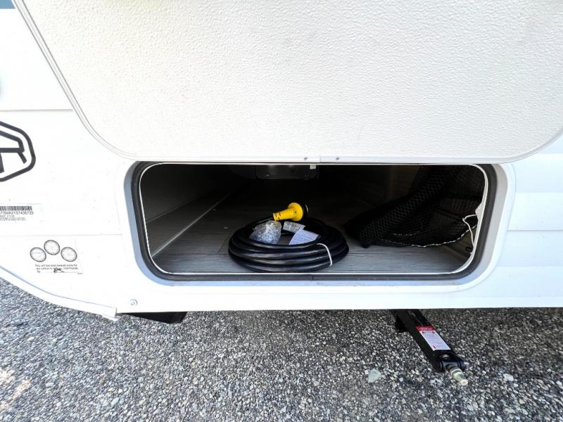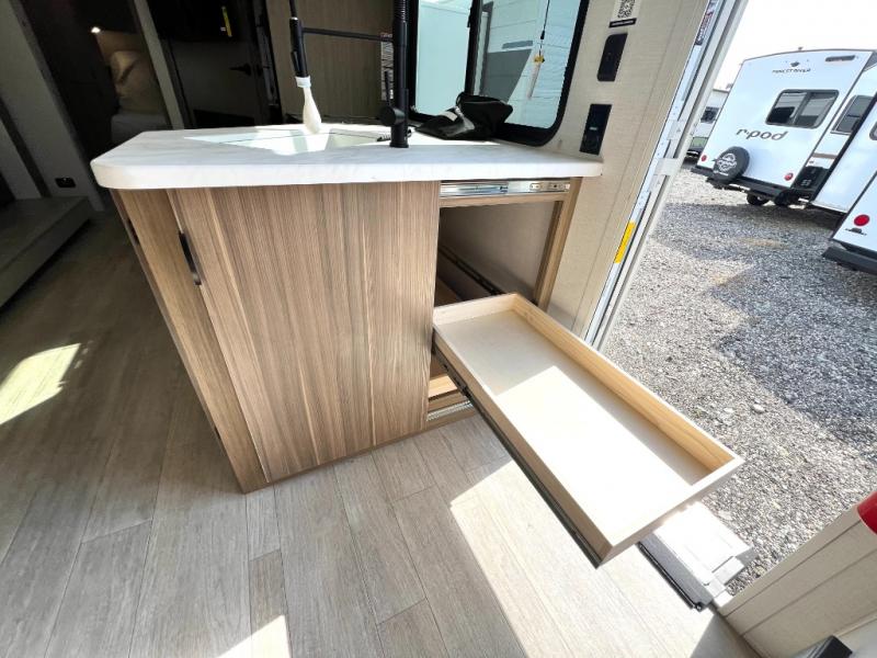You're sure to make camping memories in this spacious travel trailer! You can sleep four to five people each night thanks to the the custom king bed with Versa Tilt in the front bedroom plus the Versa-Lounge and booth dinette within the large slide out! The full kitchen will let you make meals each day, and you'll appreciate the hidden pantry with shelves behind the fireplace. And don't overlook the full rear bath, complete with a tub/shower and ample counter space for your things.
