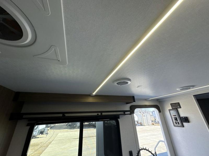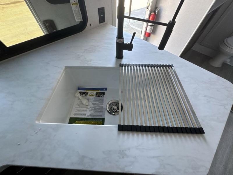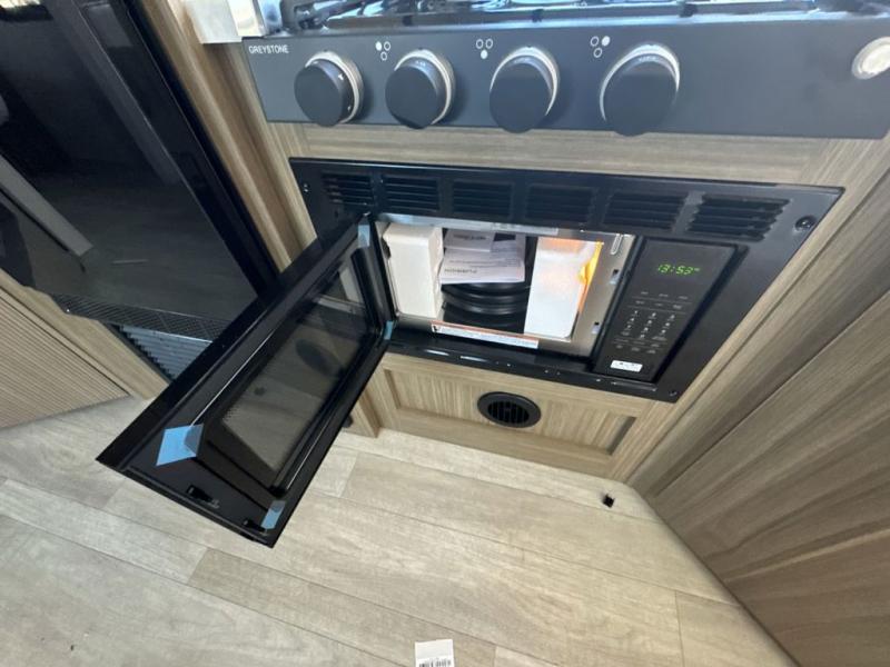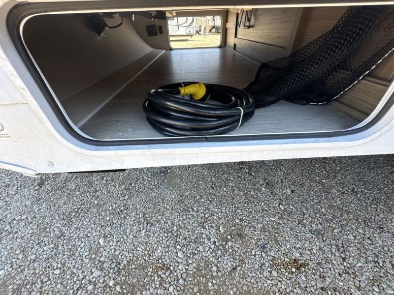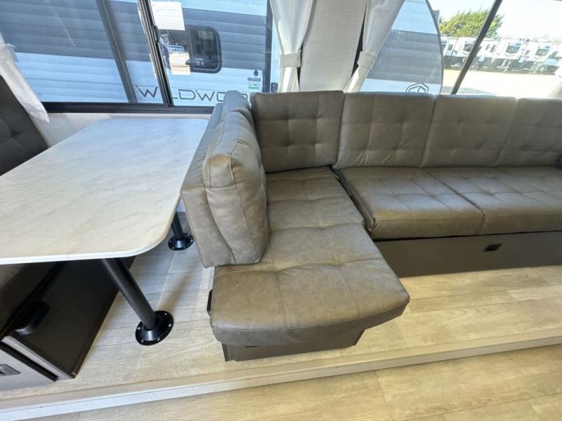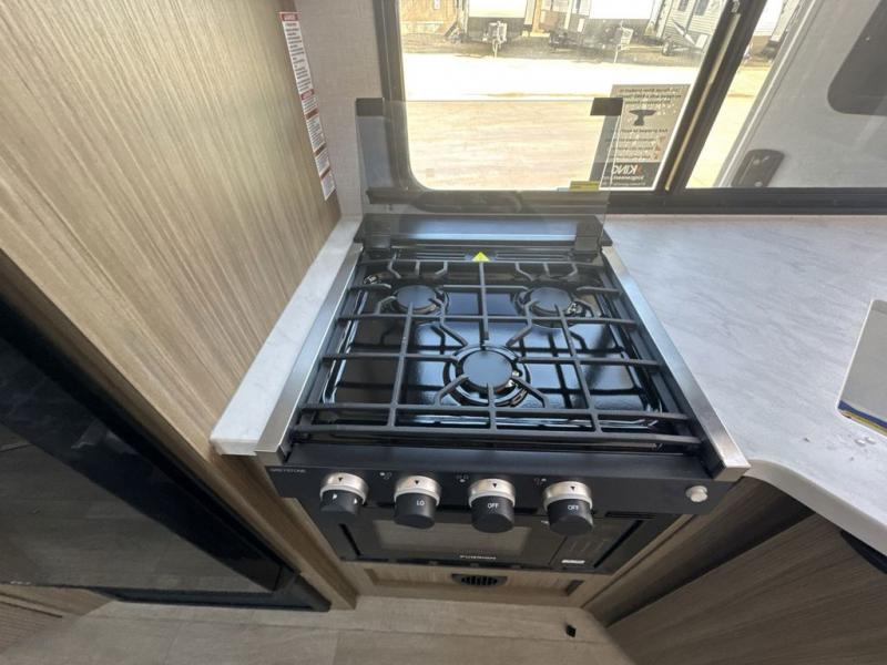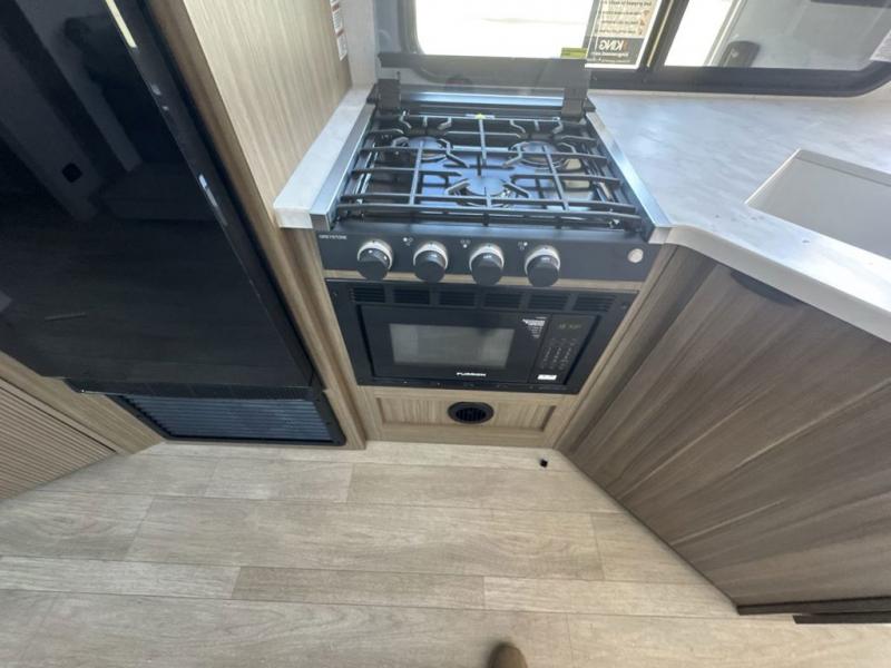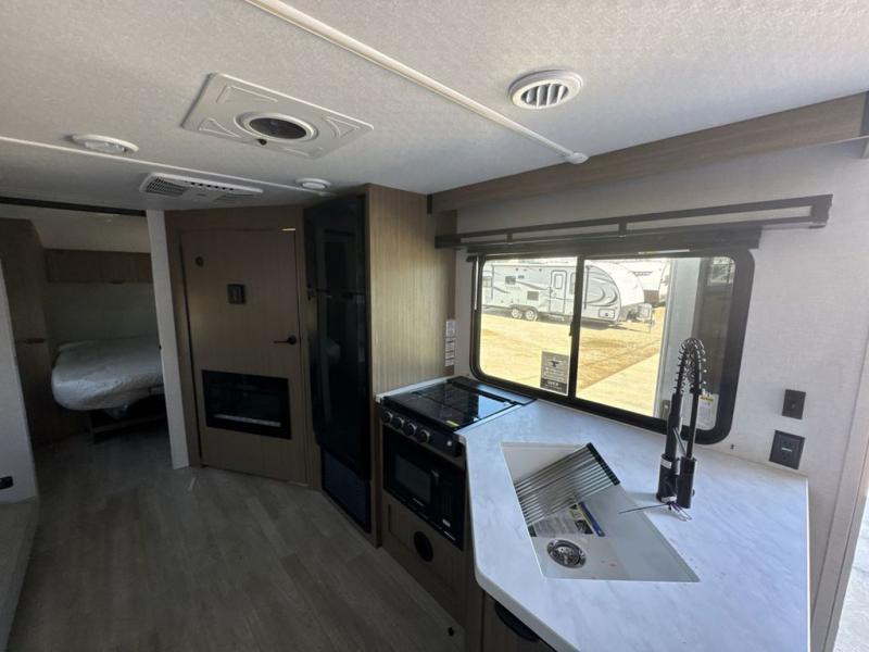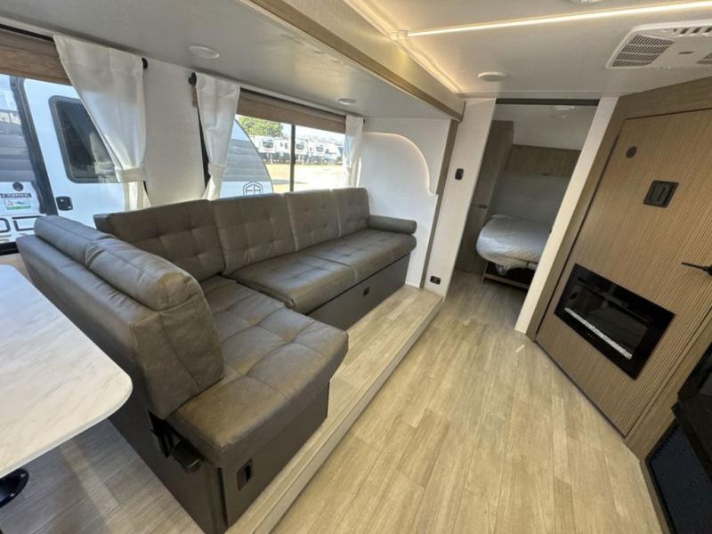 You're sure to make camping memories in this spacious travel trailer! You can sleep four to five people each night thanks to the the custom king bed with Versa Tilt in the front bedroom plus the Versa-Lounge and booth dinette within the large slide out! The full kitchen will let you make meals each day, and you'll appreciate the hidden pantry with shelves behind the fireplace. And don't overlook the full rear bath, complete with a tub/shower and ample counter space for your things.