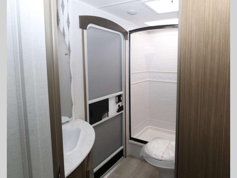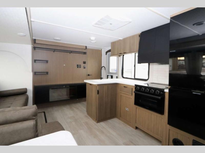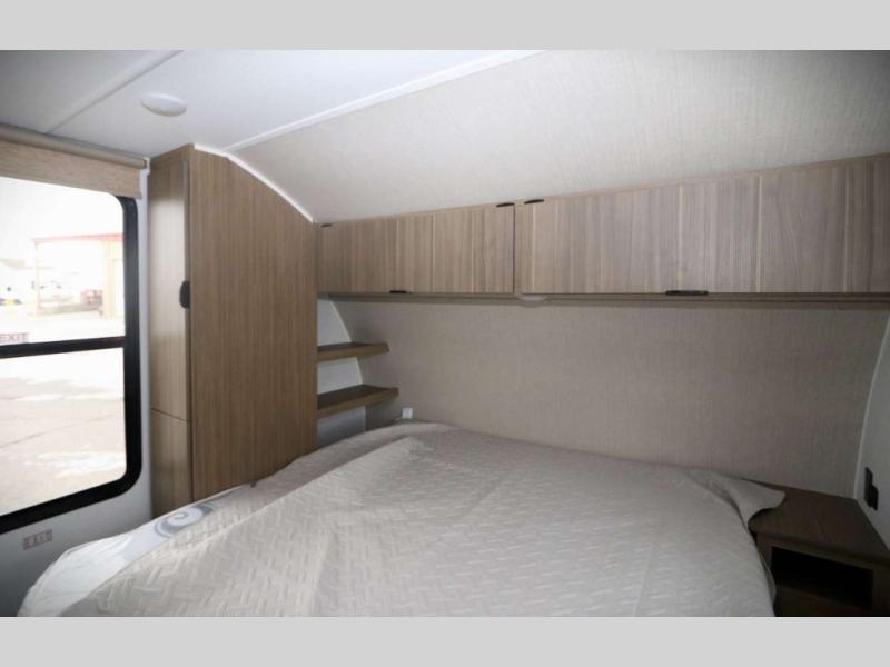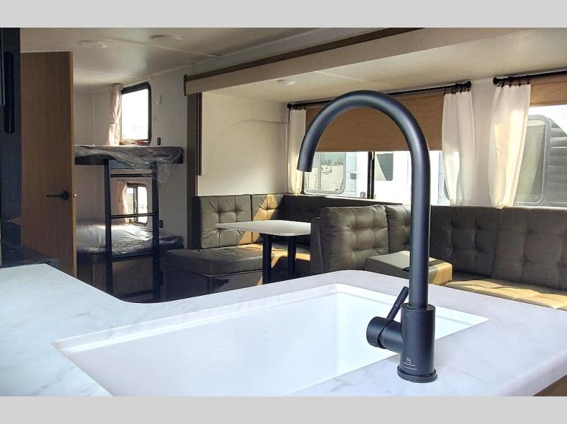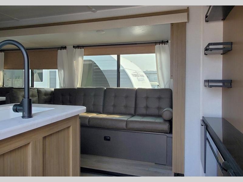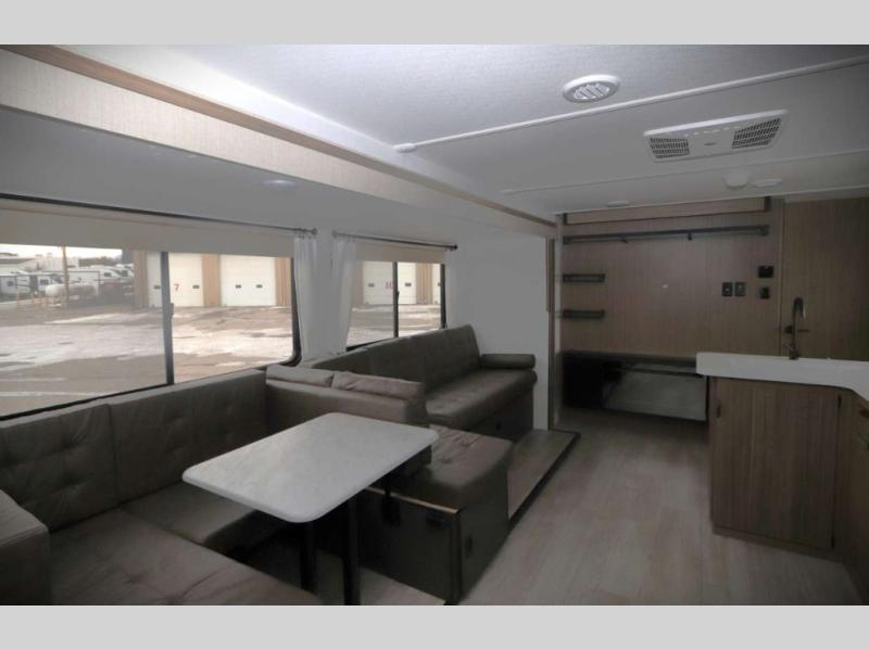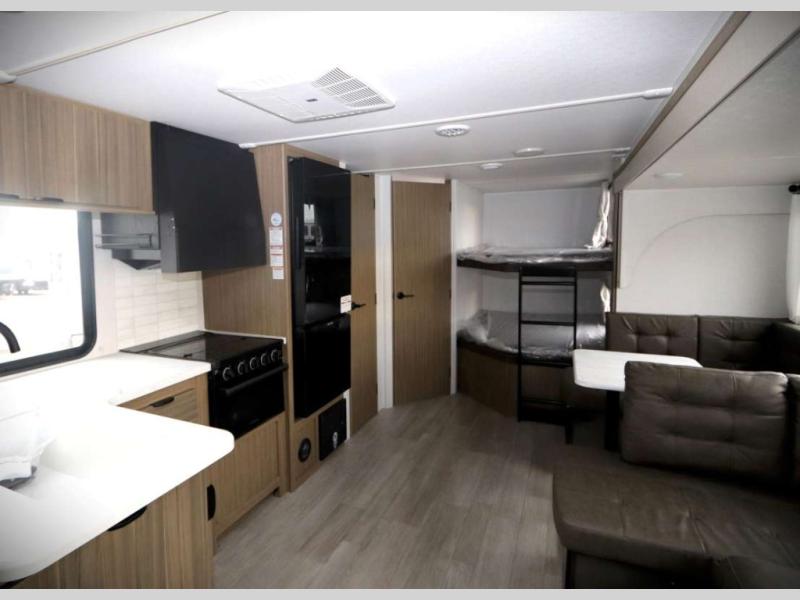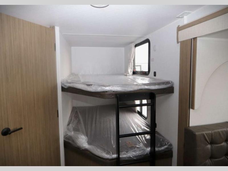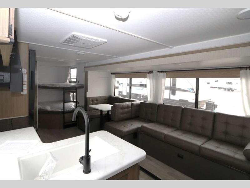 Step inside this dual entry travel trailer and see just how fun your next camping trip will be! The rear corner bathroom has a shower for you to start each morning feeling clean and fresh, and it even has an entrance/exit door to the unit so you can get back outside faster. The kids will love sleeping on the corner bunk beds and you will love having your own privacy with the front private bedroom. The Versa Lounge is next to the entertainment center with a fireplace for a relaxing evening indoors, and the U-shaped dinette is ready for you to enjoy a meal, play a card game or transform into an extra sleeping space.