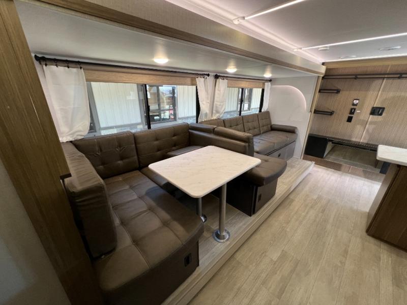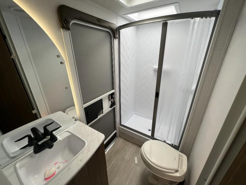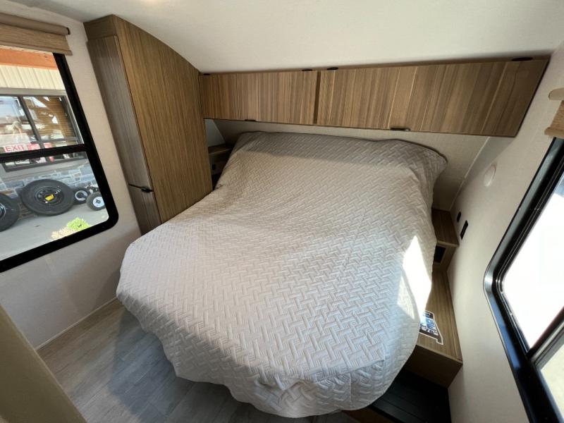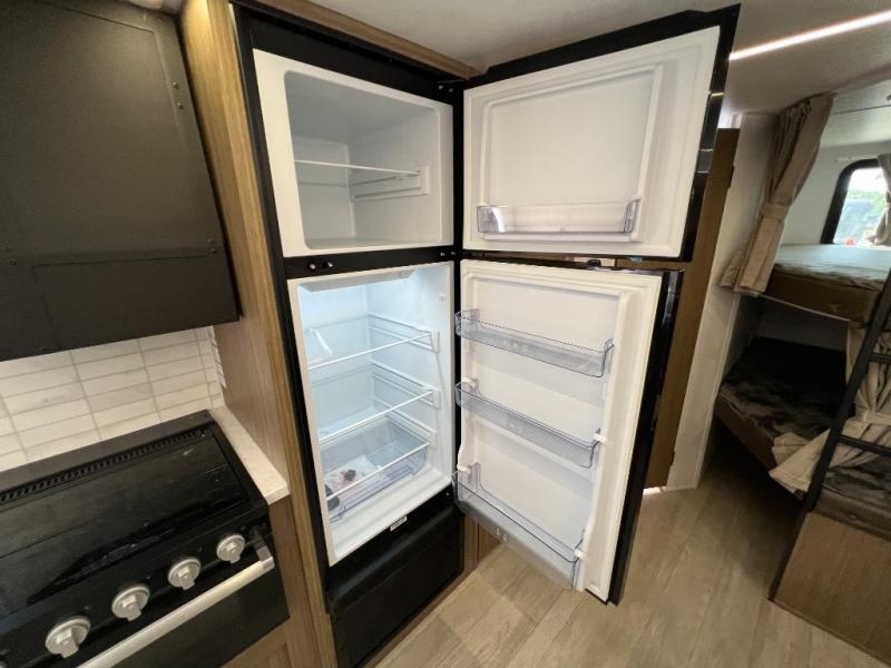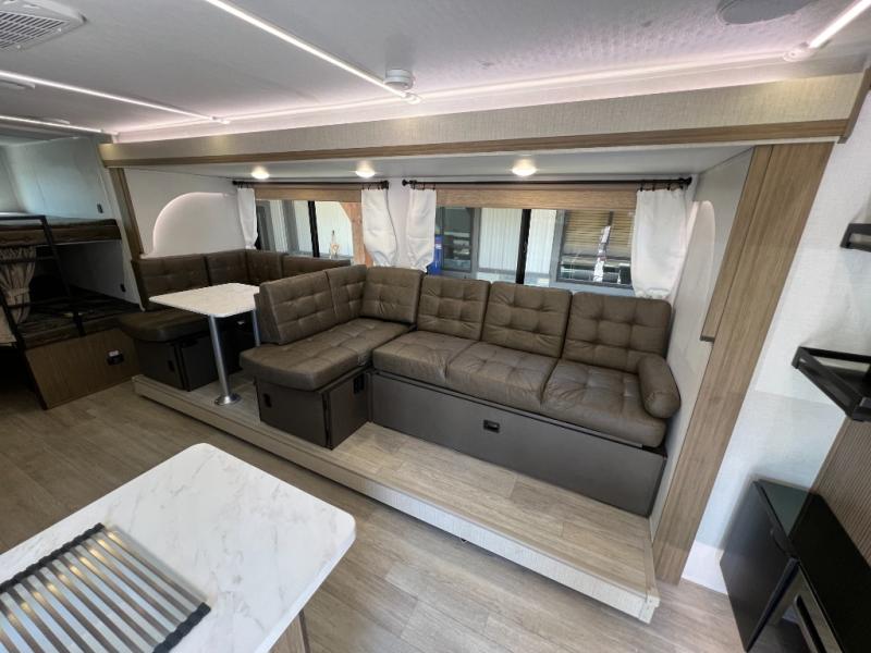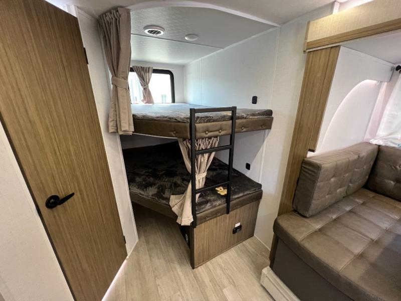 If you're looking for a travel trailer that will meet your family's needs then this one is for you! The kiddos will enjoy a good night's rest on the rear corner double-size bunk beds and you will enjoy a good night's rest on the custom king bed with Versa Tilt inside the front private bedroom. You can also transform the U-shaped dinette and Versa-lounge into extra sleeping spaces. One of the dual entrances leads directly into the rear corner bathroom which has a walk-in shower for you to get squeaky clean each morning. The walk-in pantry is big enough to store your favorite snacks and the oversized refrigerator will keep your beverages nice and cold. There is also an exterior camp kitchen you are sure to love!