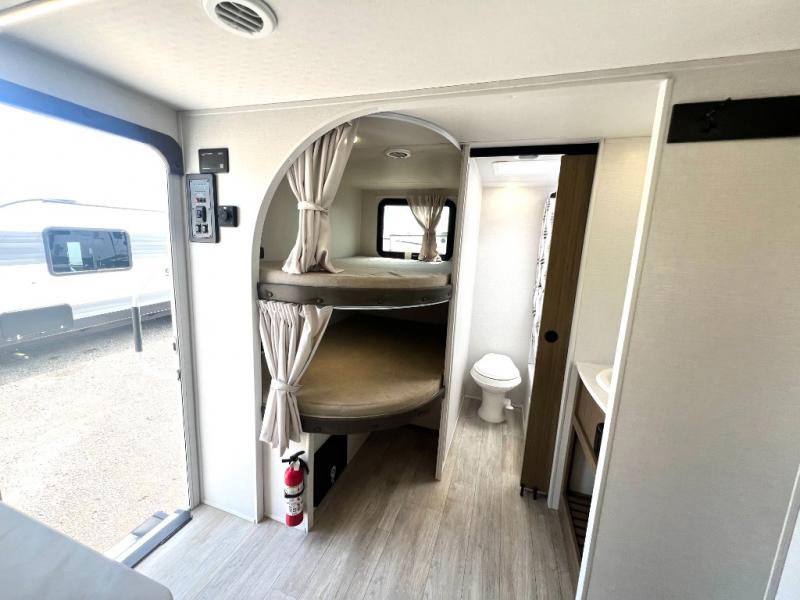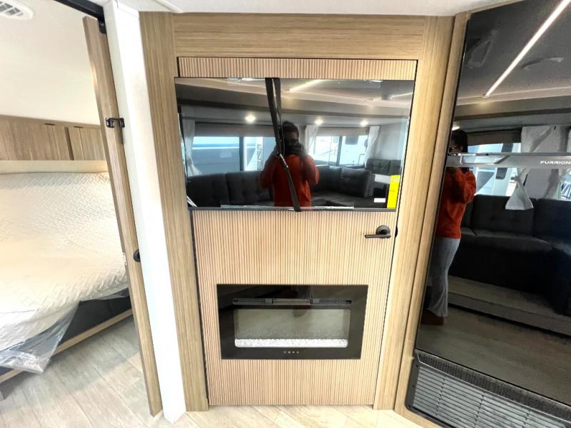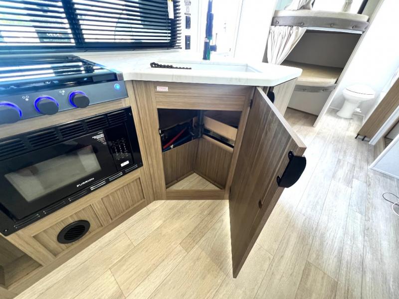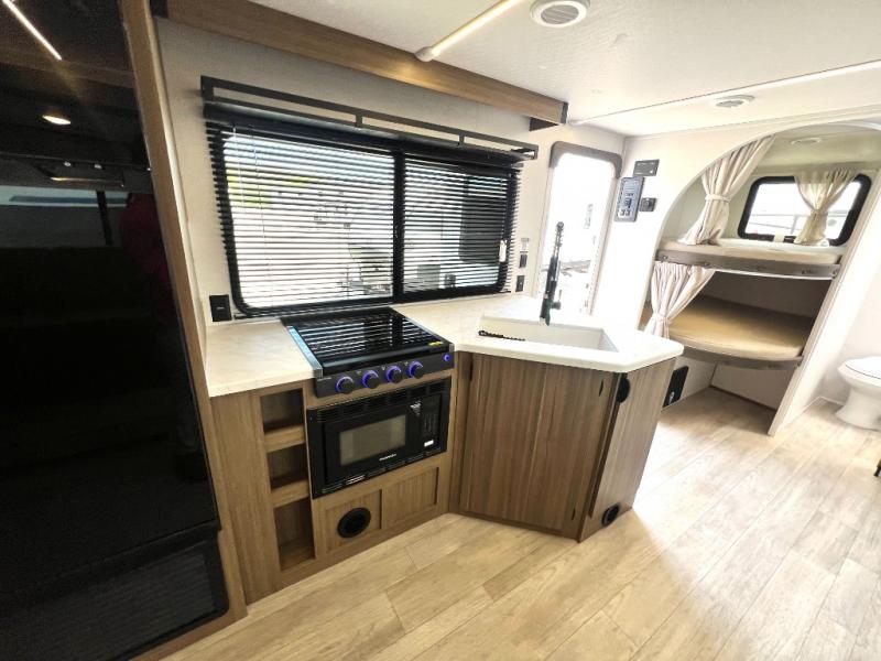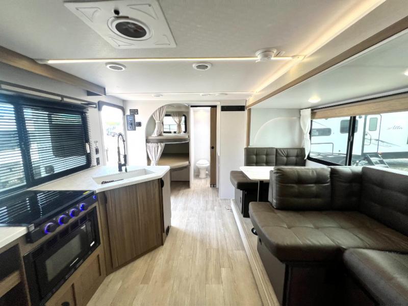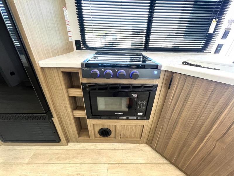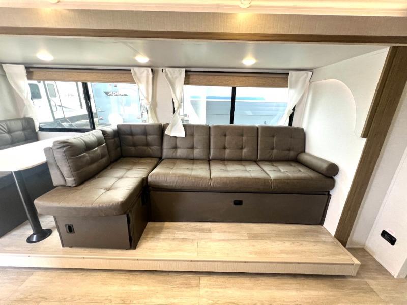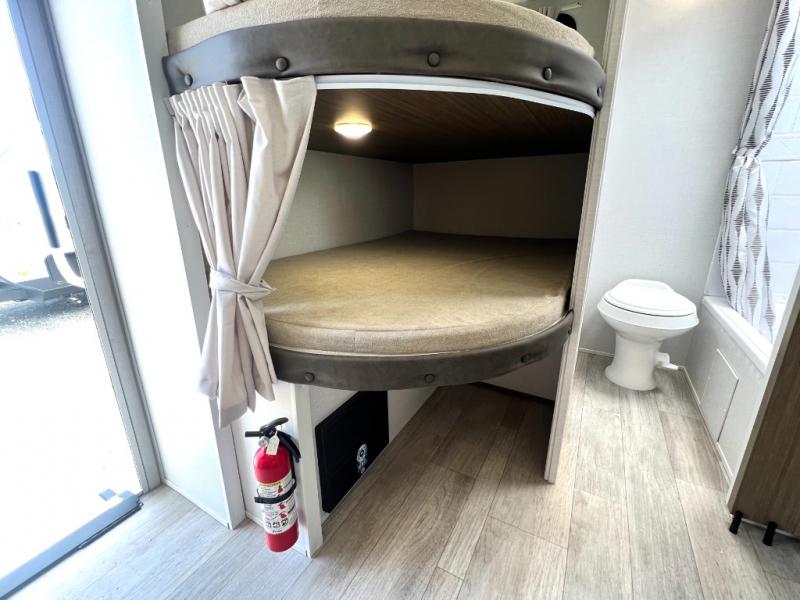 You're sure to make camping memories in this spacious travel trailer! You can easily sleep eight people each night thanks to the double-size bunks, the custom king bed with Versa Tilt in the front bedroom plus the Versa-Lounge within the large slide out! The cooktop and microwave oven will let you make meals each day, and you'll appreciate the hidden pantry with shelves behind the fireplace. There is also a booth dinette where you can dine together or play a game of cards after dinner is cleaned up, or you may just find yourselves outdoors under the 18' awning with 4K blade lighting. And don't overlook the full bath, complete with a tub/shower that will make bath time easier if you have little ones.