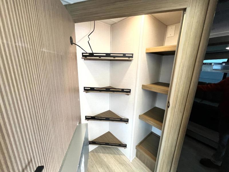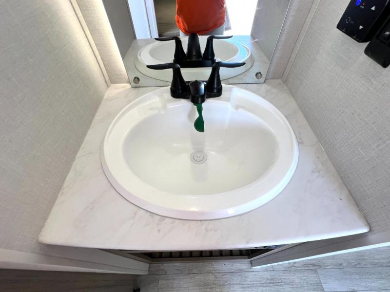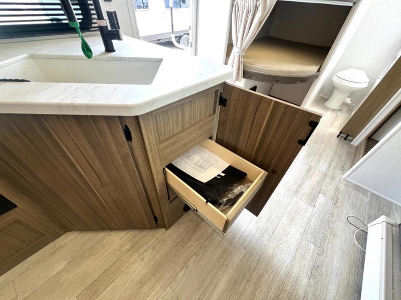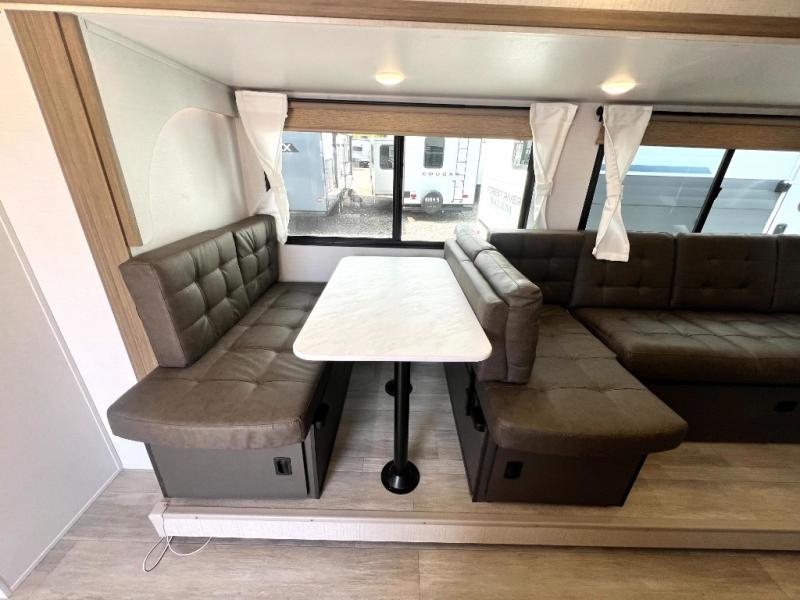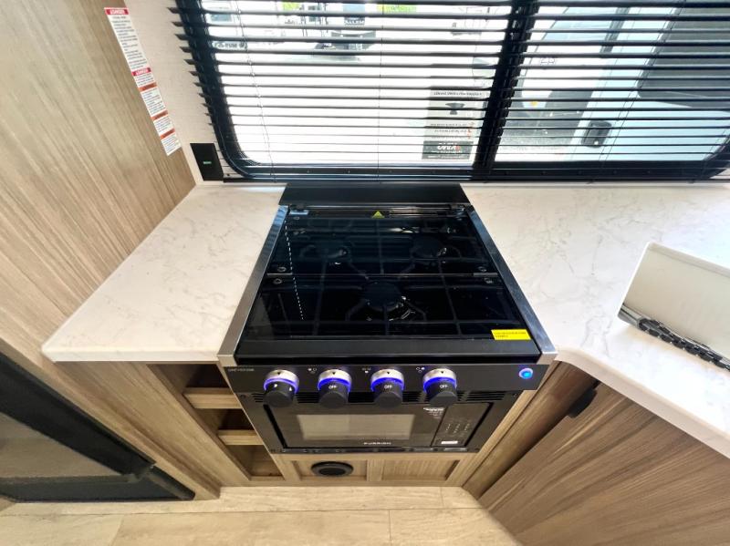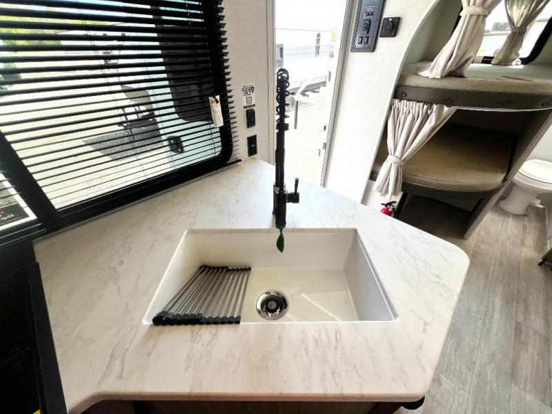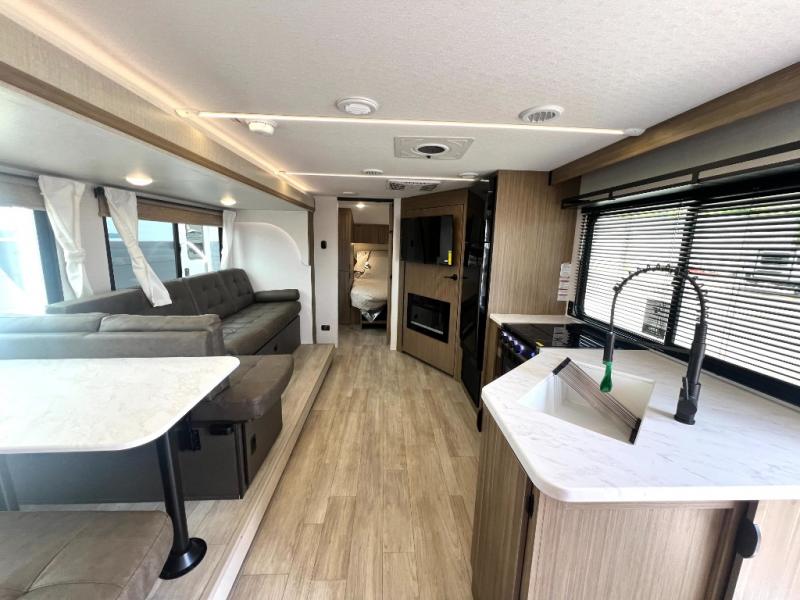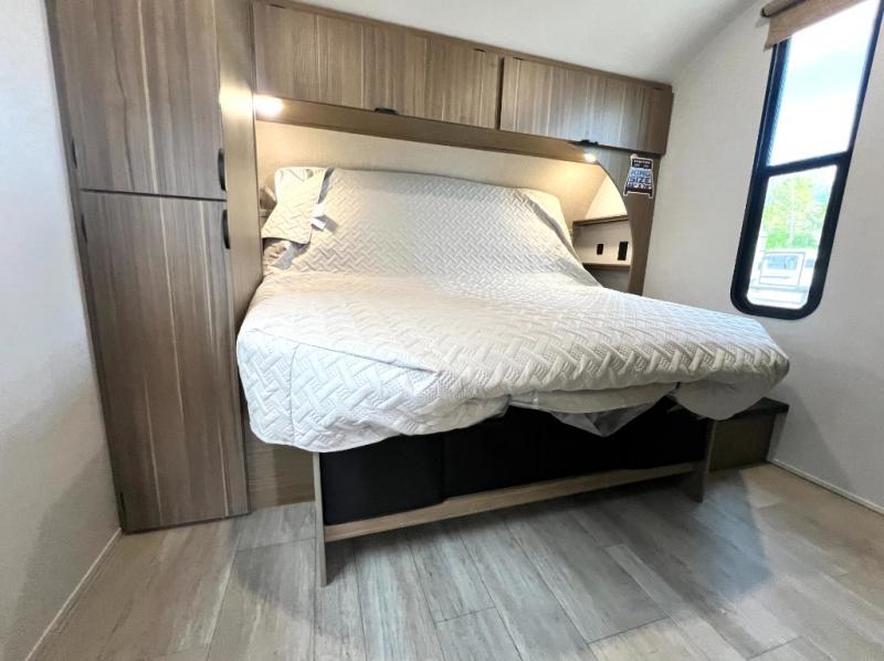 You're sure to make camping memories in this spacious travel trailer! You can easily sleep eight people each night thanks to the double-size bunks, the custom king bed with Versa Tilt in the front bedroom plus the Versa-Lounge within the large slide out! The cooktop and microwave oven will let you make meals each day, and you'll appreciate the hidden pantry with shelves behind the fireplace. There is also a booth dinette where you can dine together or play a game of cards after dinner is cleaned up, or you may just find yourselves outdoors under the 18' awning with 4K blade lighting. And don't overlook the full bath, complete with a tub/shower that will make bath time easier if you have little ones.