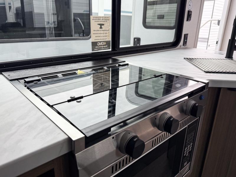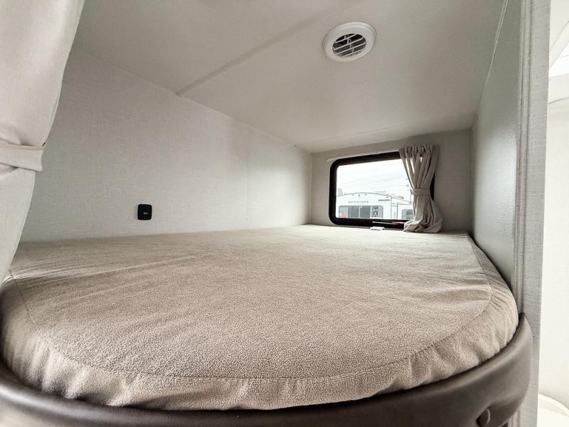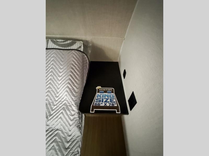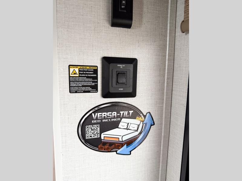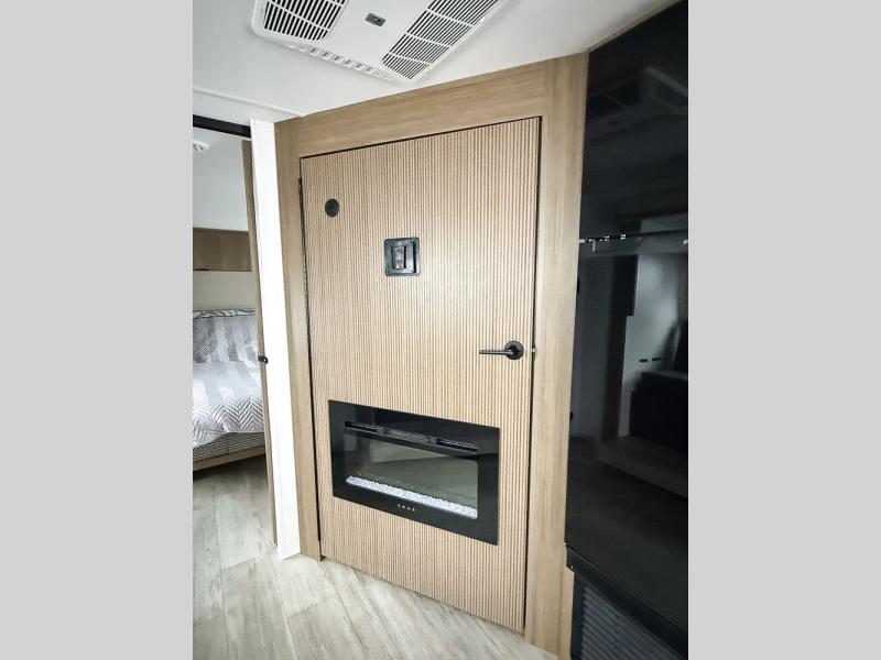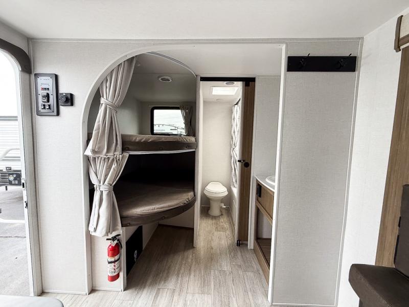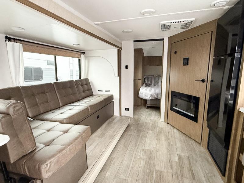 You're sure to make camping memories in this spacious travel trailer! You can easily sleep eight people each night thanks to the double-size bunks, the custom king bed with Versa Tilt in the front bedroom plus the Versa-Lounge within the large slide out! The cooktop and microwave oven will let you make meals each day, and you'll appreciate the hidden pantry with shelves behind the fireplace. There is also a booth dinette where you can dine together or play a game of cards after dinner is cleaned up, or you may just find yourselves outdoors under the 18' awning with 4K blade lighting. And don't overlook the full bath, complete with a tub/shower that will make bath time easier if you have little ones.