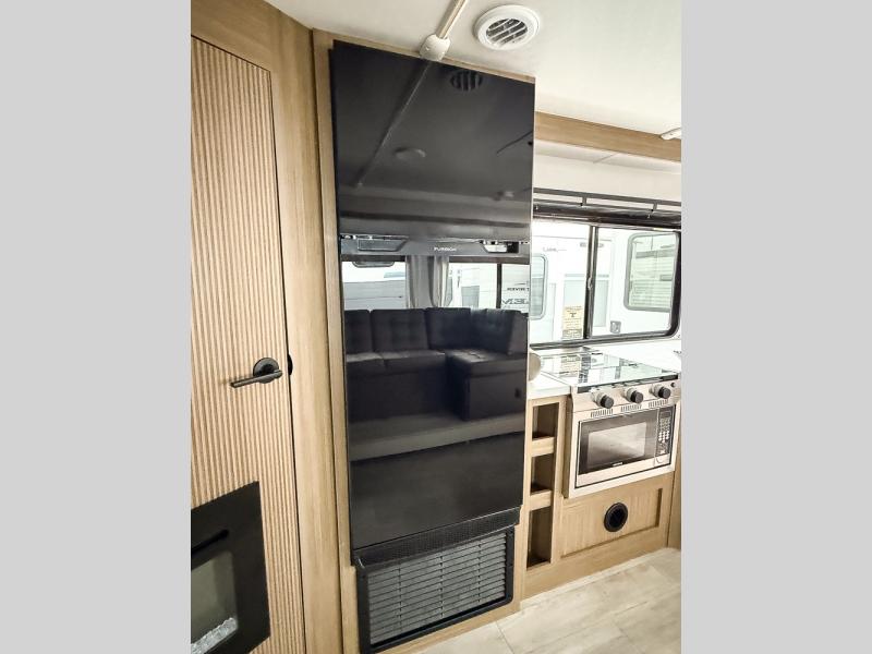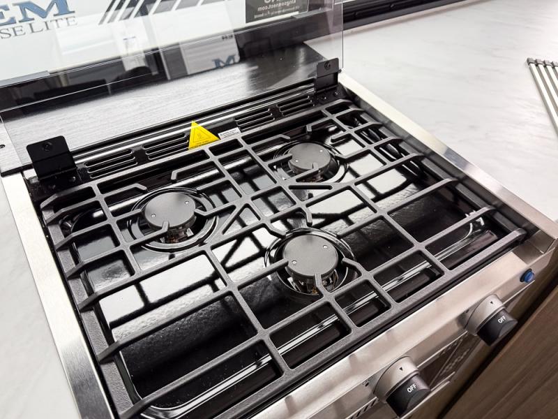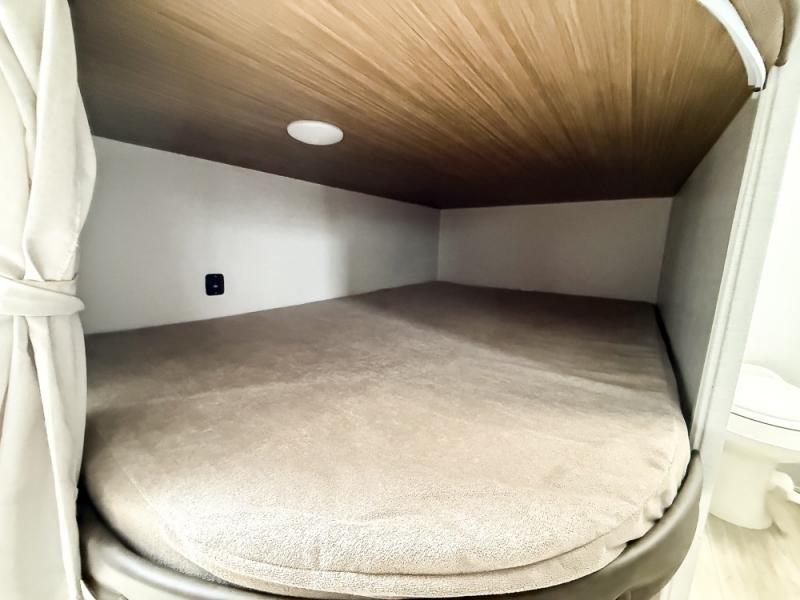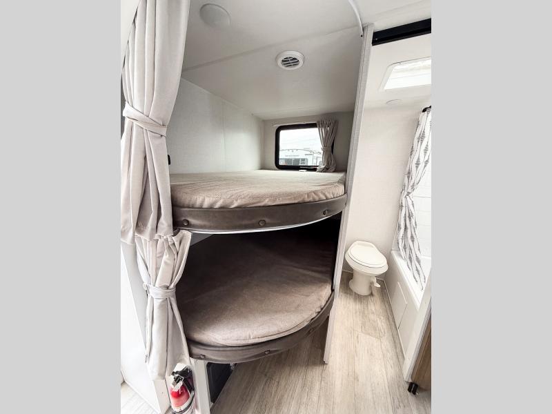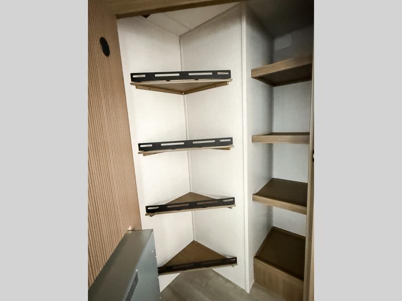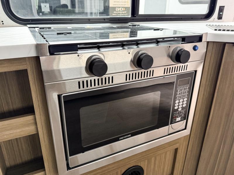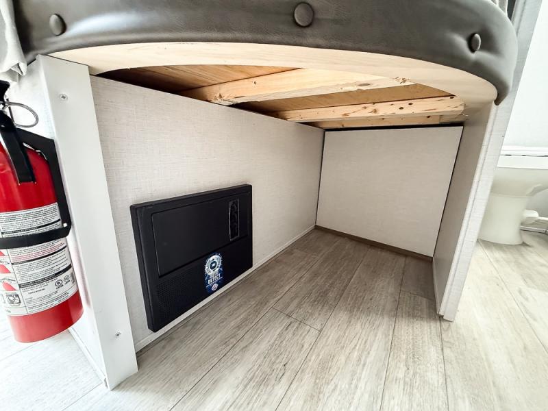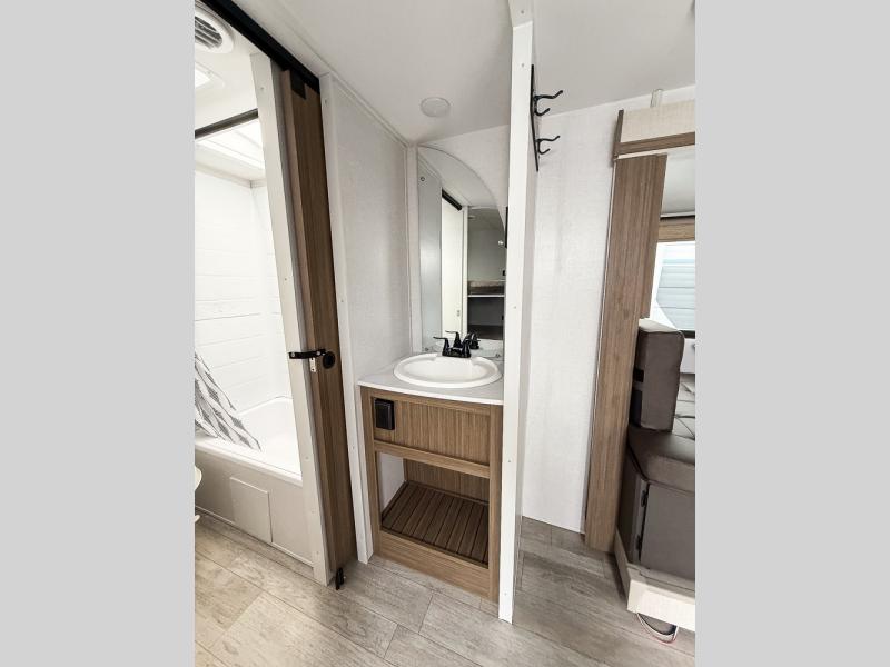 You're sure to make camping memories in this spacious travel trailer! You can easily sleep eight people each night thanks to the double-size bunks, the custom king bed with Versa Tilt in the front bedroom plus the Versa-Lounge within the large slide out! The cooktop and microwave oven will let you make meals each day, and you'll appreciate the hidden pantry with shelves behind the fireplace. There is also a booth dinette where you can dine together or play a game of cards after dinner is cleaned up, or you may just find yourselves outdoors under the 18' awning with 4K blade lighting. And don't overlook the full bath, complete with a tub/shower that will make bath time easier if you have little ones.