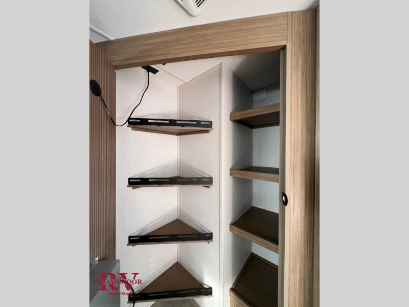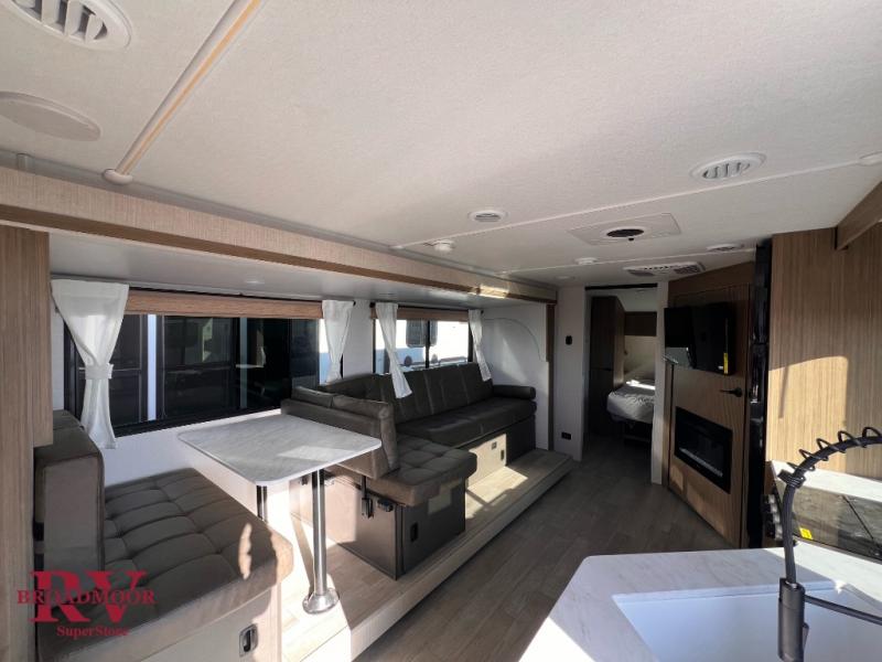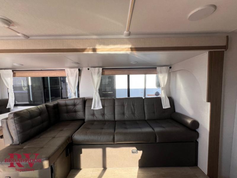 You're sure to make camping memories in this spacious travel trailer! You can easily sleep eight people each night thanks to the double-size bunks, the custom king bed with Versa Tilt in the front bedroom plus the Versa-Lounge within the large slide out! The cooktop and microwave oven will let you make meals each day, and you'll appreciate the hidden pantry with shelves behind the fireplace. There is also a booth dinette where you can dine together or play a game of cards after dinner is cleaned up, or you may just find yourselves outdoors under the 18' awning with 4K blade lighting. And don't overlook the full bath, complete with a tub/shower that will make bath time easier if you have little ones.