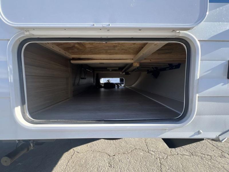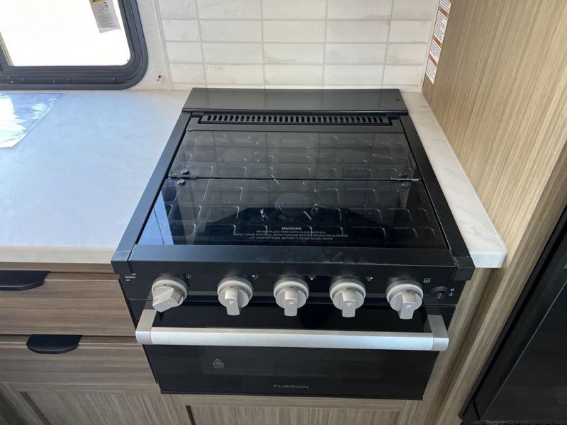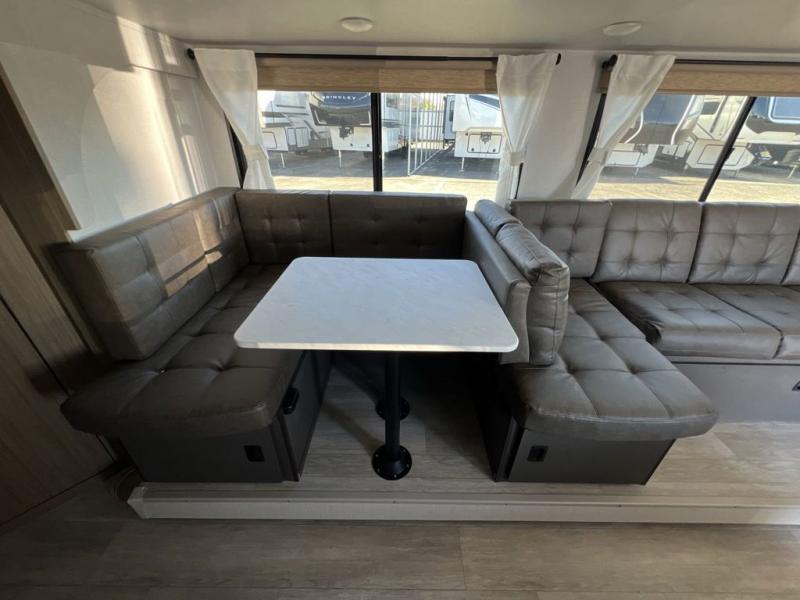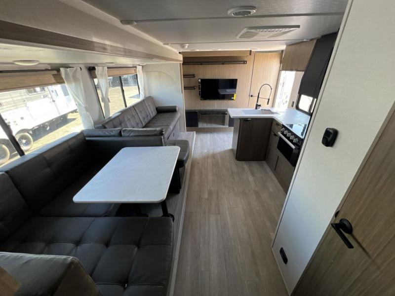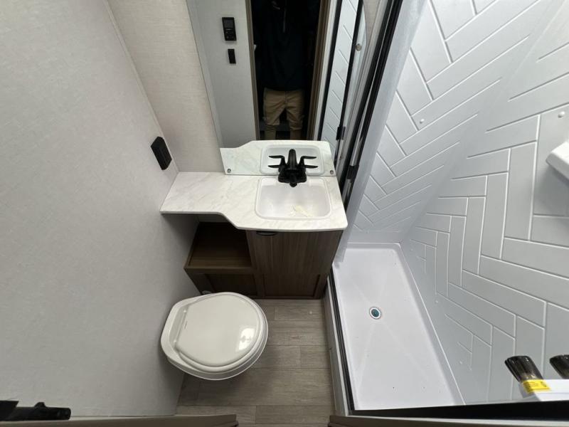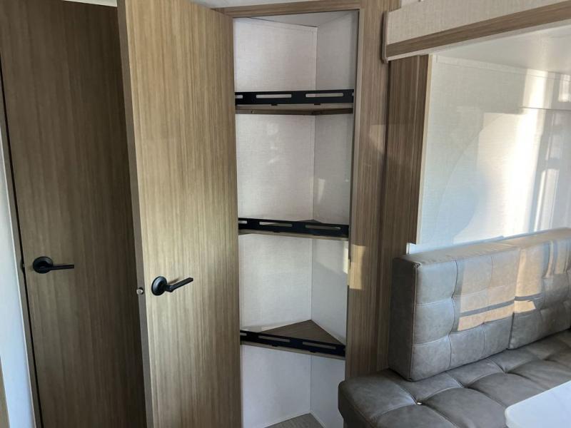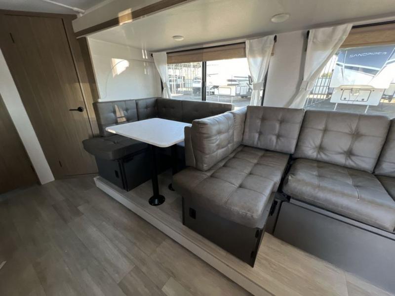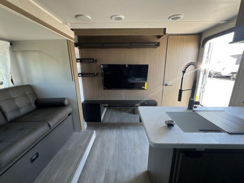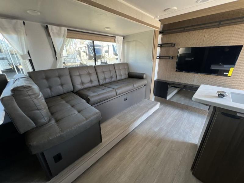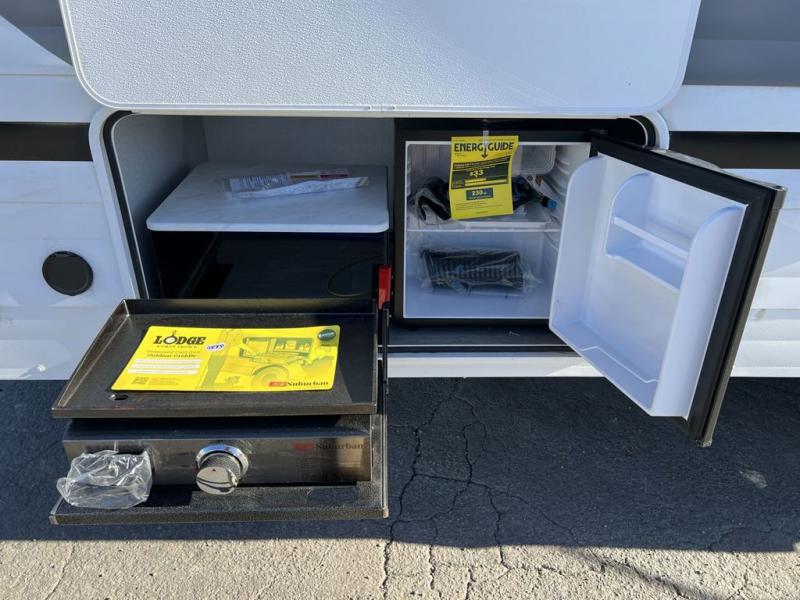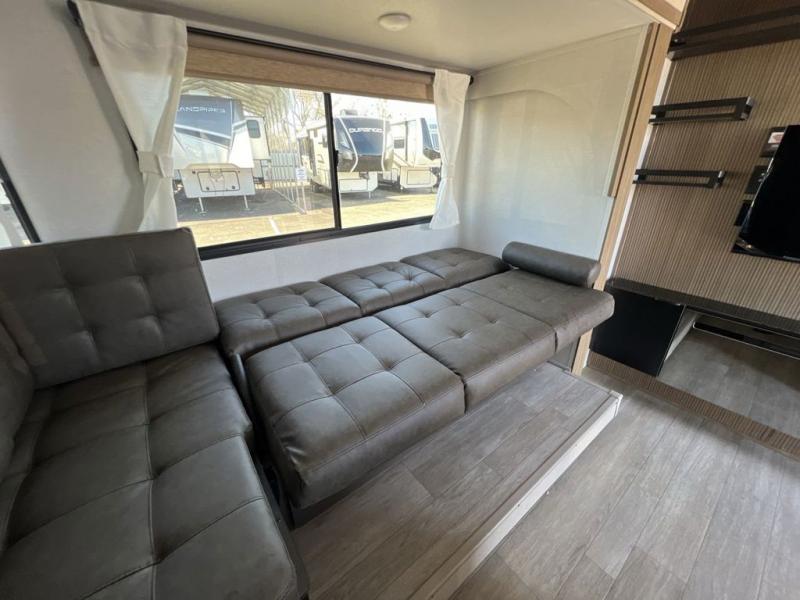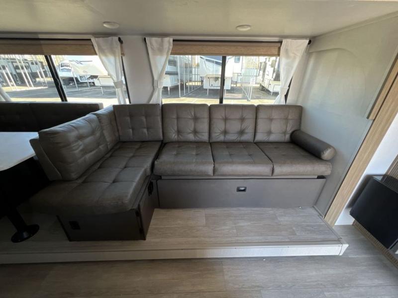 This versatile bunkhouse travel trailer is big enough for the whole family! The private bunkhouse has a set of 30" x 74" bunk beds and a 30" x 74" bunk bed above a Jiffy sofa. Just outside the bunkhouse is a pantry big enough to store everyone's favorite snacks, and a full bathroom with a walk-in shower. The cooktop is just waiting for you to create a delicious meal, and the U-shaped dinette welcomes everyone to enjoy each meal in comfort, plus there is a large panoramic window for a perfect view of your surroundings. Any time of day kick back on the Versa-lounge and relax by the fireplace at the entertainment center. The exterior features a pass-through storage area for you to keep your outdoor camping gear stowed away when not in use, a 16' awning to protect you, and an exterior camp kitchen!