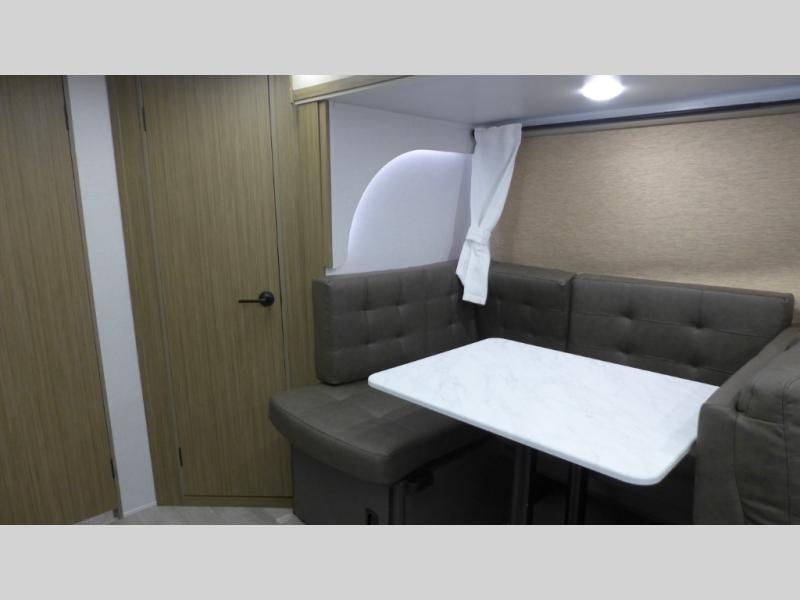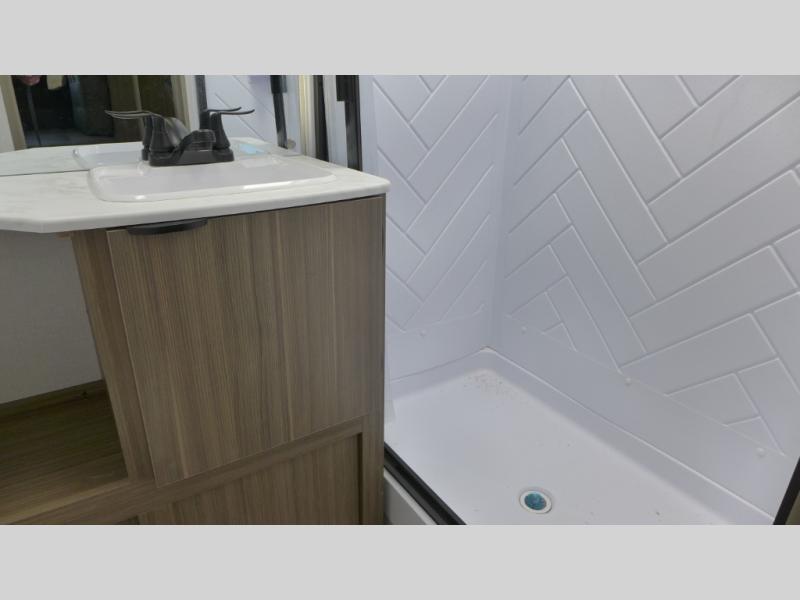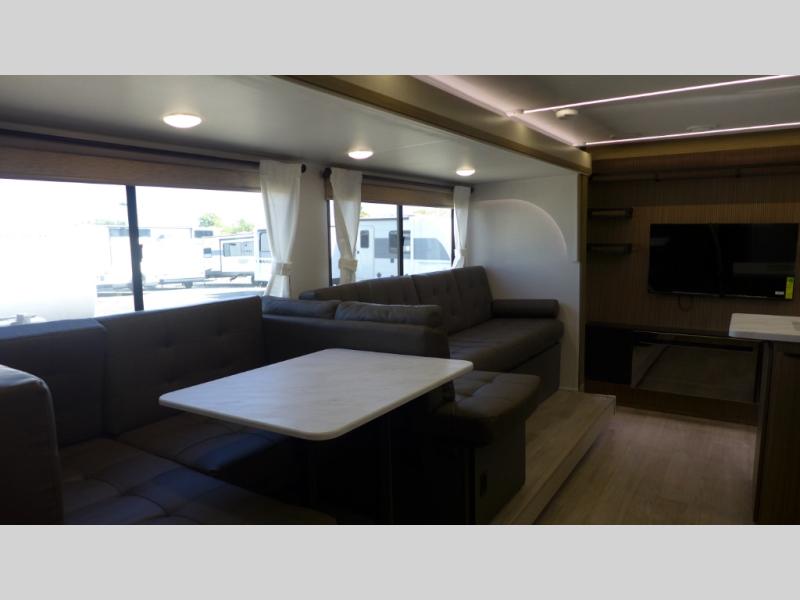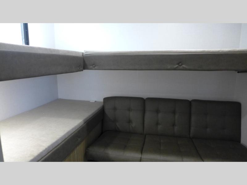 This versatile bunkhouse travel trailer is big enough for the whole family! The private bunkhouse has a set of 30" x 74" bunk beds and a 30" x 74" bunk bed above a Jiffy sofa. Just outside the bunkhouse is a pantry big enough to store everyone's favorite snacks, and a full bathroom with a walk-in shower. The cooktop is just waiting for you to create a delicious meal, and the U-shaped dinette welcomes everyone to enjoy each meal in comfort, plus there is a large panoramic window for a perfect view of your surroundings. Any time of day kick back on the Versa-lounge and relax by the fireplace at the entertainment center. The exterior features a pass-through storage area for you to keep your outdoor camping gear stowed away when not in use, a 16' awning to protect you, and an exterior camp kitchen!