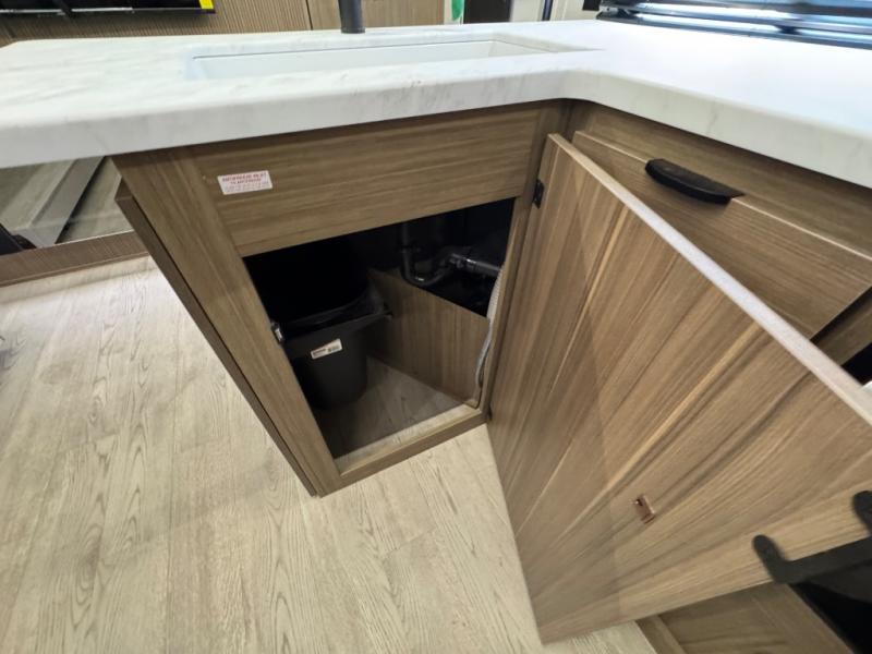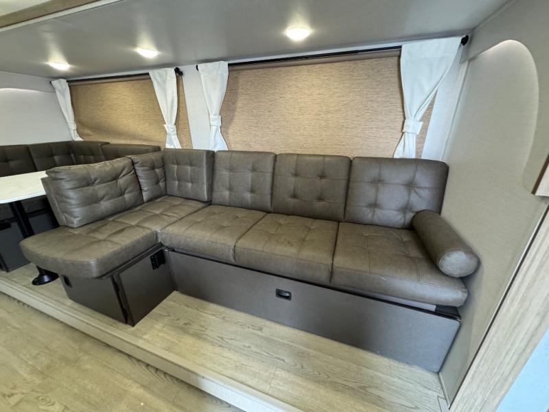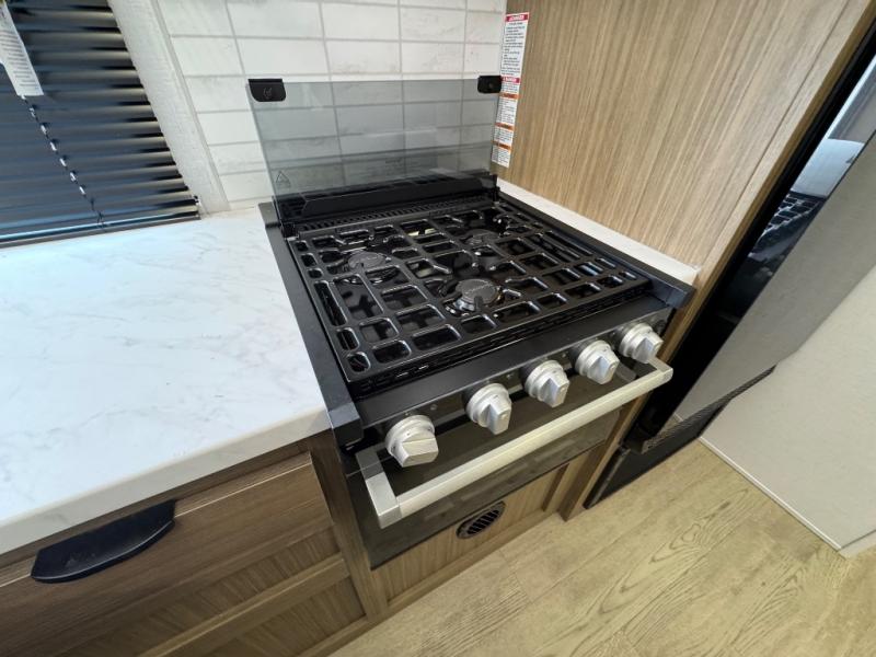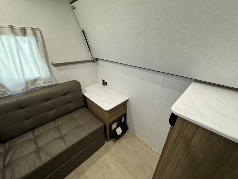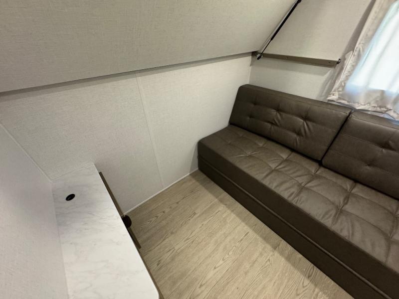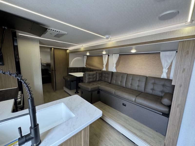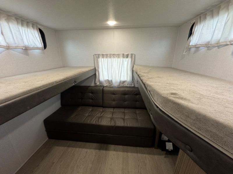 This travel trailer is new to the lineup and offers a large amount of versatility! The rear private bunkhouse has two 30" x 74" Versa-bunks and a Versa-queen bed so that more can join in on the camping fun. Start each morning feeling clean and fresh after showering in the walk-in shower with fiberglass surround then head to the front private bedroom to change. The kitchen has an oversized refrigerator to keep your perishables fresh, a cooktop for meals, and a U-shaped dinette for dining, game time, or just hanging out.