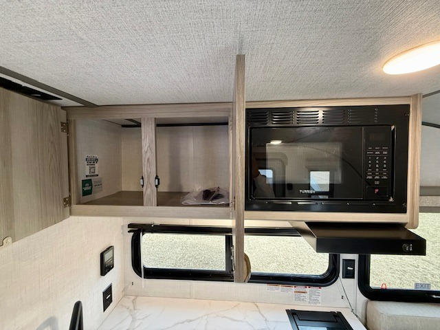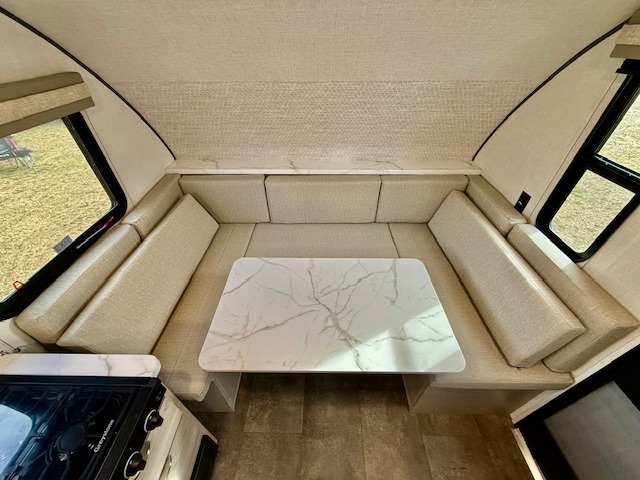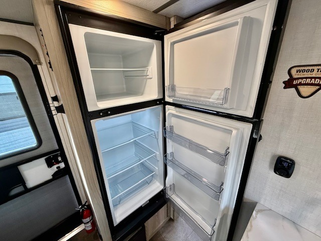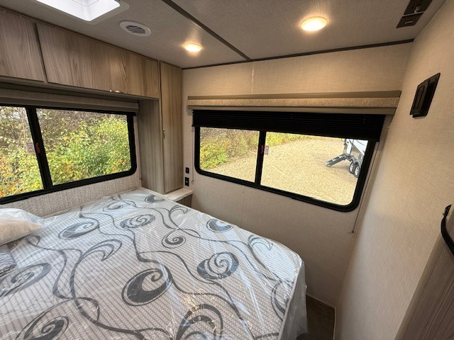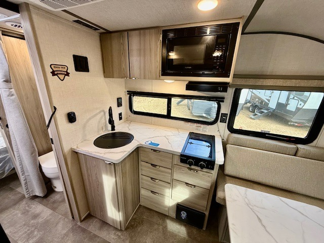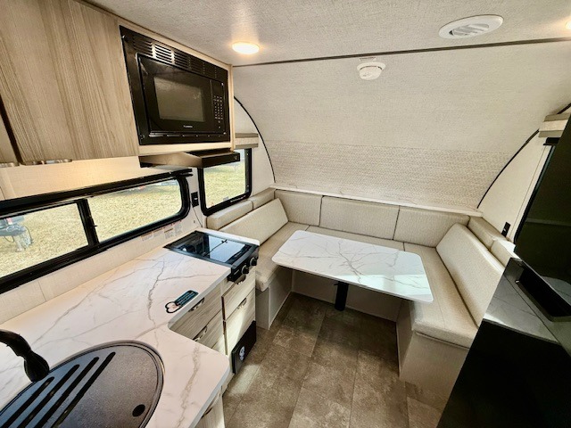 You will love this cozy travel trailer for all your camping needs! There is a front U-shaped dinette that will convert to a queen-sized bed at night, and the rear master bedroom includes a queen bed as well! The split style bath will be easily accessible for everyone, and there is plenty of storage space for all your gear, both inside and out! The kitchen comes with a two burner cooktop and microwave oven, plus a dual swinging 12V refrigerator for food storage. There is also an outside kitchen for breakfast outdoors, a high capacity axle for easy towing, and dual Group 24 battery trays for extended camping power!