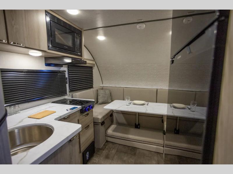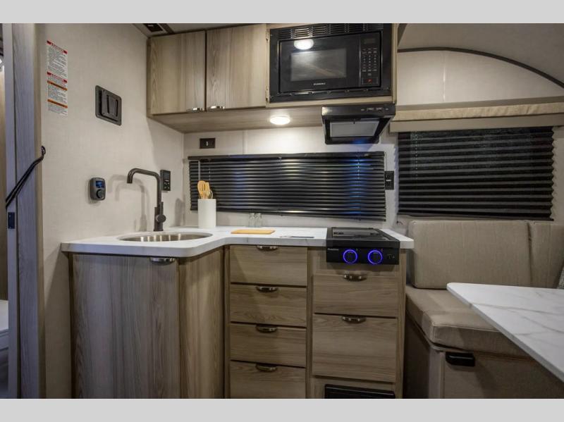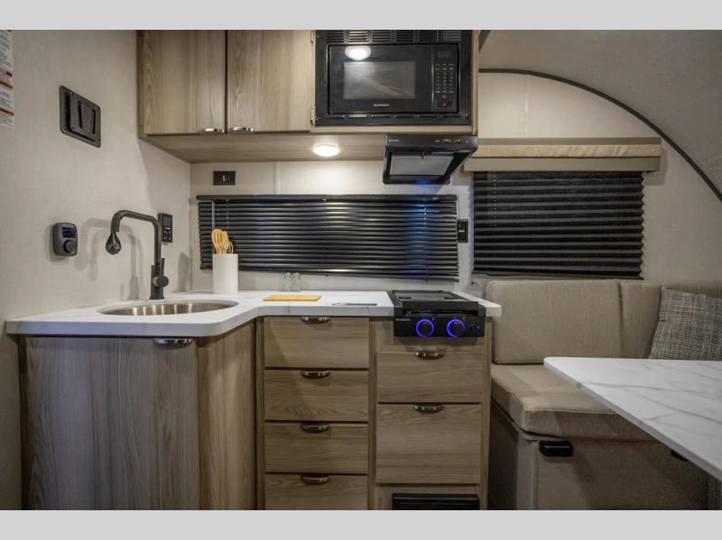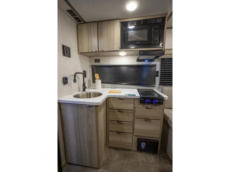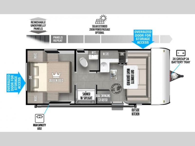 You will love this cozy travel trailer for all your camping needs! There is a front U-shaped dinette that will convert to a queen-sized bed at night, and the rear master bedroom includes a queen bed as well! The split style bath will be easily accessible for everyone, and there is plenty of storage space for all your gear, both inside and out! The kitchen comes with a two burner cooktop and microwave oven, plus a dual swinging 12V refrigerator for food storage. There is also an outside kitchen for breakfast outdoors, a high capacity axle for easy towing, and dual Group 24 battery trays for extended camping power!